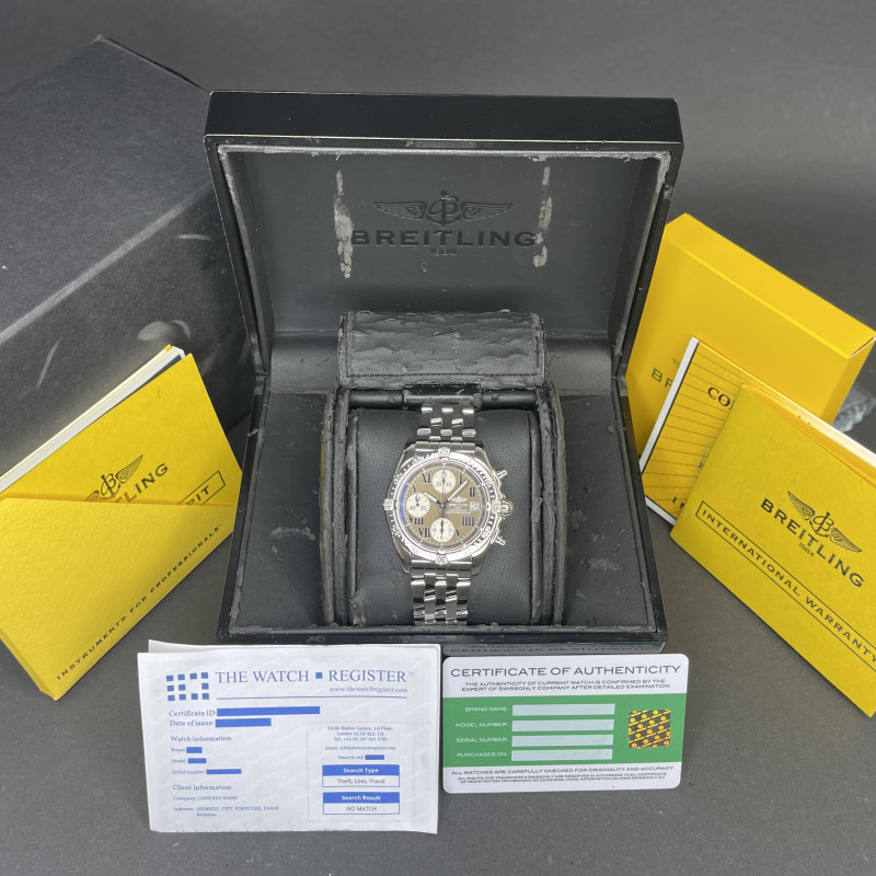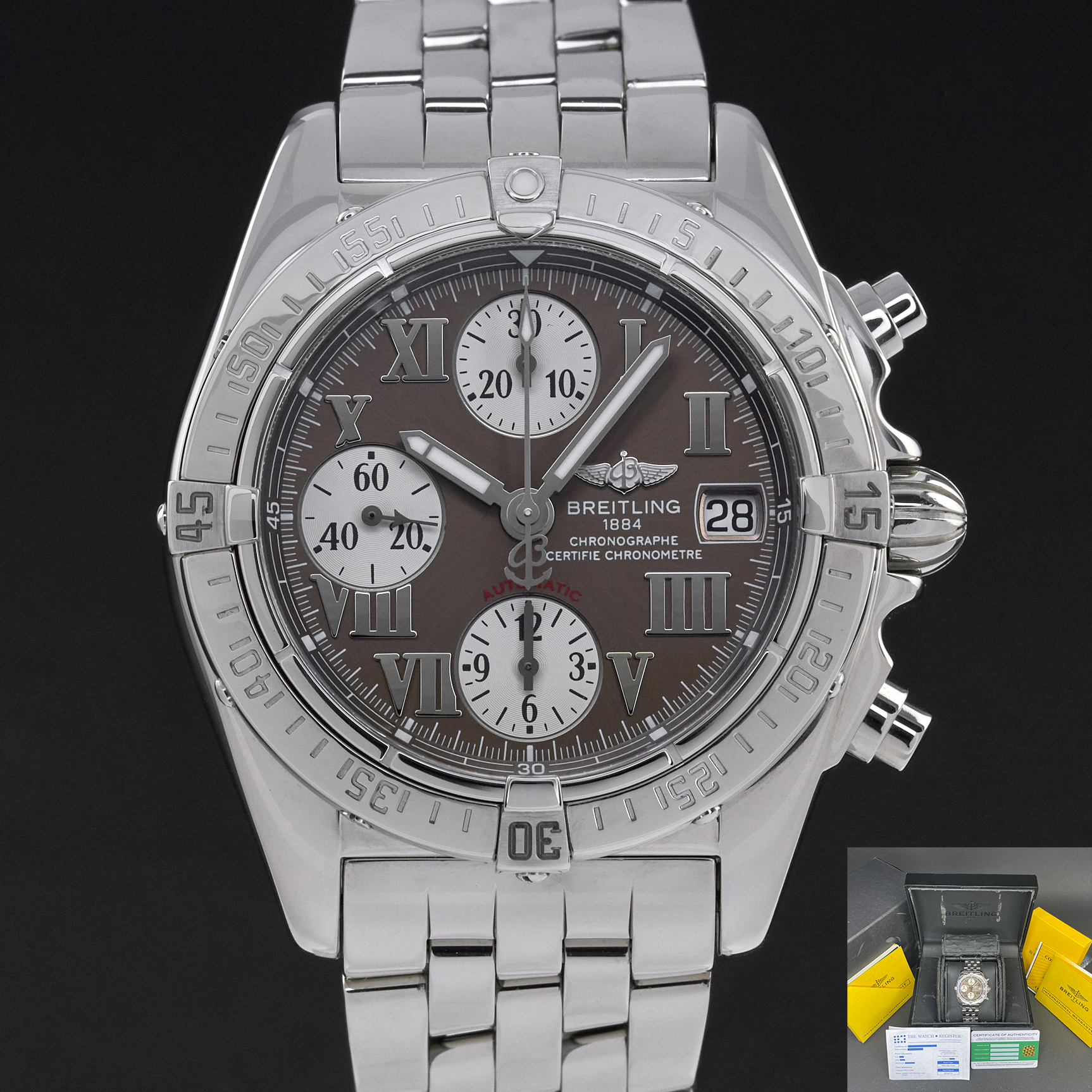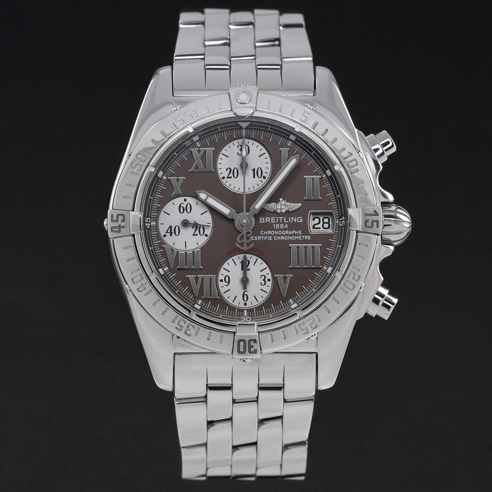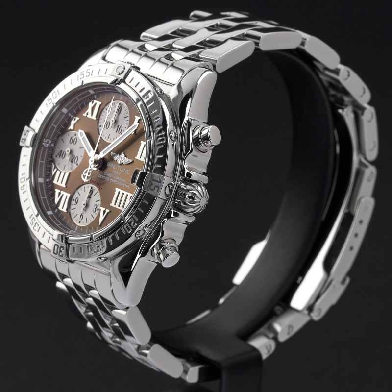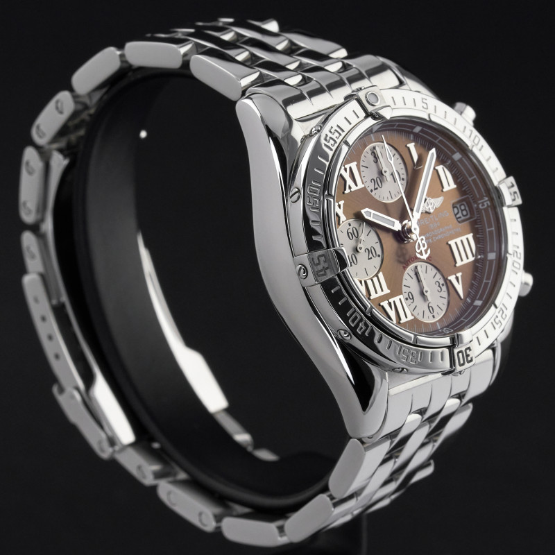 This Breitling Chrono Cockpit A13358 features a Bronze Roman dial and is crafted from stainless steel.
