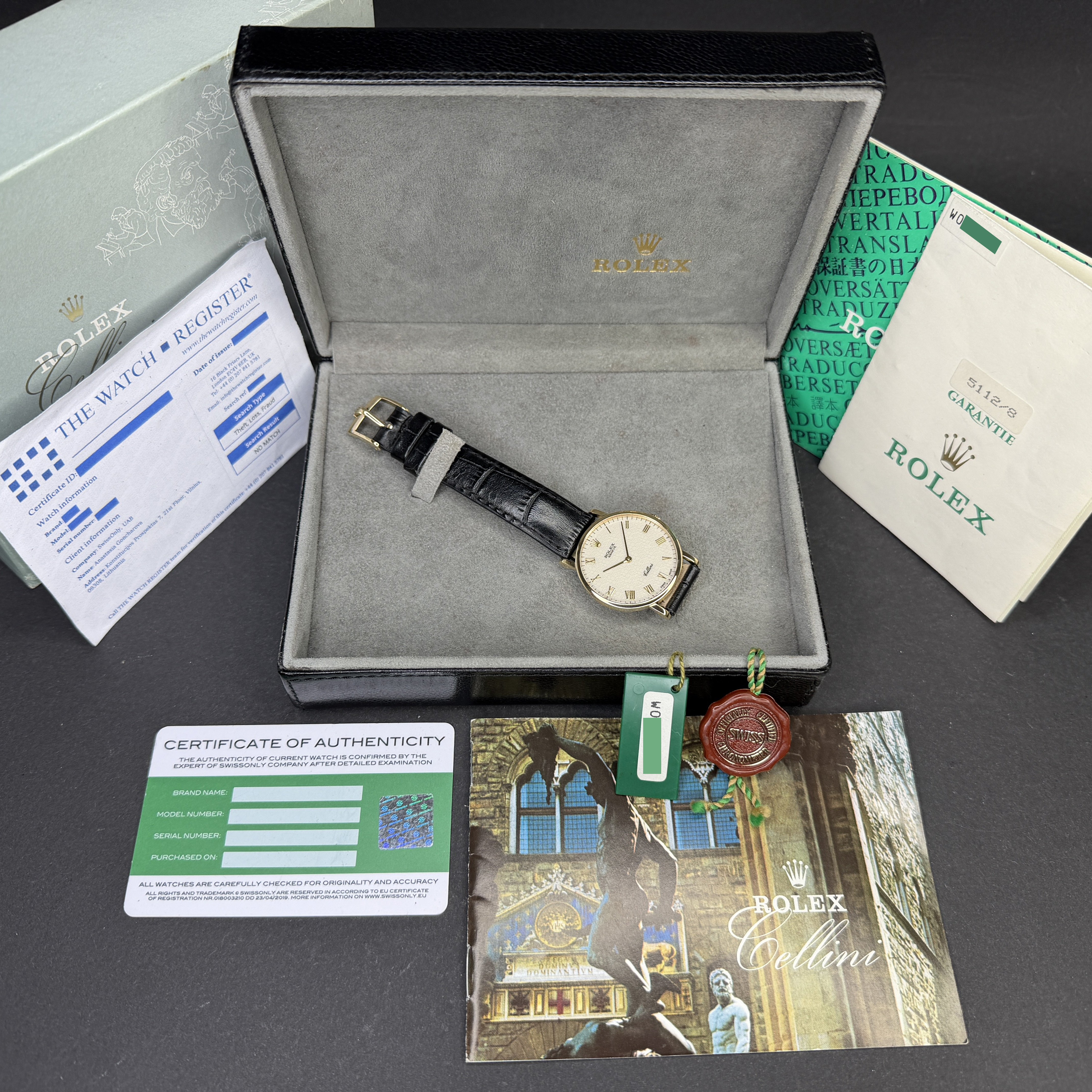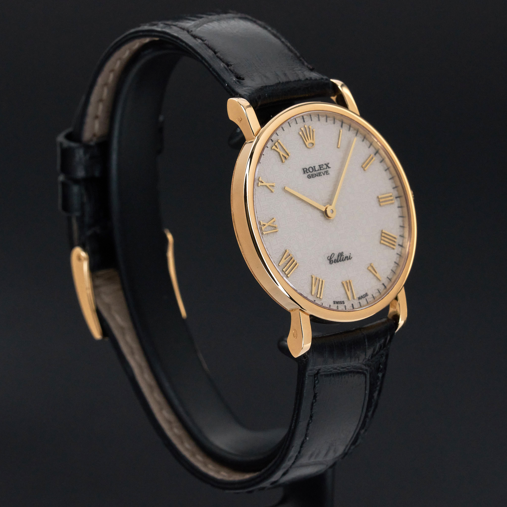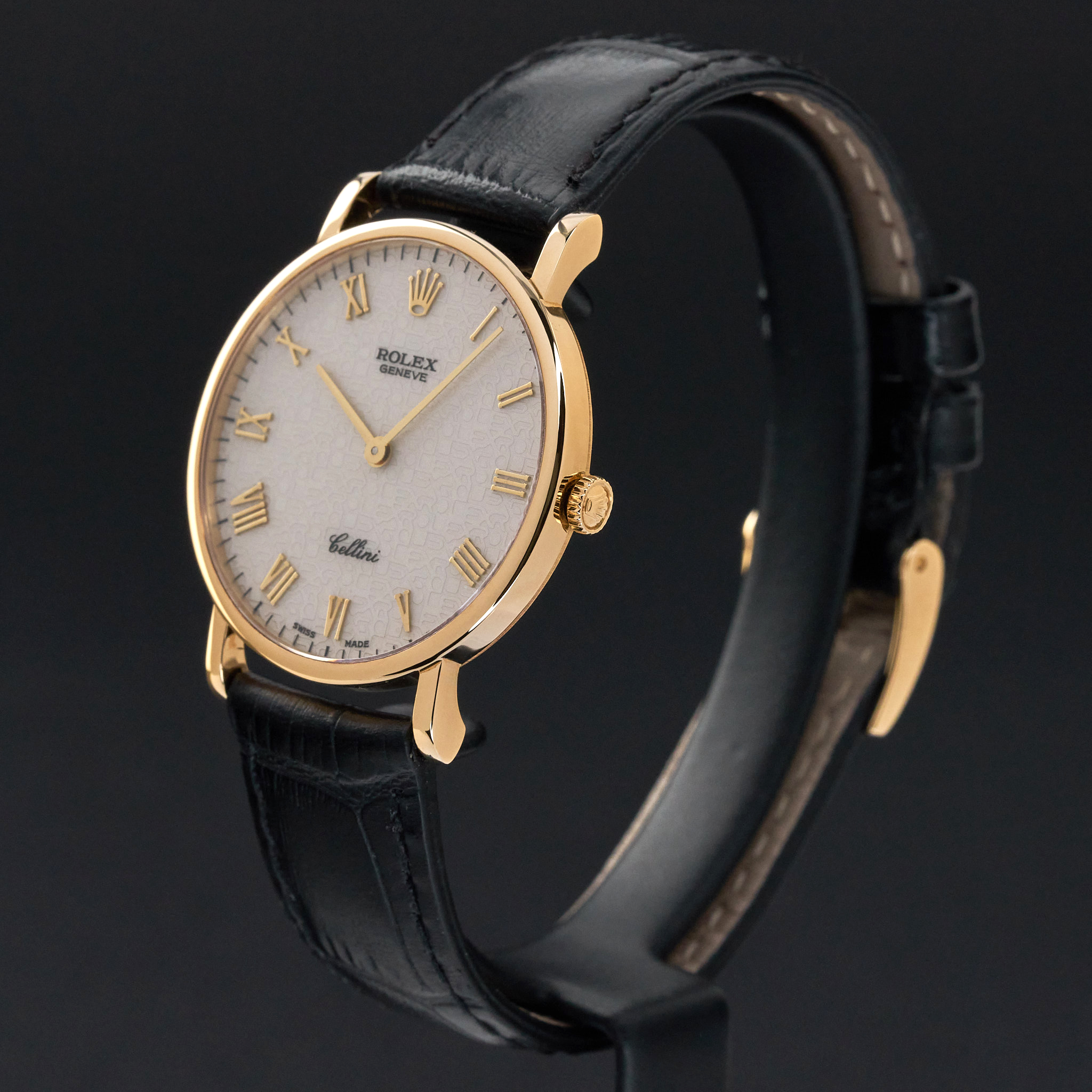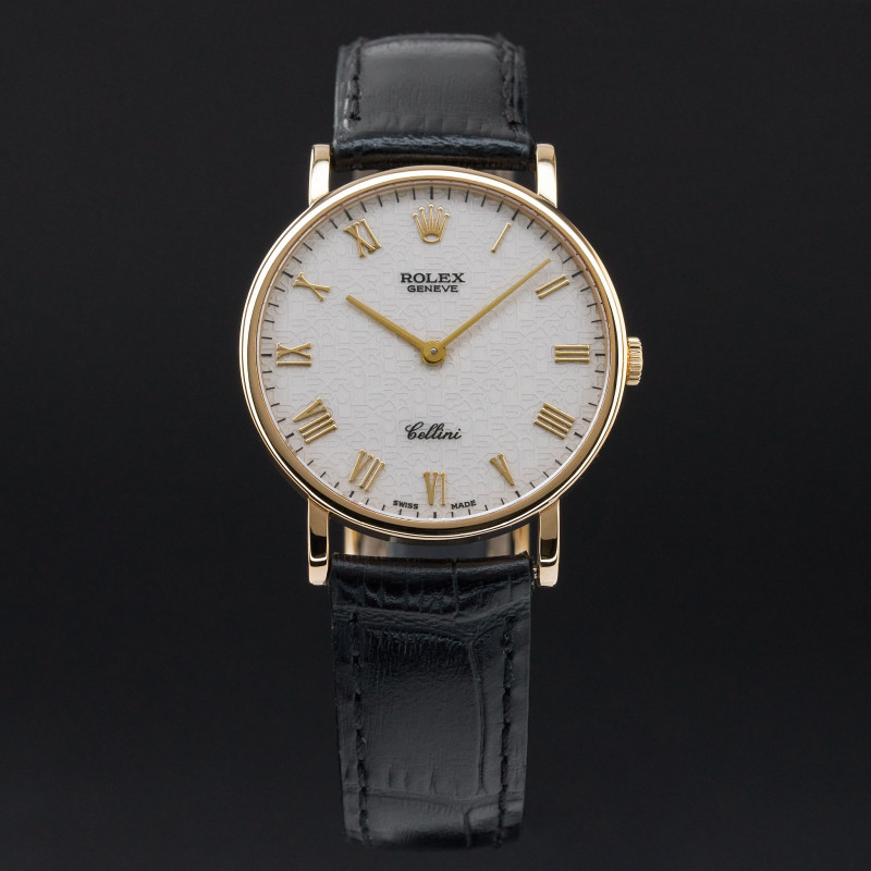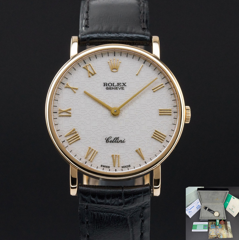 This Rolex Cellini 5112 features an Ivory jubilee Roman dial and is crafted from 18K yellow gold, with a production year of 1995.
