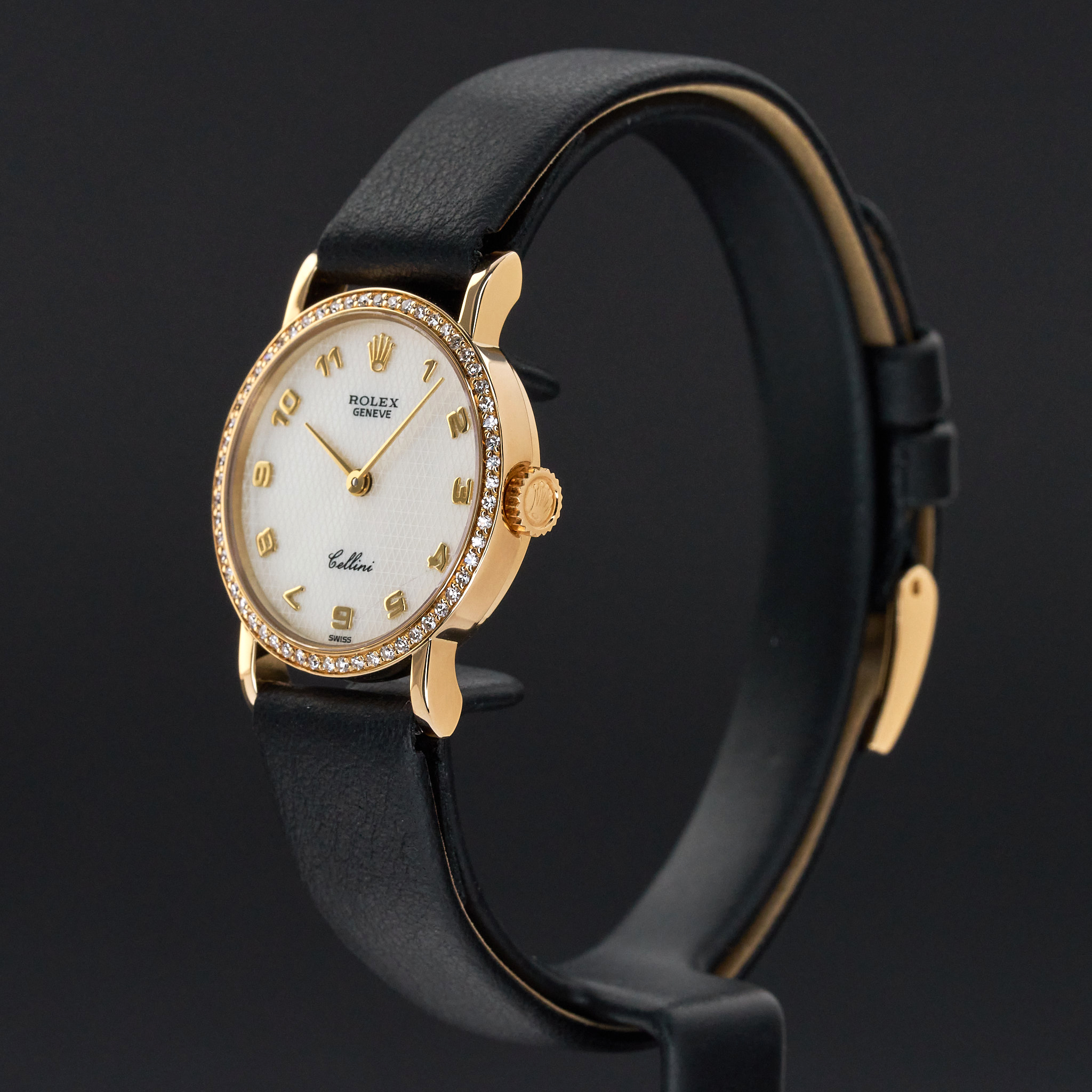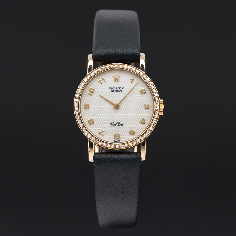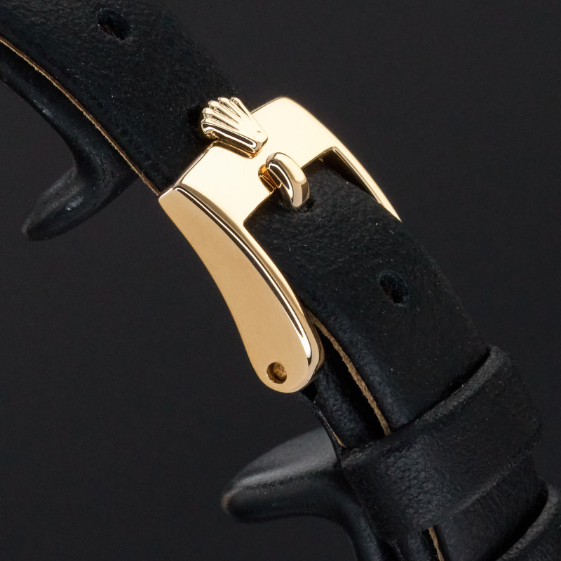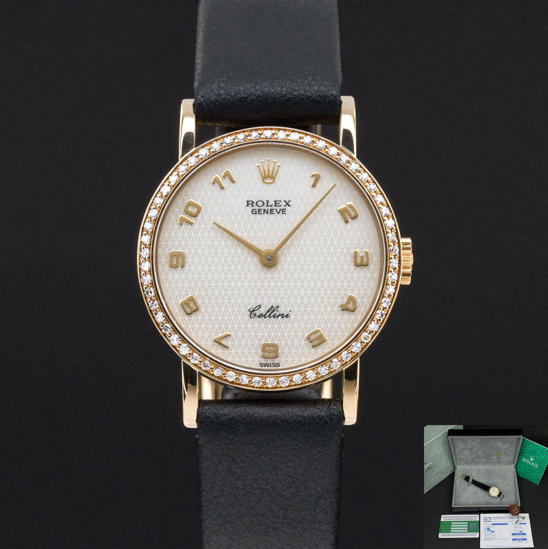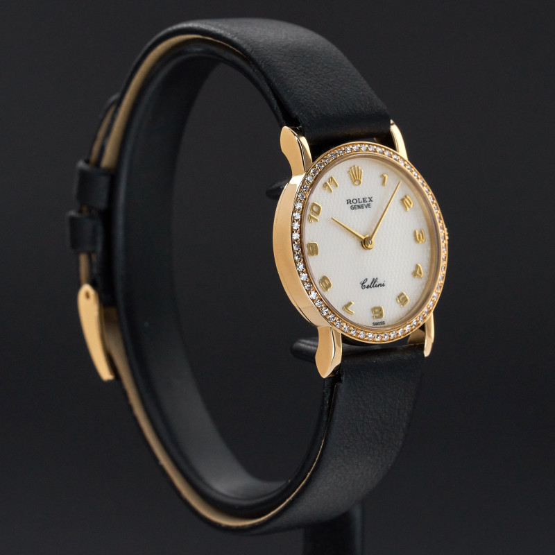 This Rolex Cellini 5113 features a Mother of Pearl Arabic dial and is crafted from 18K yellow gold, with a production year of 1995.