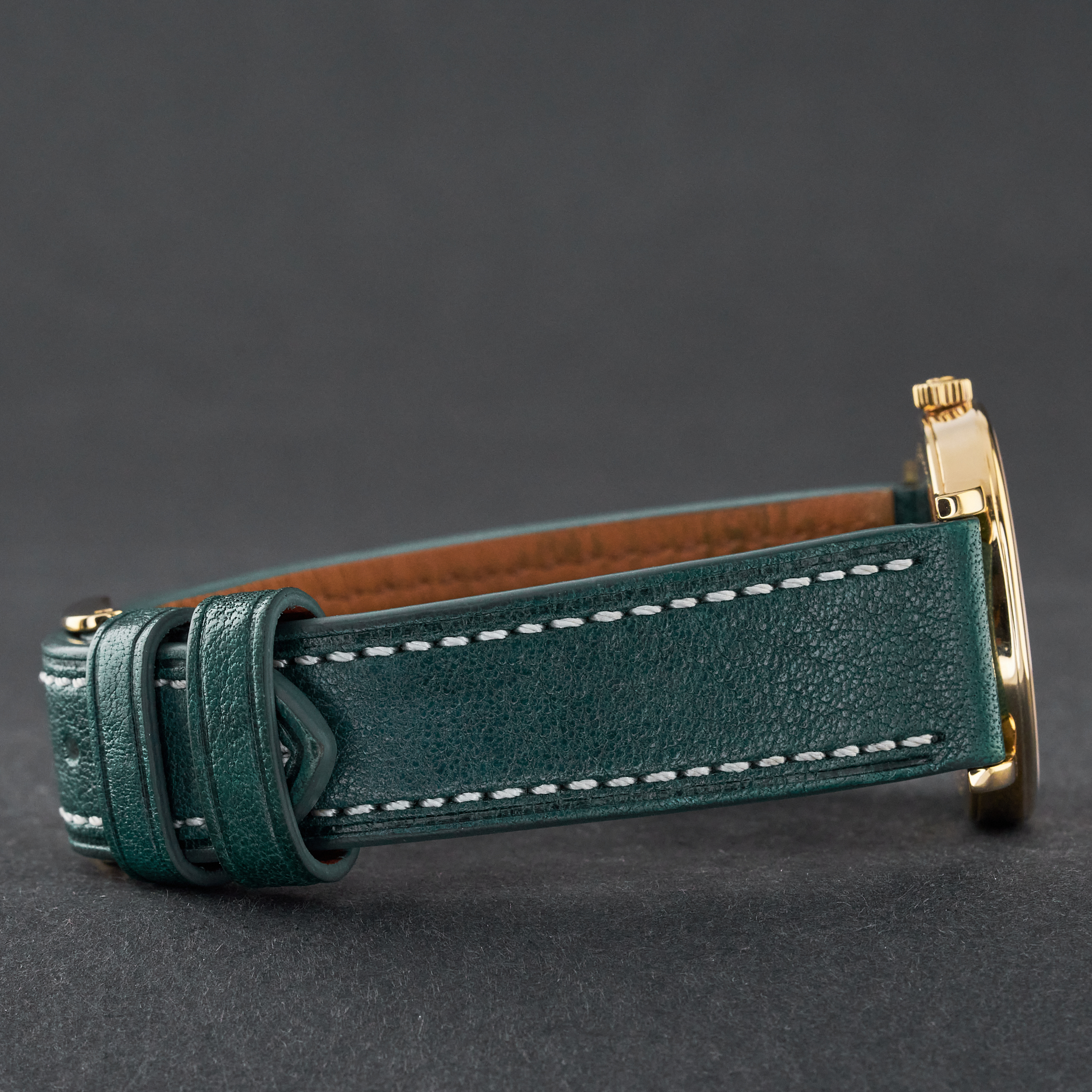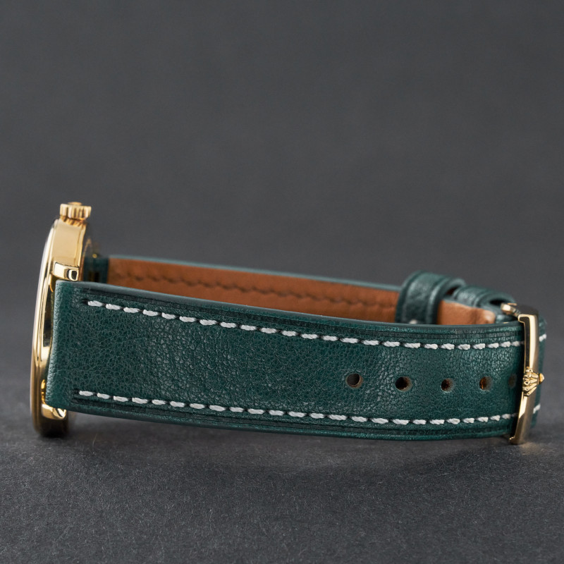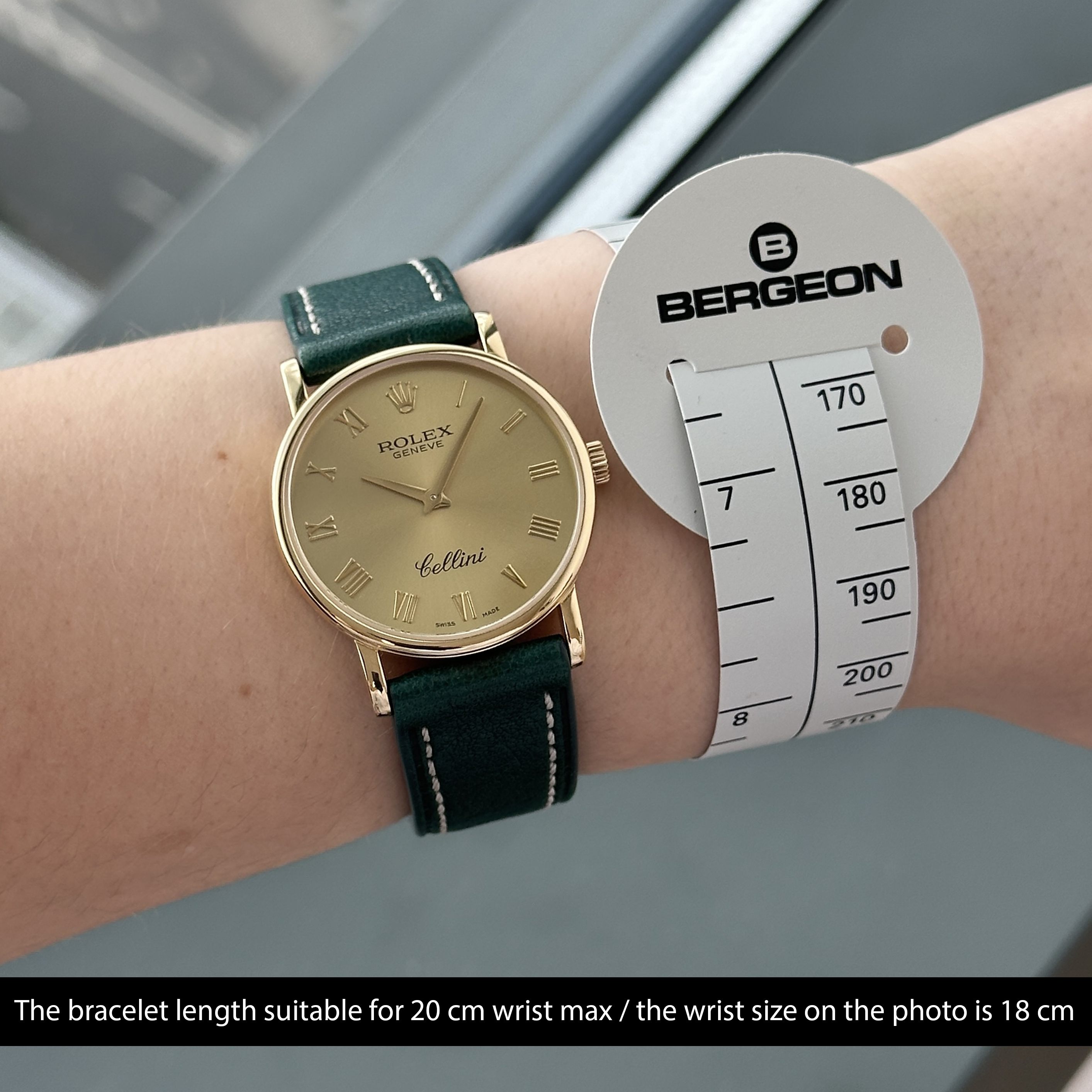 This particular Rolex Cellini introduced in 2008, stands as a refined symbol of traditional elegance. It's champagne dial, adorned with Roman numerals, brings warmth and vintage charm to the minimalist design. The clean layout emphasizes symmetry and clarity, while the polished round case and leather strap complete the watch’s timeless aesthetic.