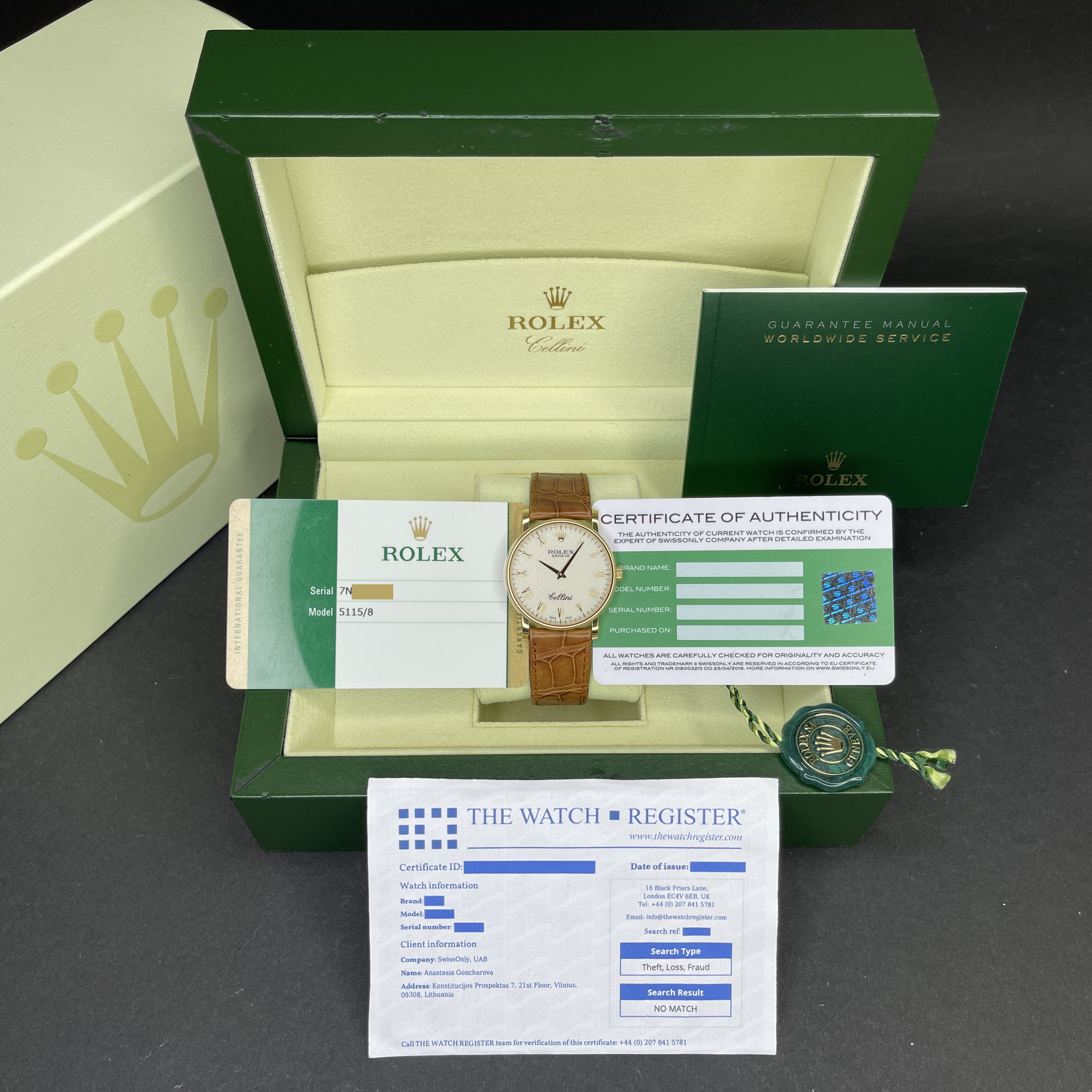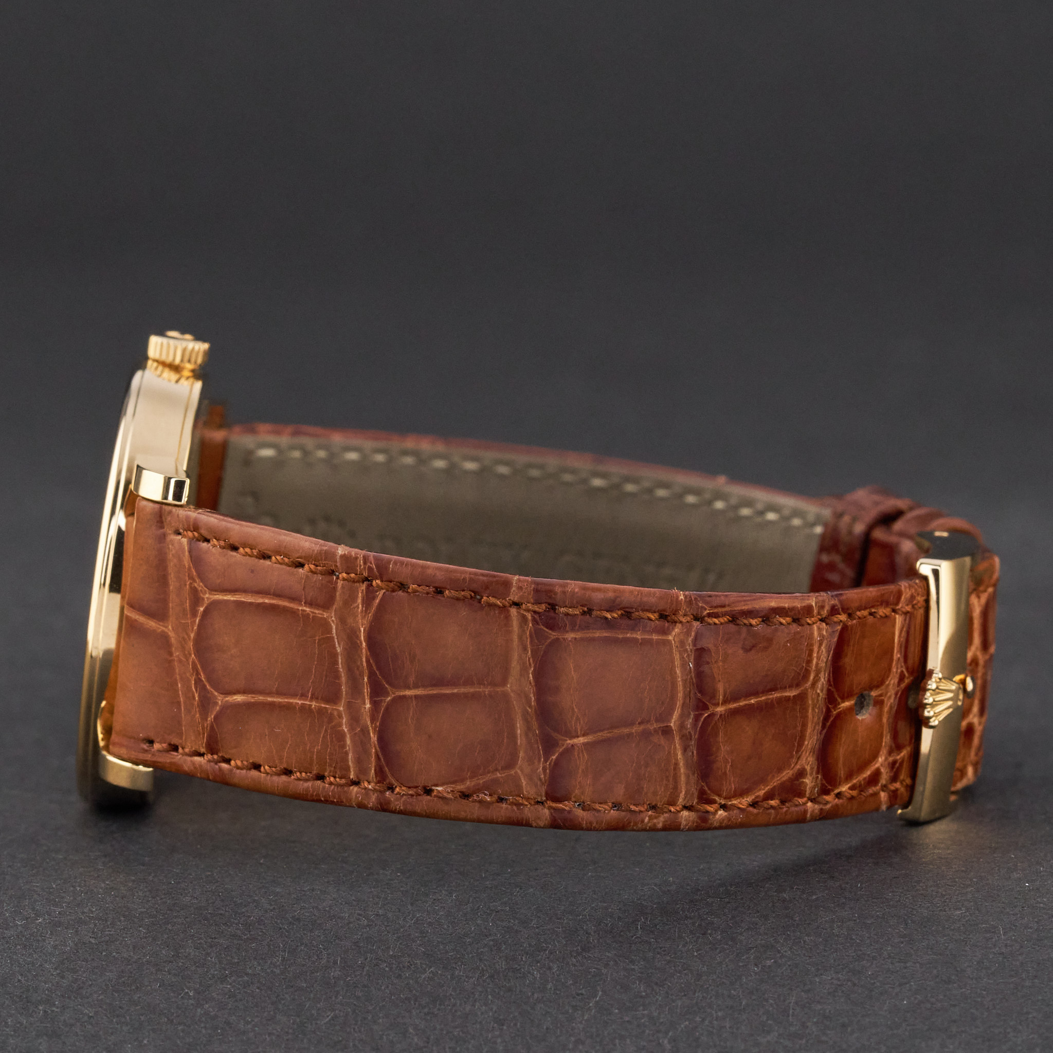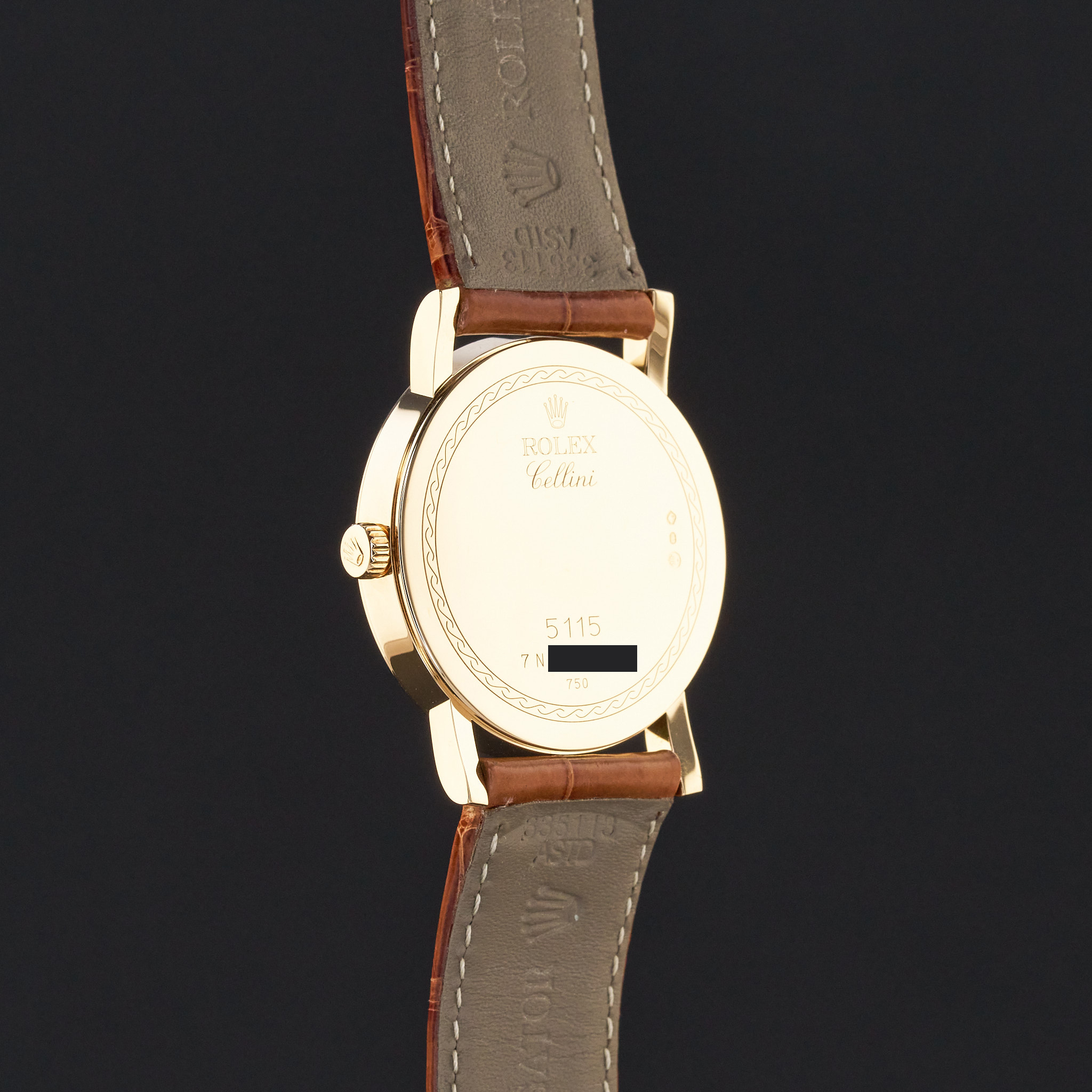 This Rolex Cellini 5115/8 features an Ivory jubilee Roman dial and is crafted from 18K yellow gold, with a production year of 2015.