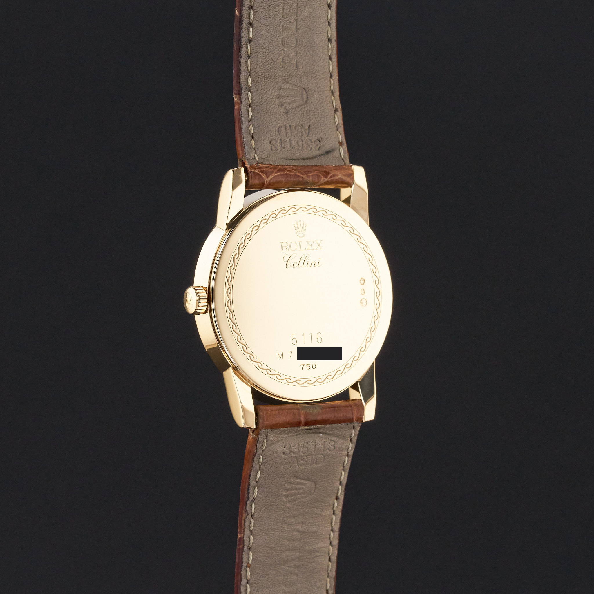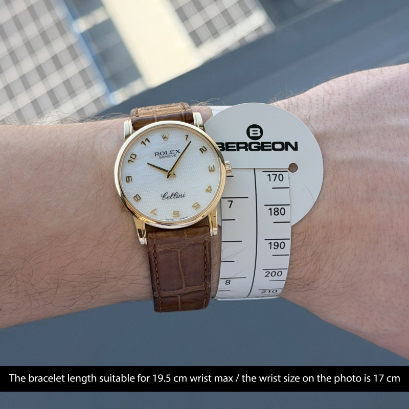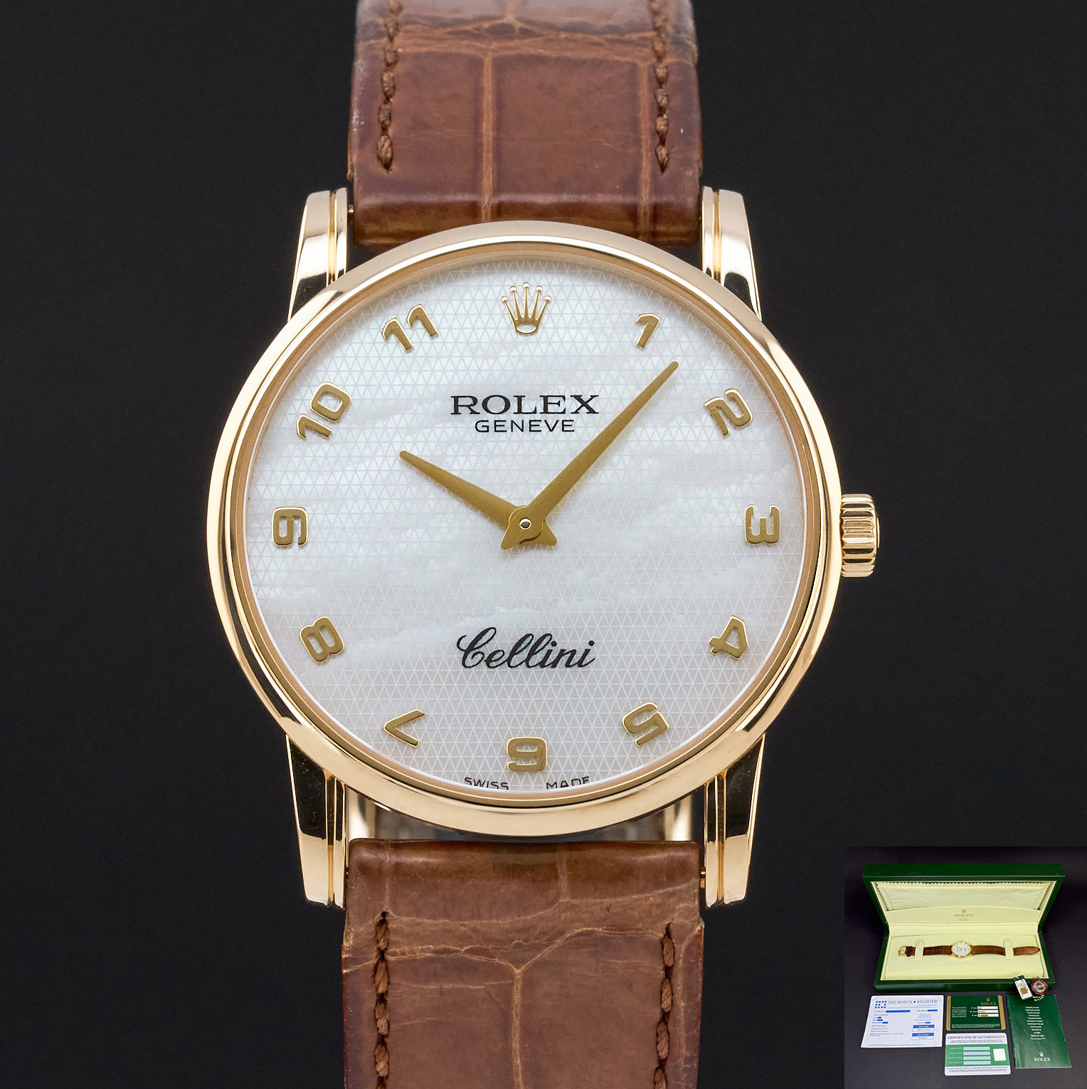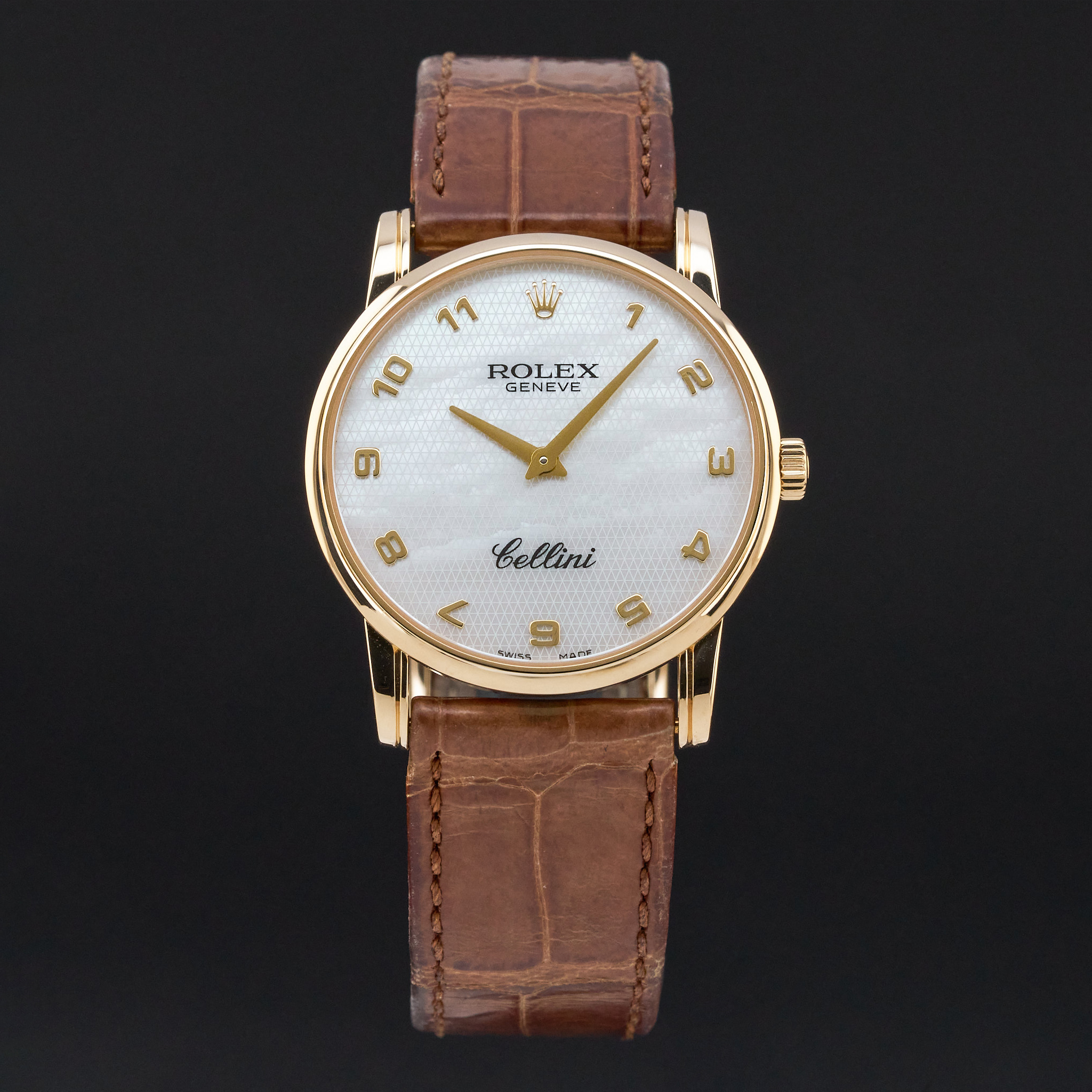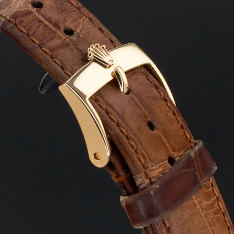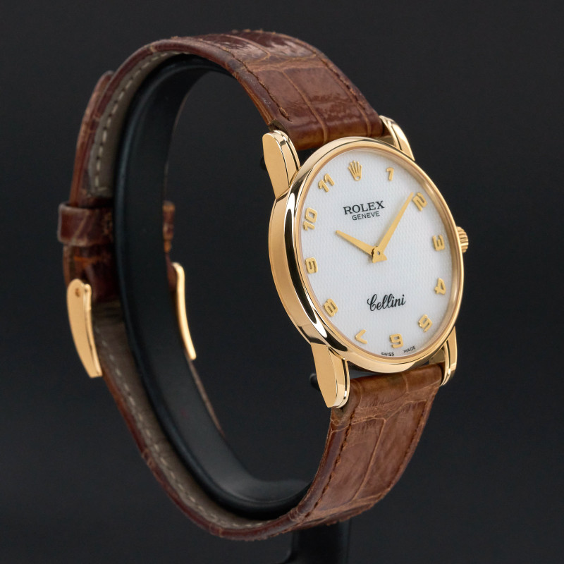 This Rolex Cellini features an Ivory mother of pearl Arabic dial and is crafted from 18K yellow gold, with a production year of 2008.