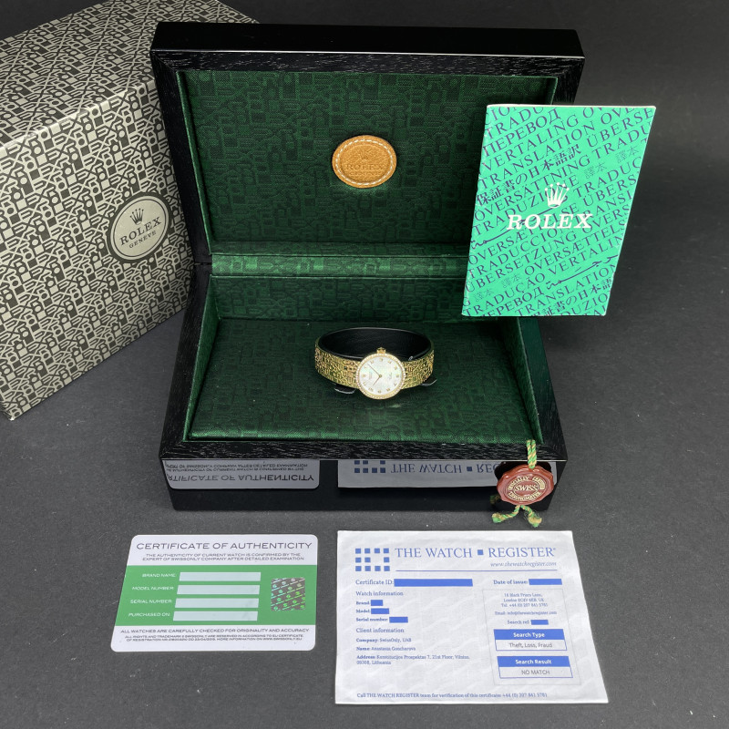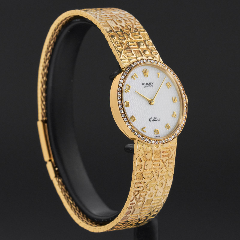 This Rolex Cellini 5133 features a Mother of Pearl Arabic dial and is crafted from 18K yellow gold, with a production year of 1995.