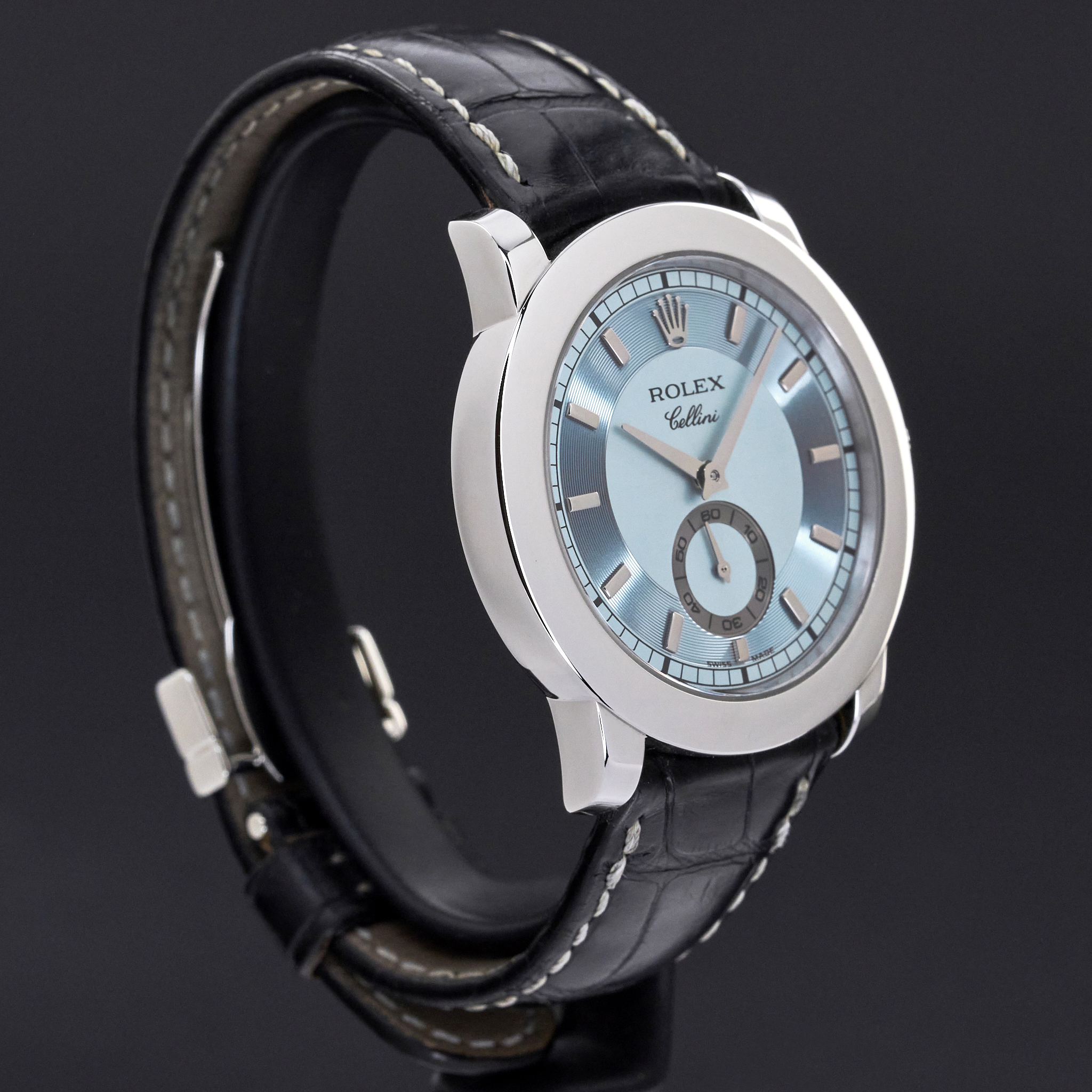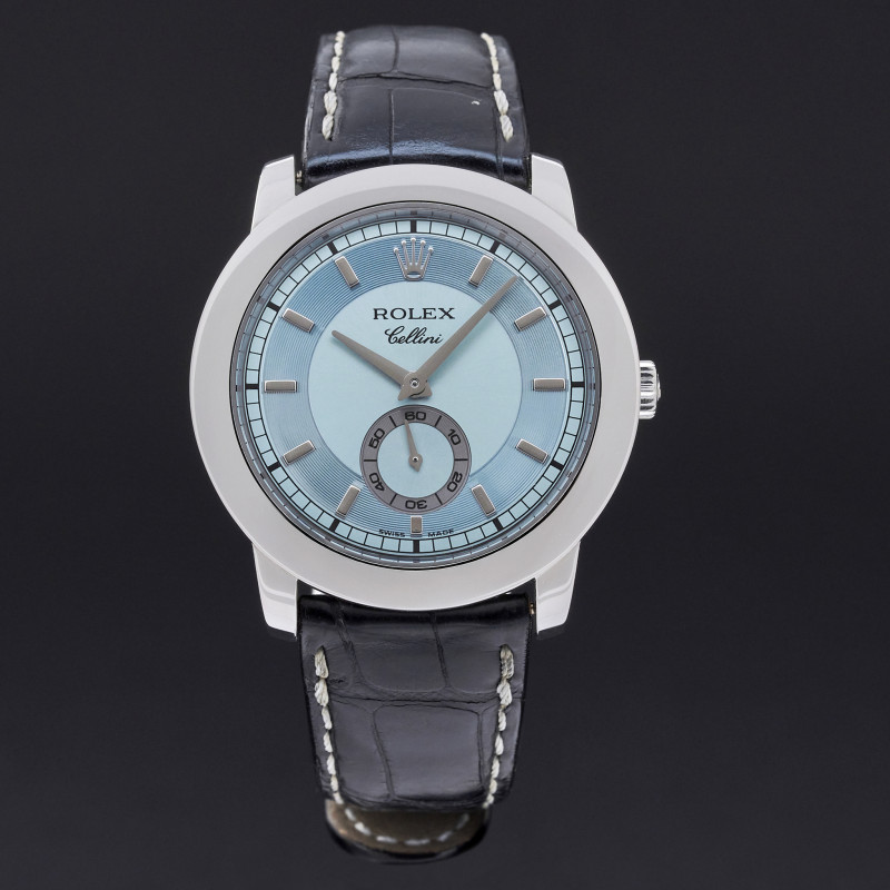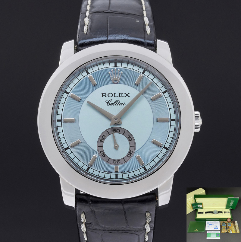 This Rolex Cellini 5241 features a Glacier blue dial and is crafted from platinum, with a production year of 2001.