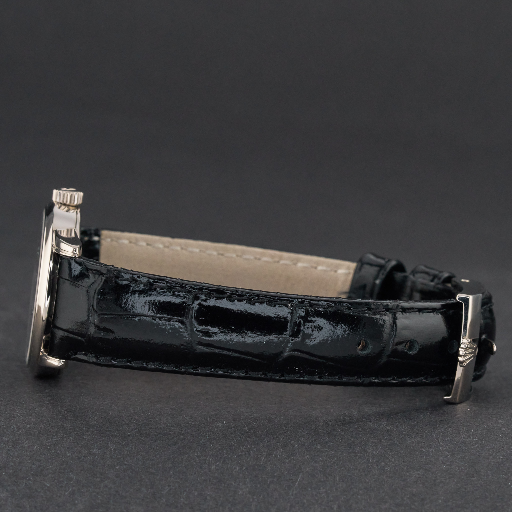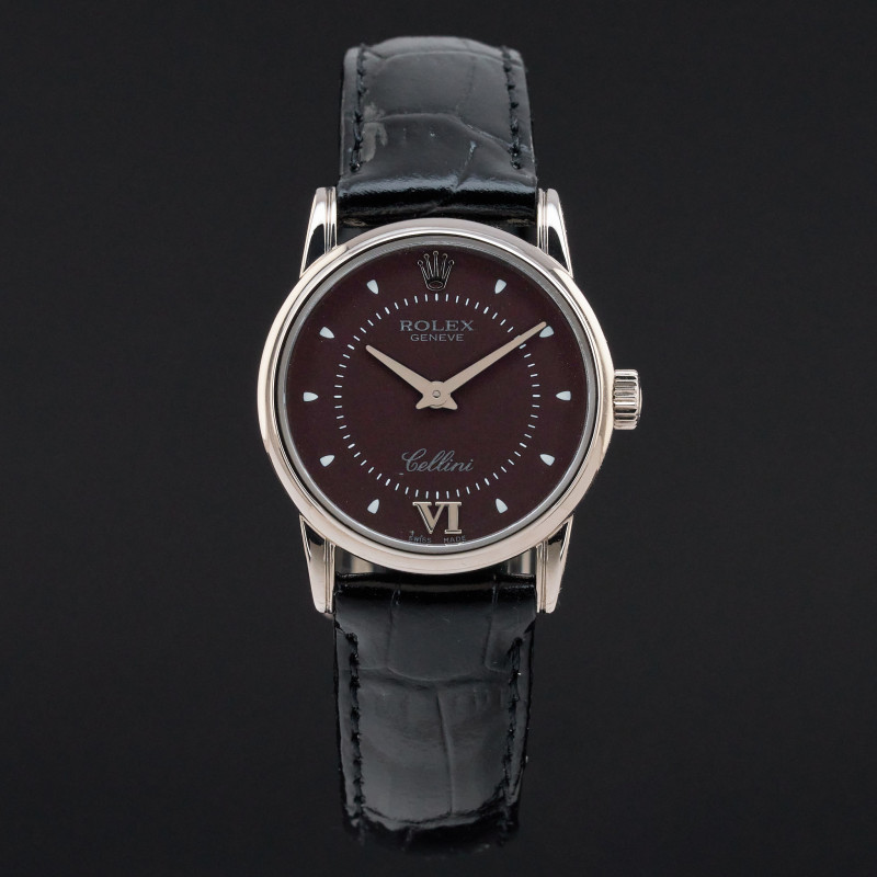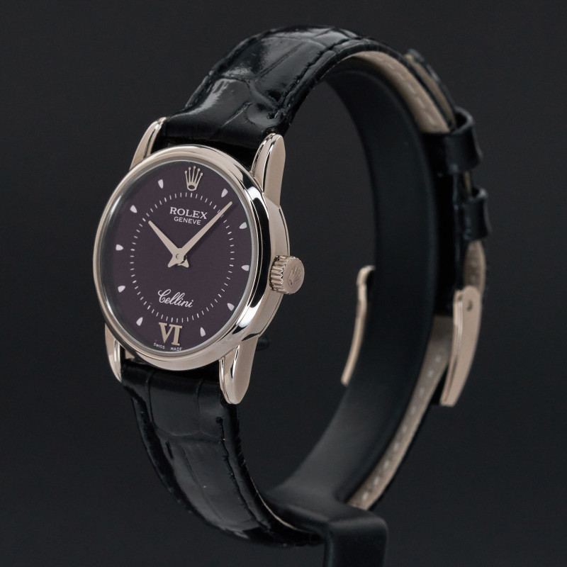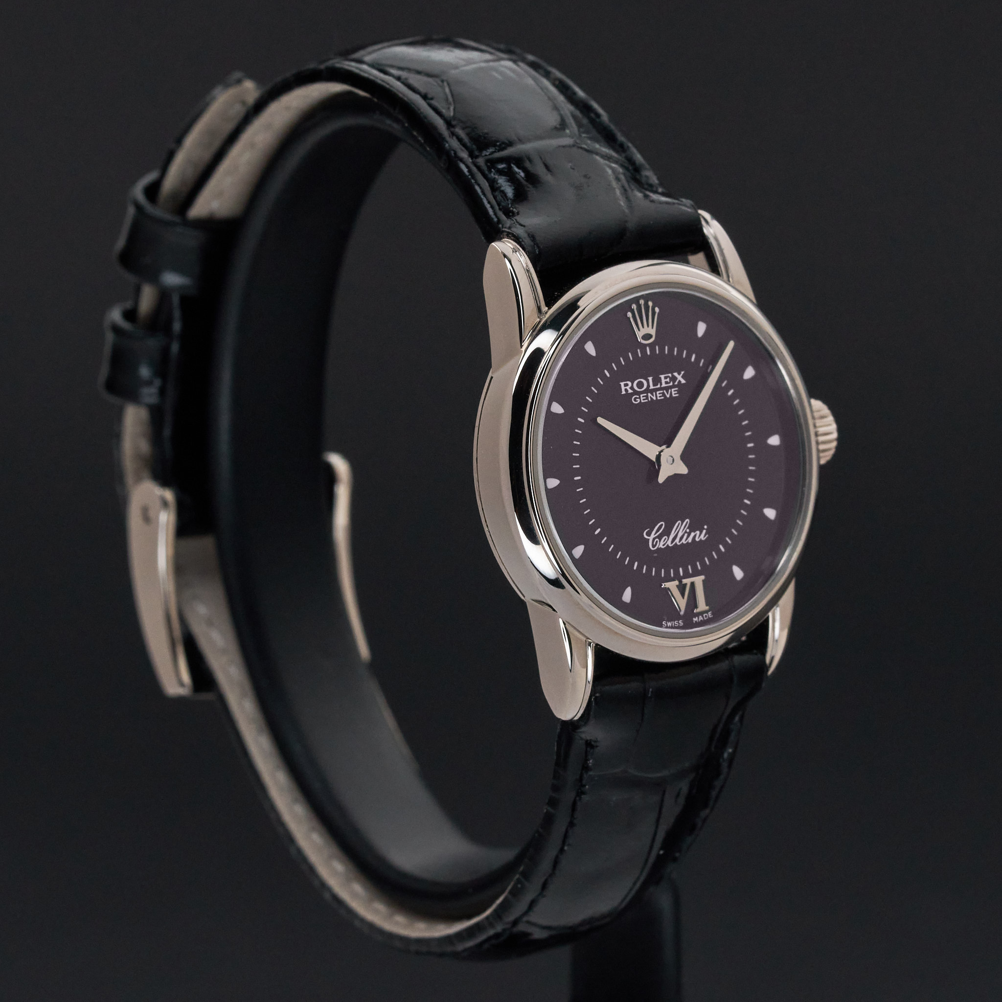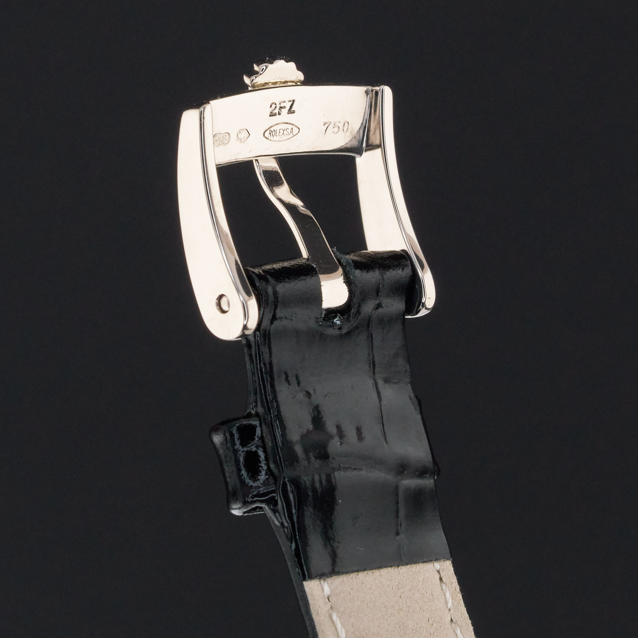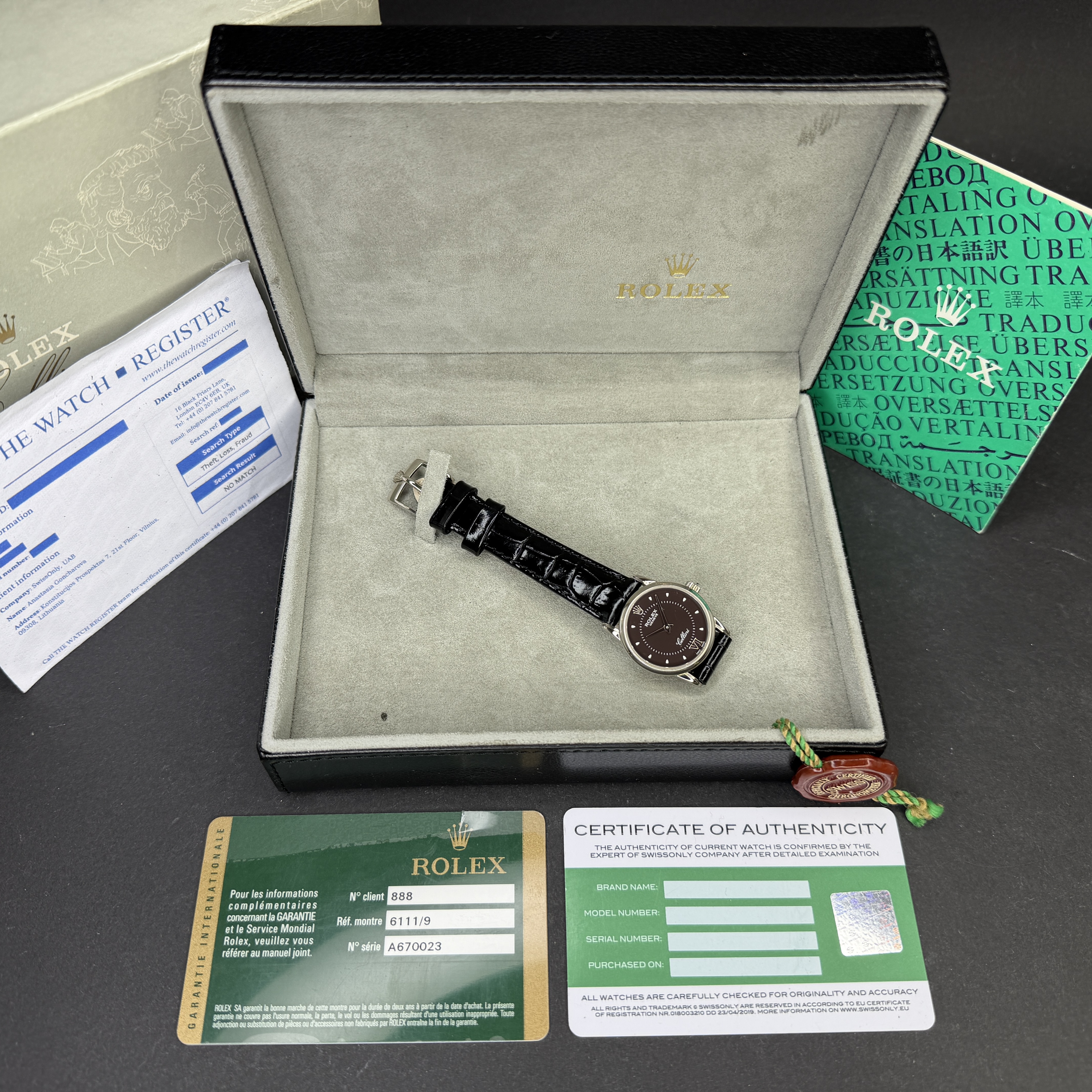 This Rolex Cellini 6111/9 features a Black Roman dial and is crafted from 18K white gold, with a production year of 2011.