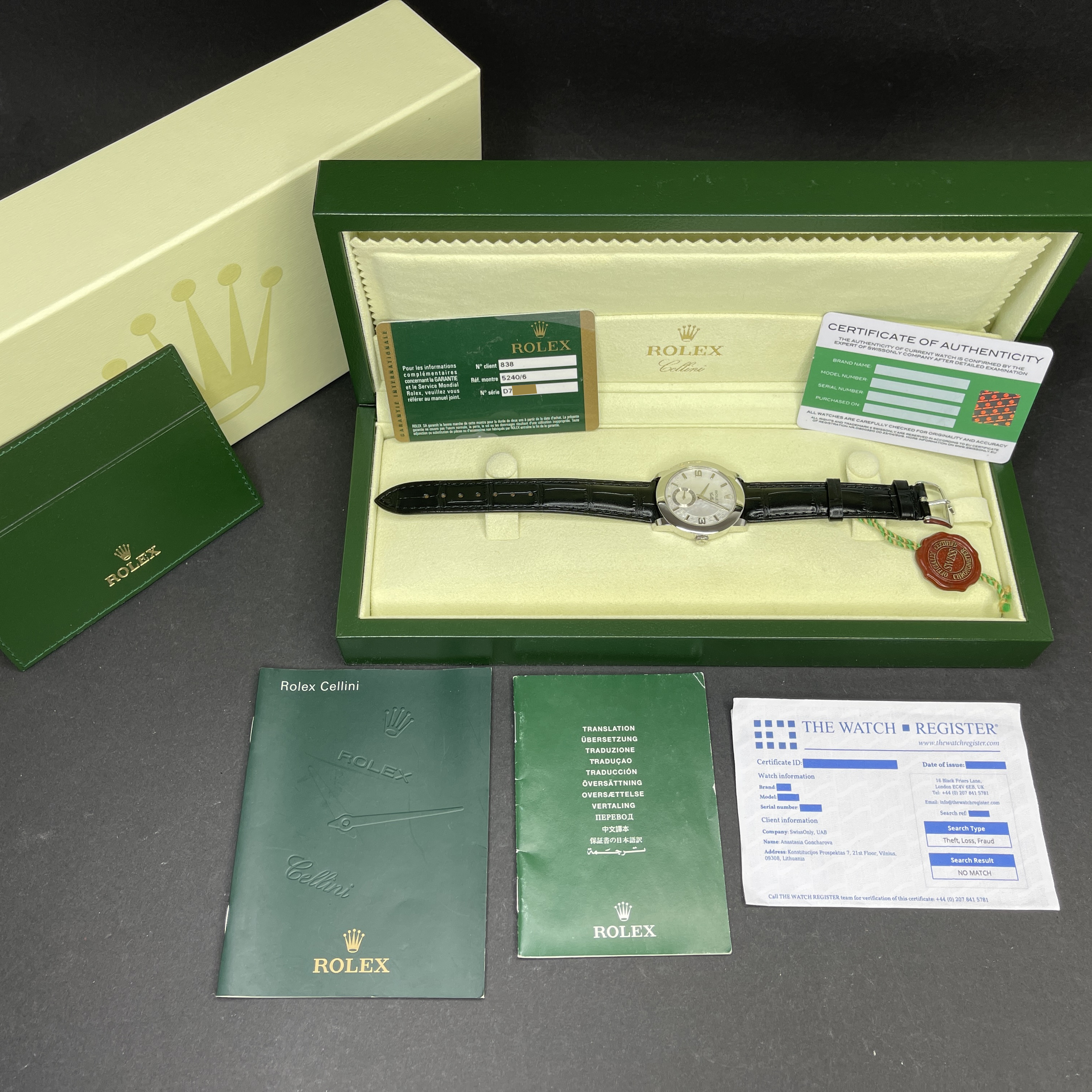This Rolex Cellini Cellinium 5240 features a Mother of Pearl Arabic dial and is crafted from platinum, with a production year of 2005.