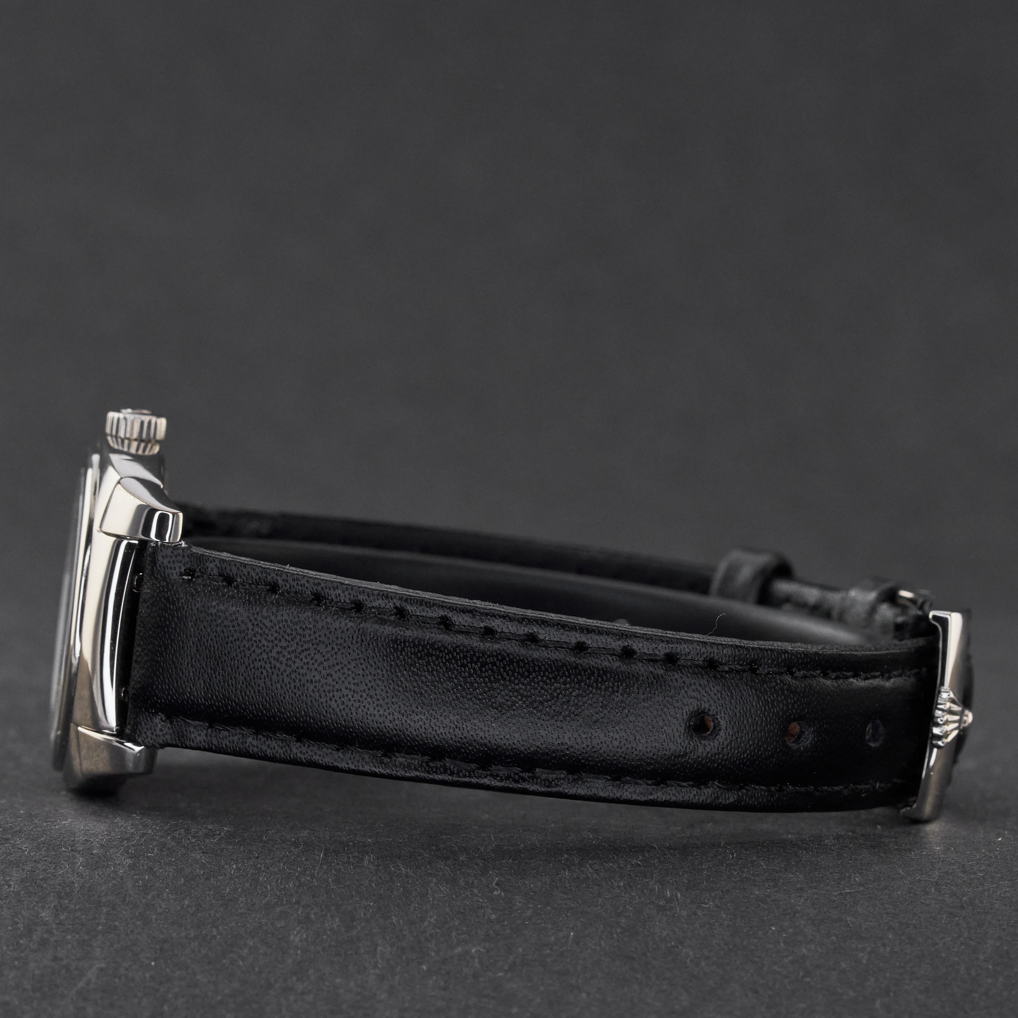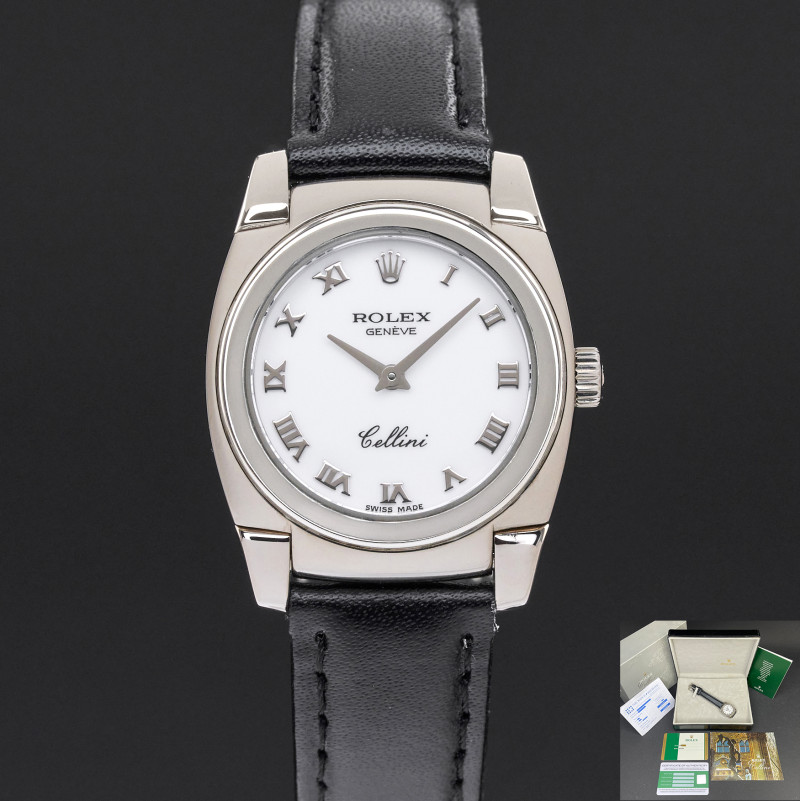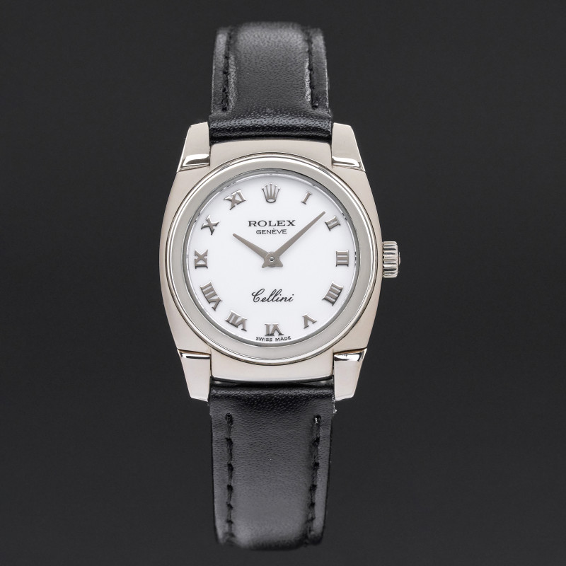This particular Rolex Cellini Cestello introduced in 2001, is a refined tribute to traditional watchmaking, showcasing clean lines and balanced proportions. It's white dial, adorned with timeless Roman numerals, reflects the classical spirit of the Cellini line, while the slim case and polished bezel emphasize elegance in its most restrained form.