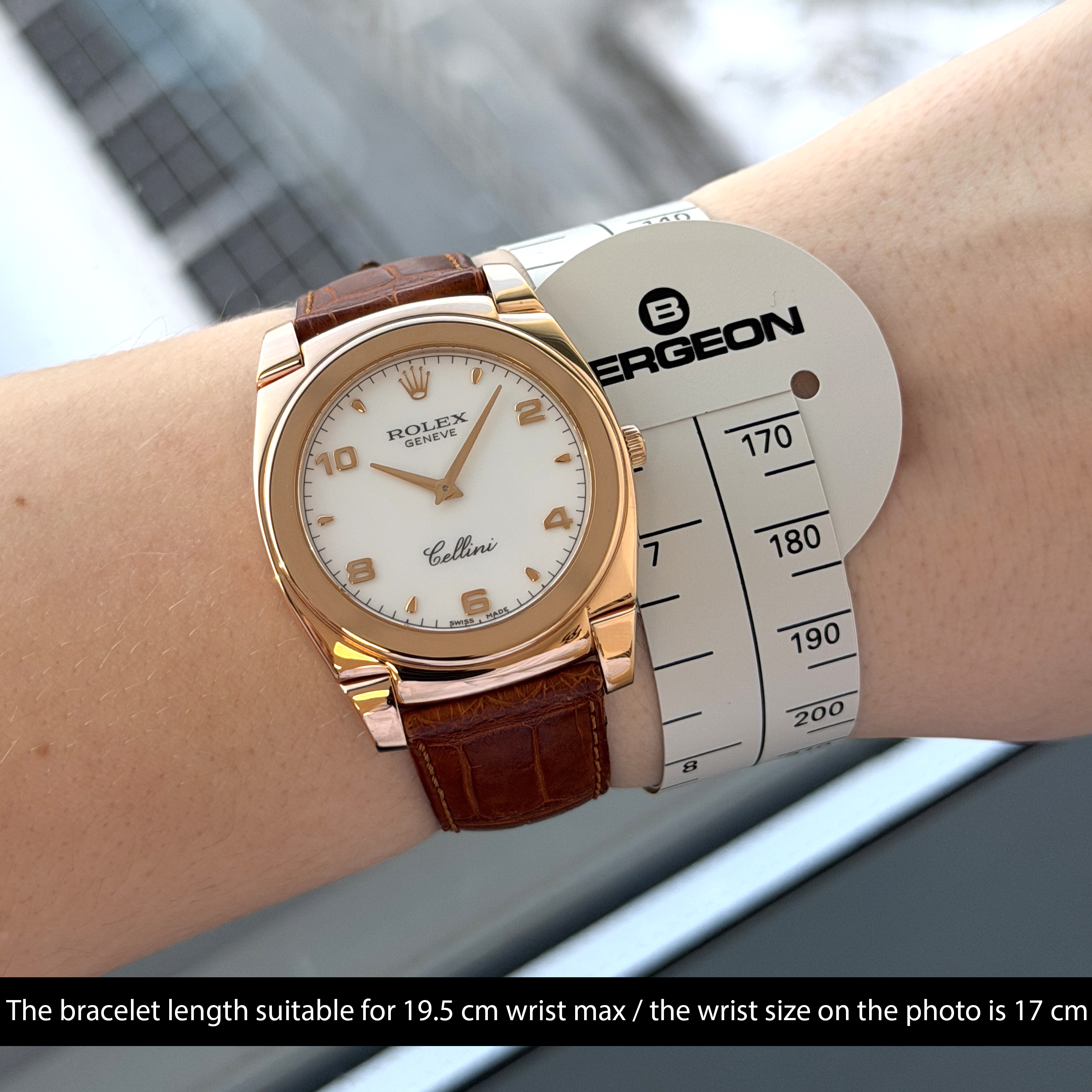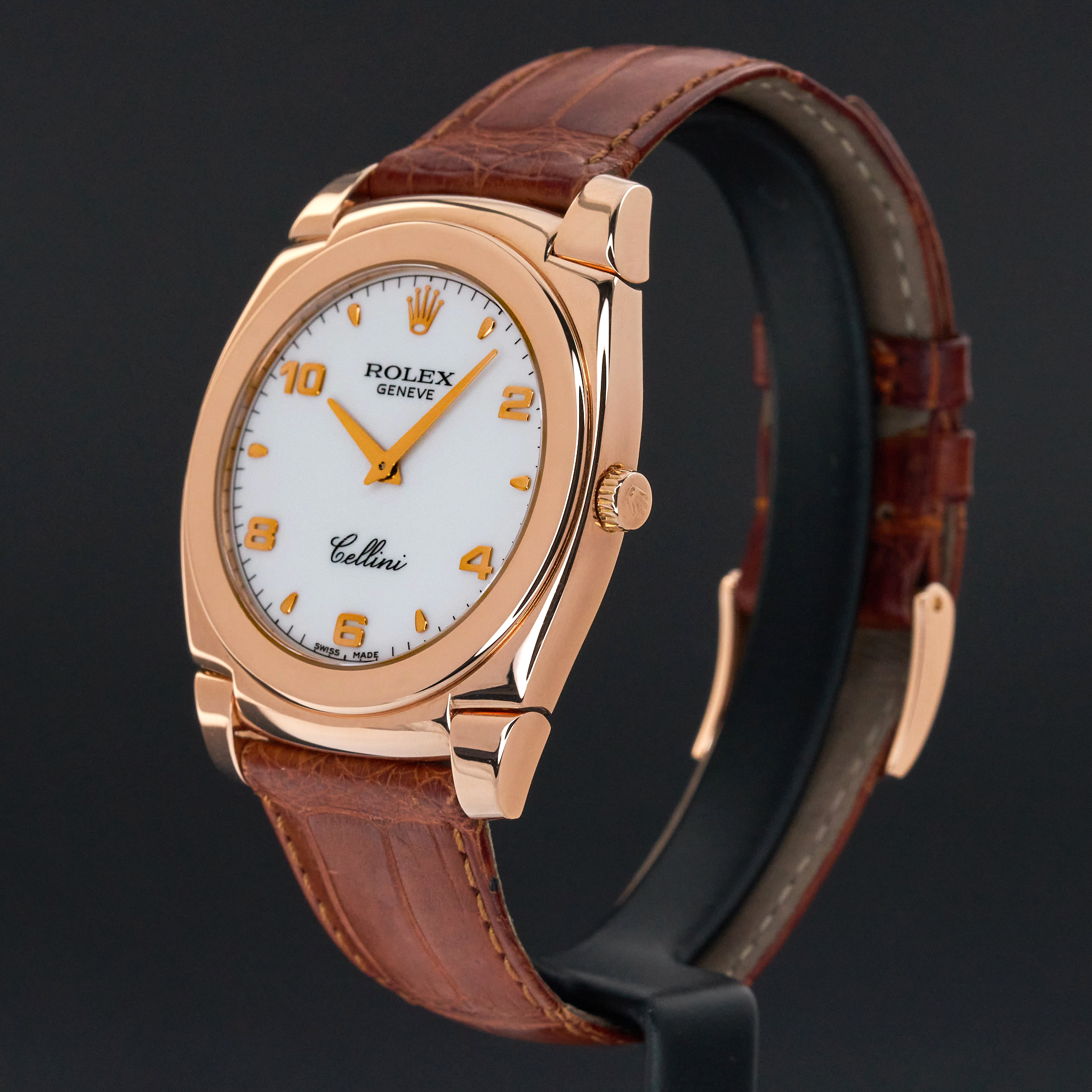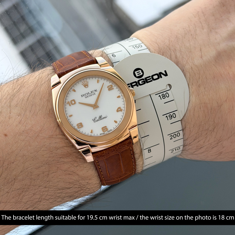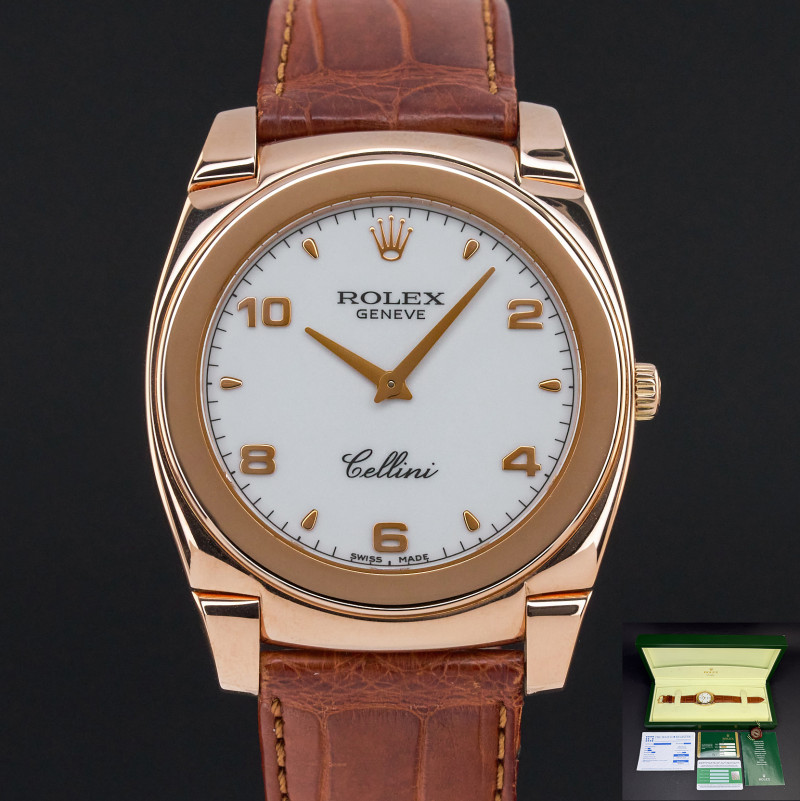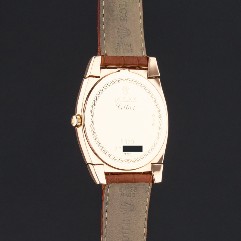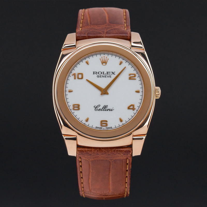 This Rolex Cellini Cestello 5330 features a White Arabic dial and is crafted from 18K rose gold, with a production year of 2006.
