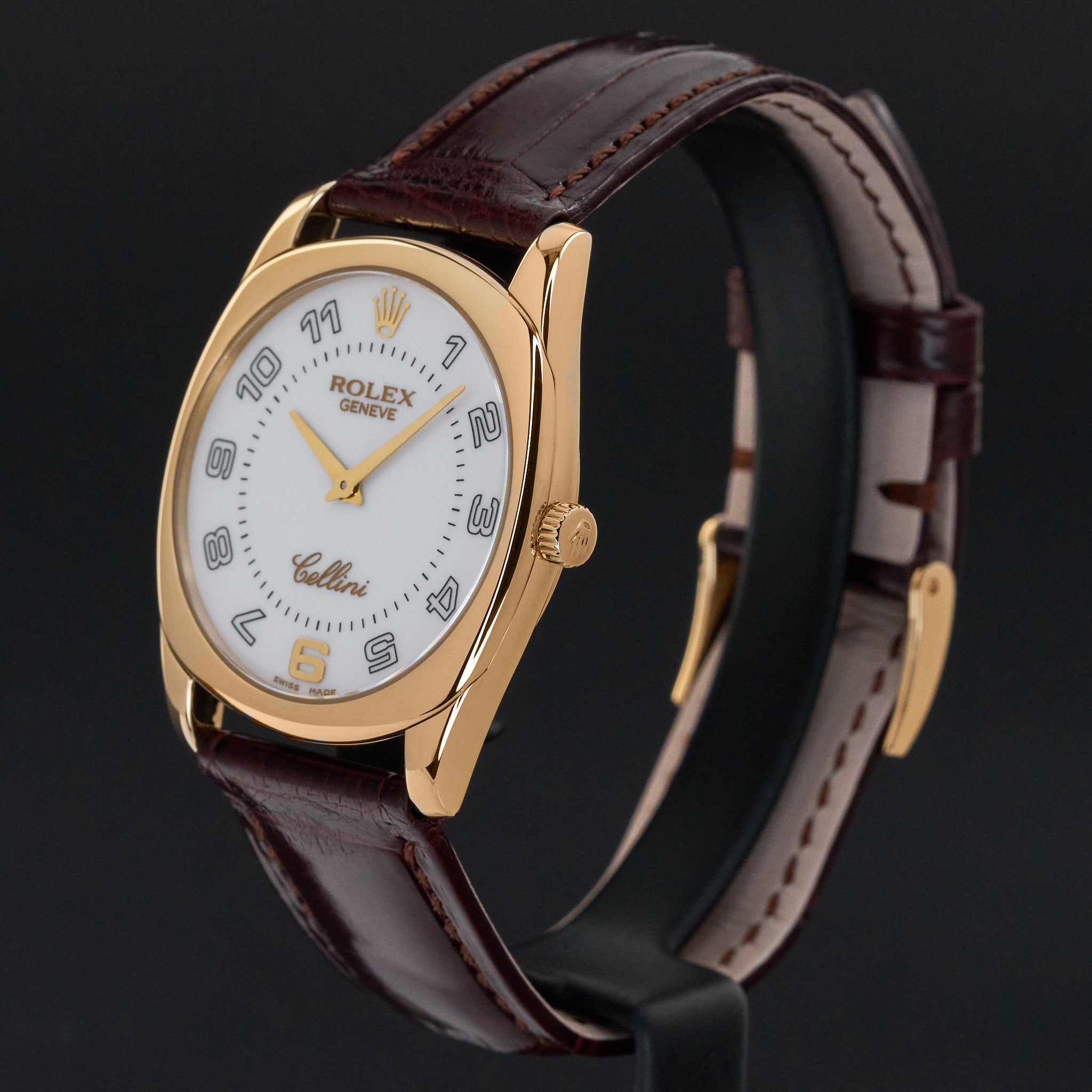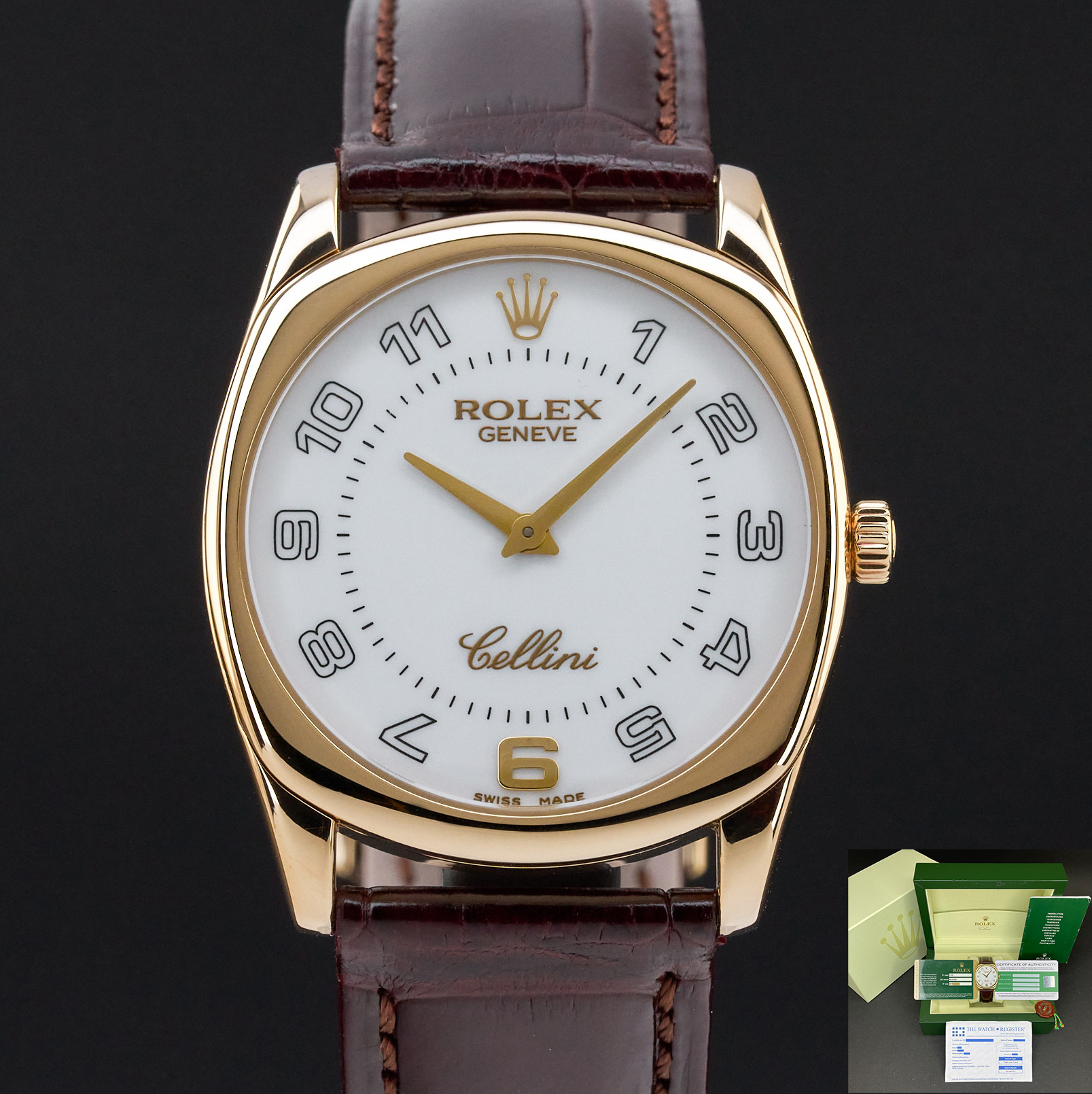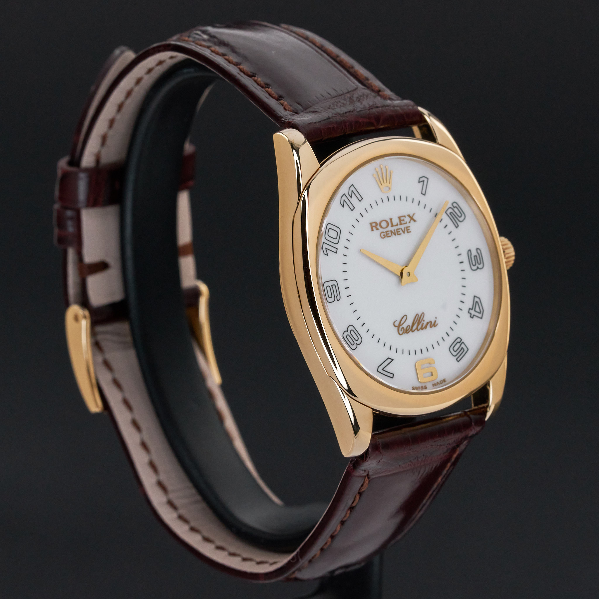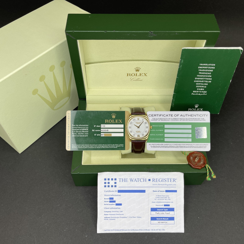 This Rolex Cellini Danaos 4233 features a White Arabic dial and is crafted from 18K yellow gold, with a production year of 2008.