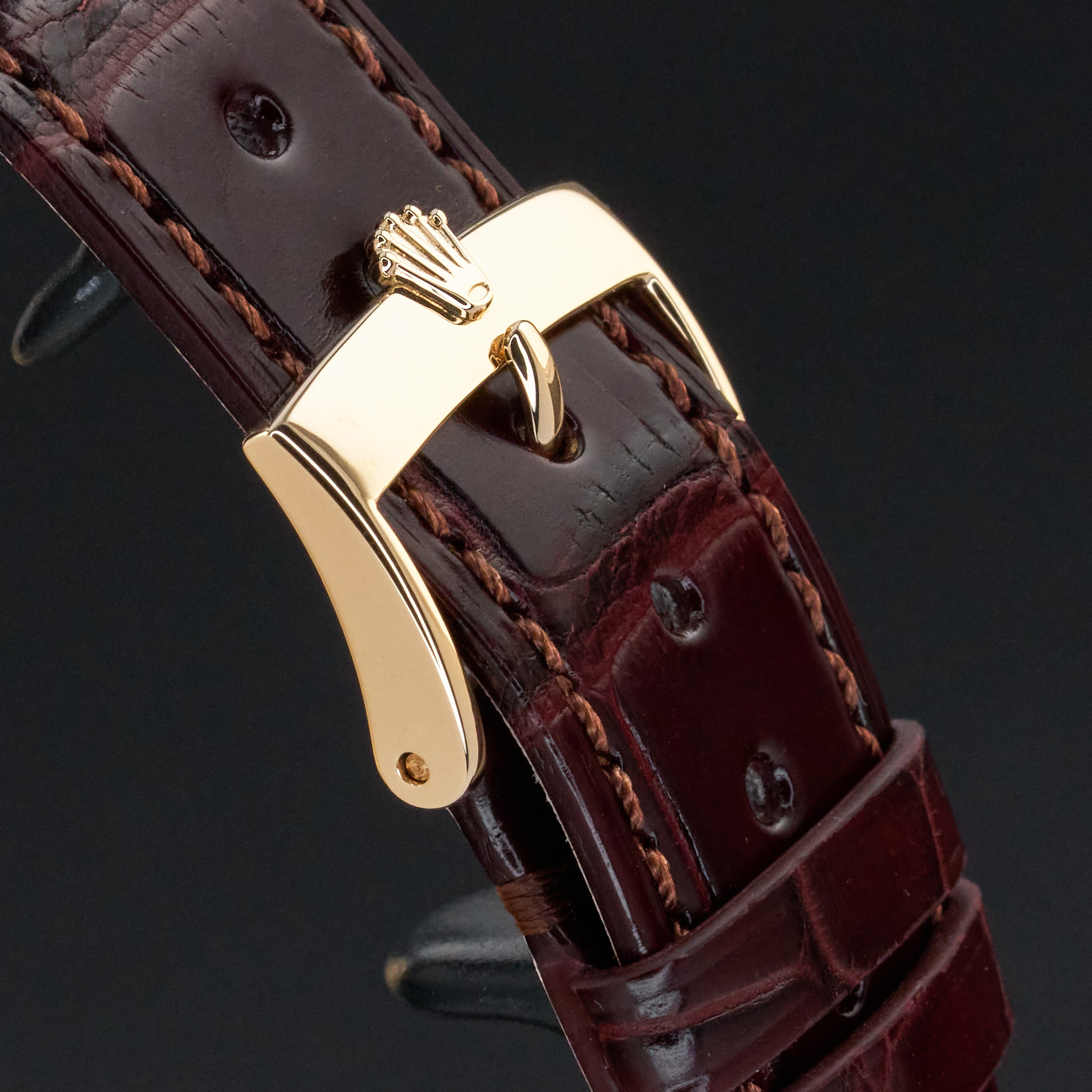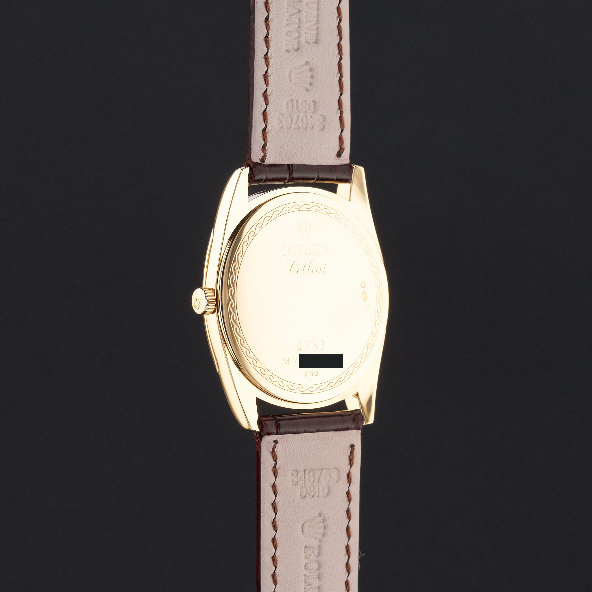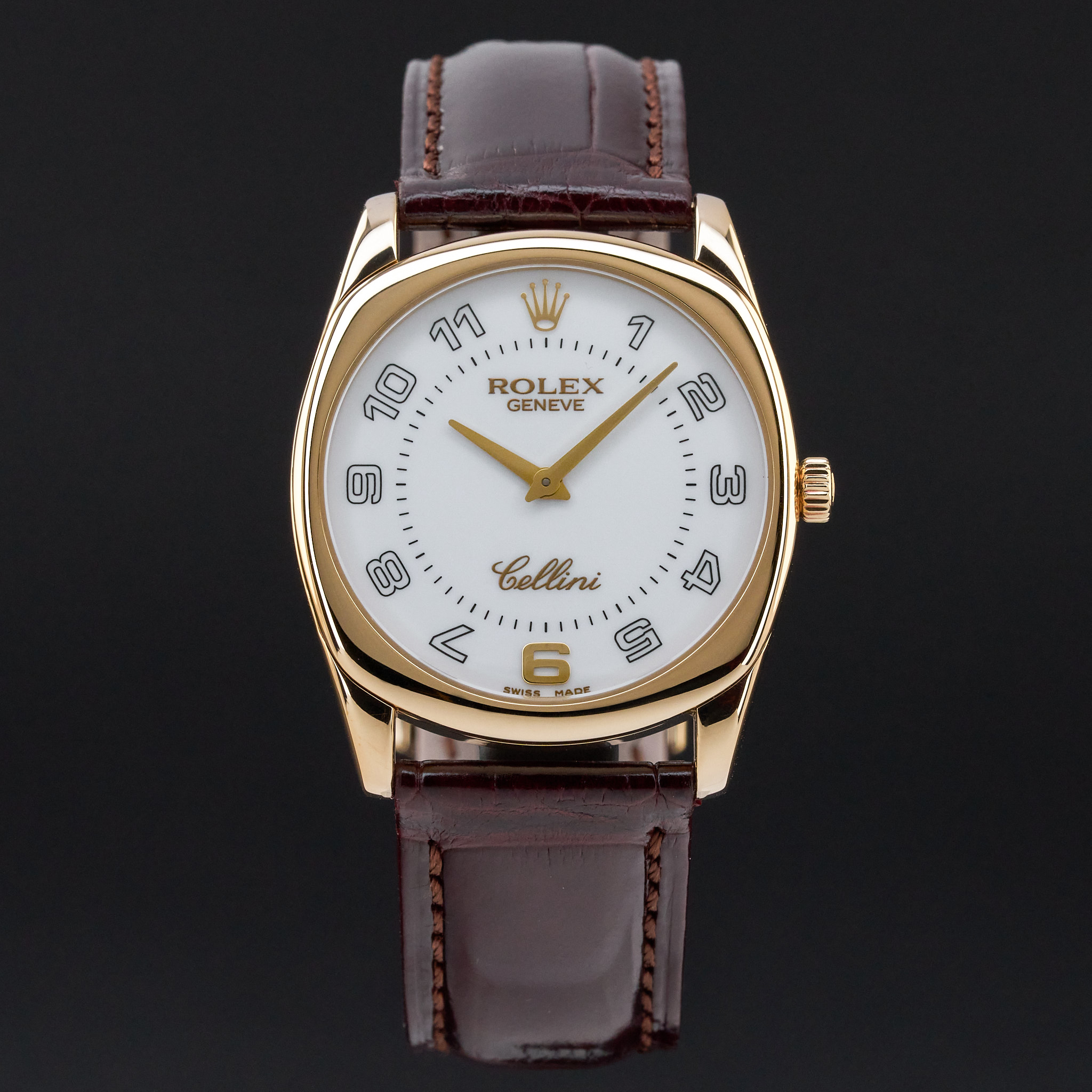 This Rolex Cellini Danaos 4233 features a White Arabic dial and is crafted from 18K yellow gold, with a production year of 2008.