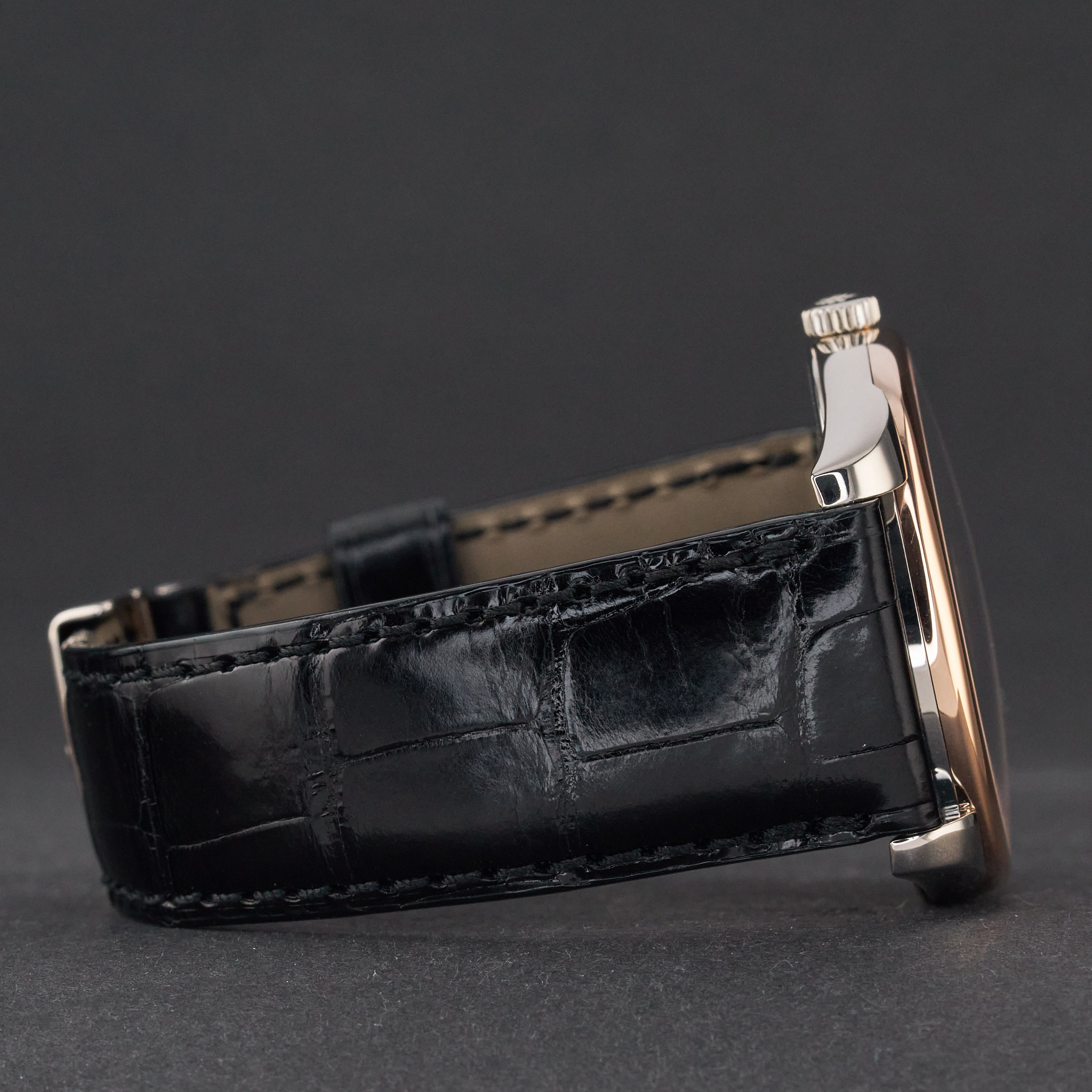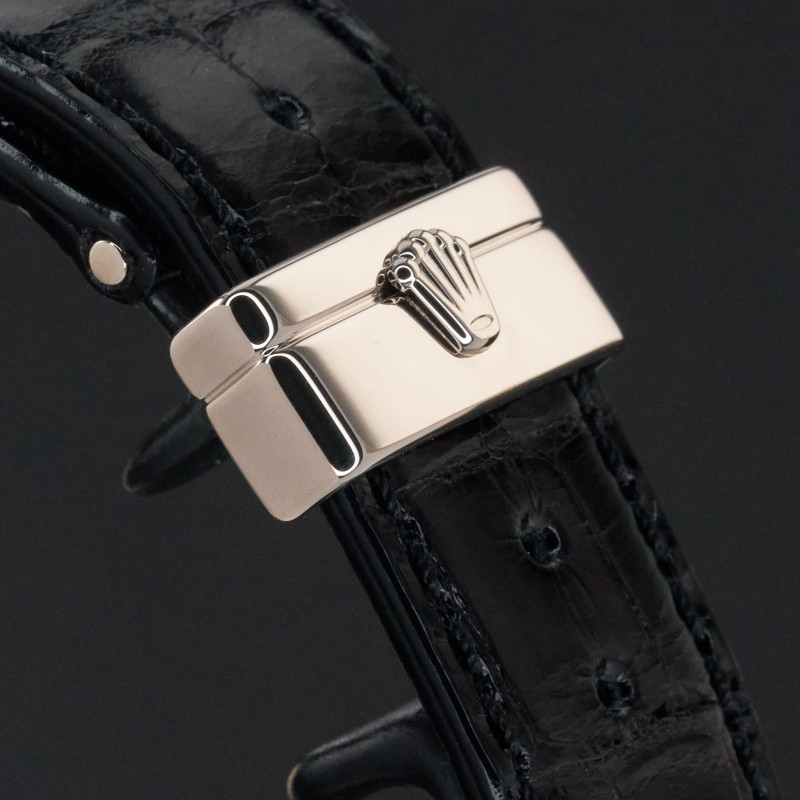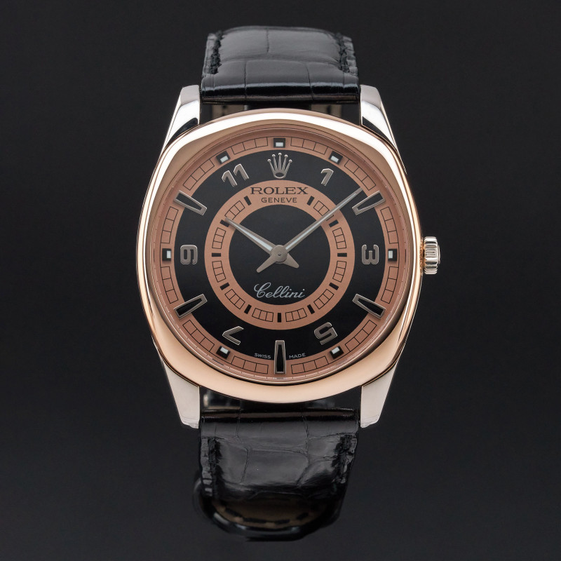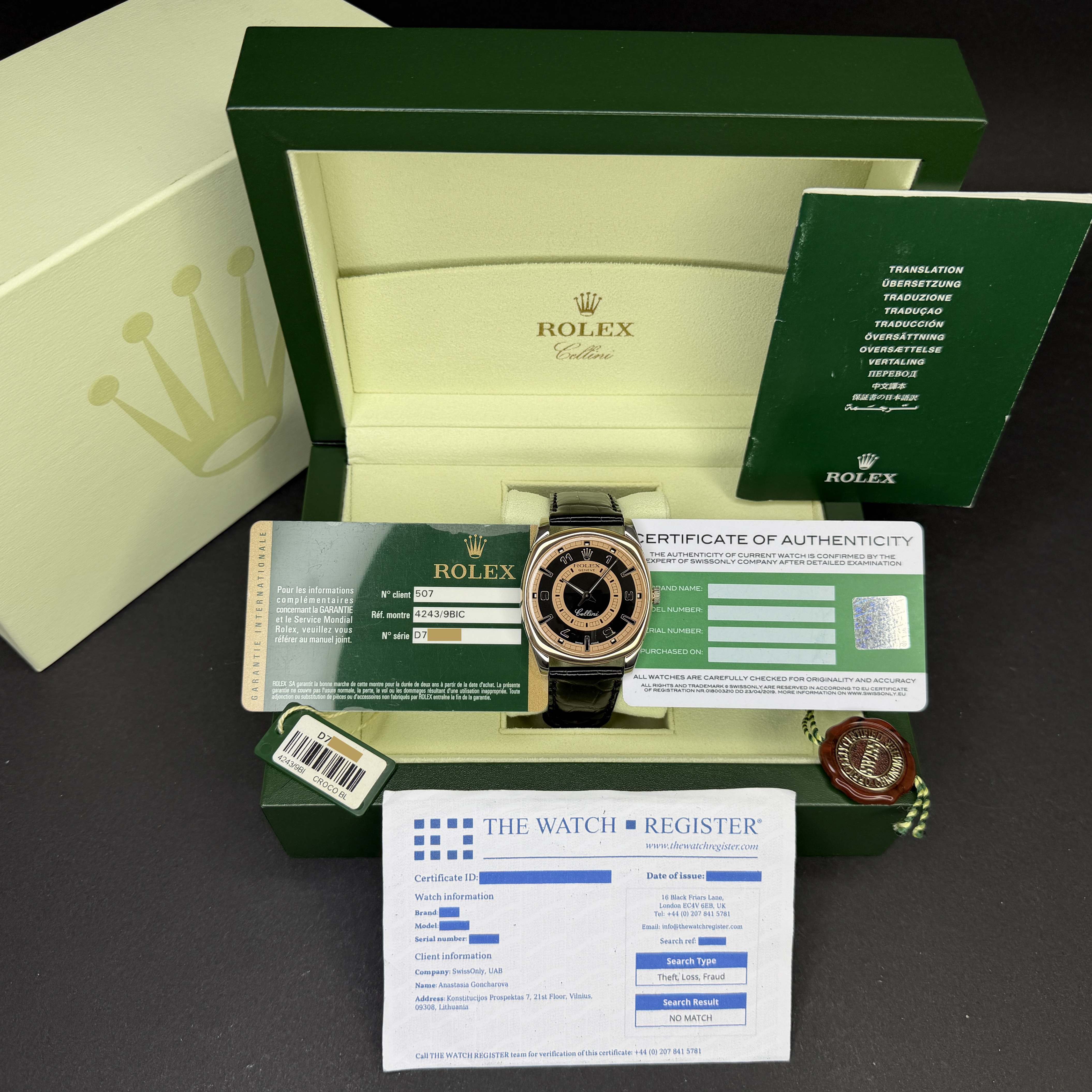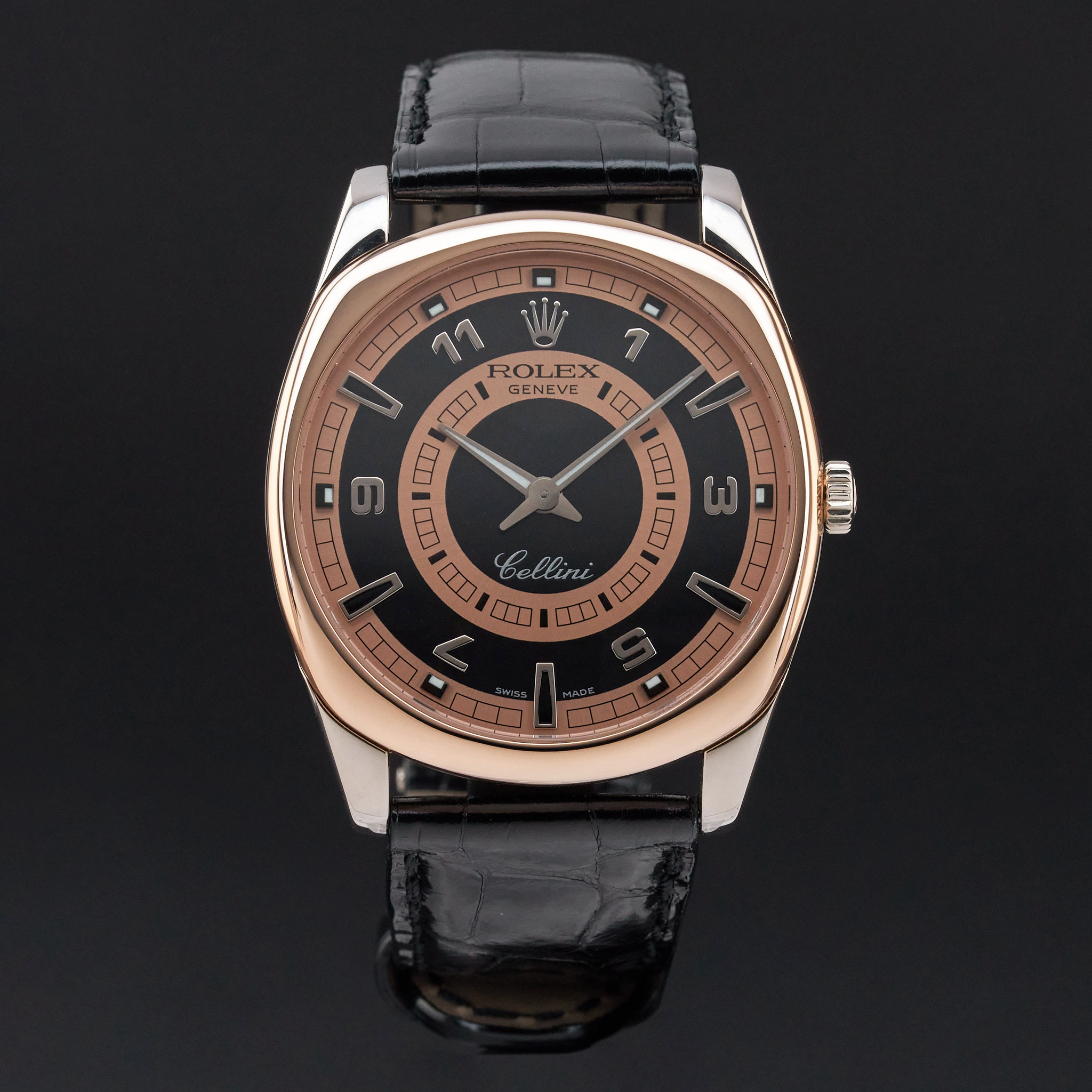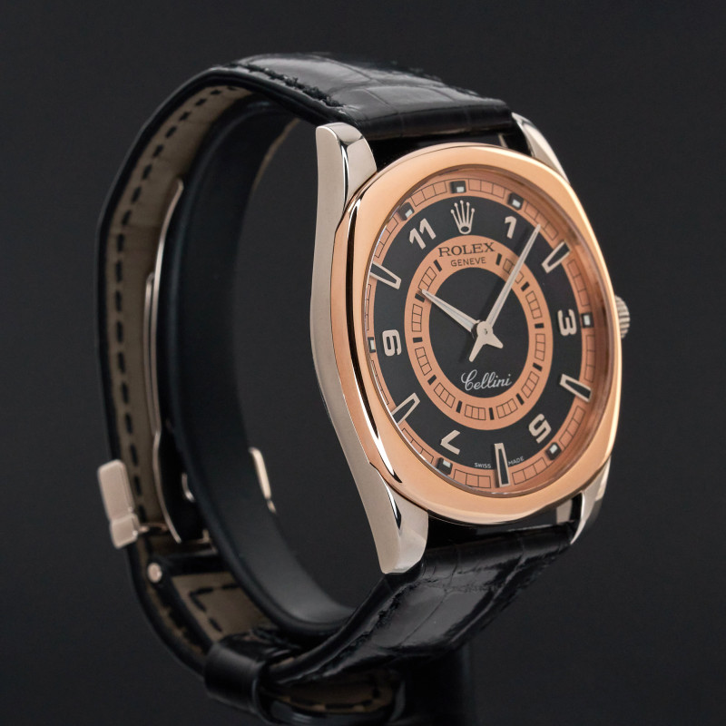This Rolex Cellini Danaos 4243/9BIC features a Black/Bronze Arabic dial and is crafted from 18K rose and white gold, with a production year of 2006.