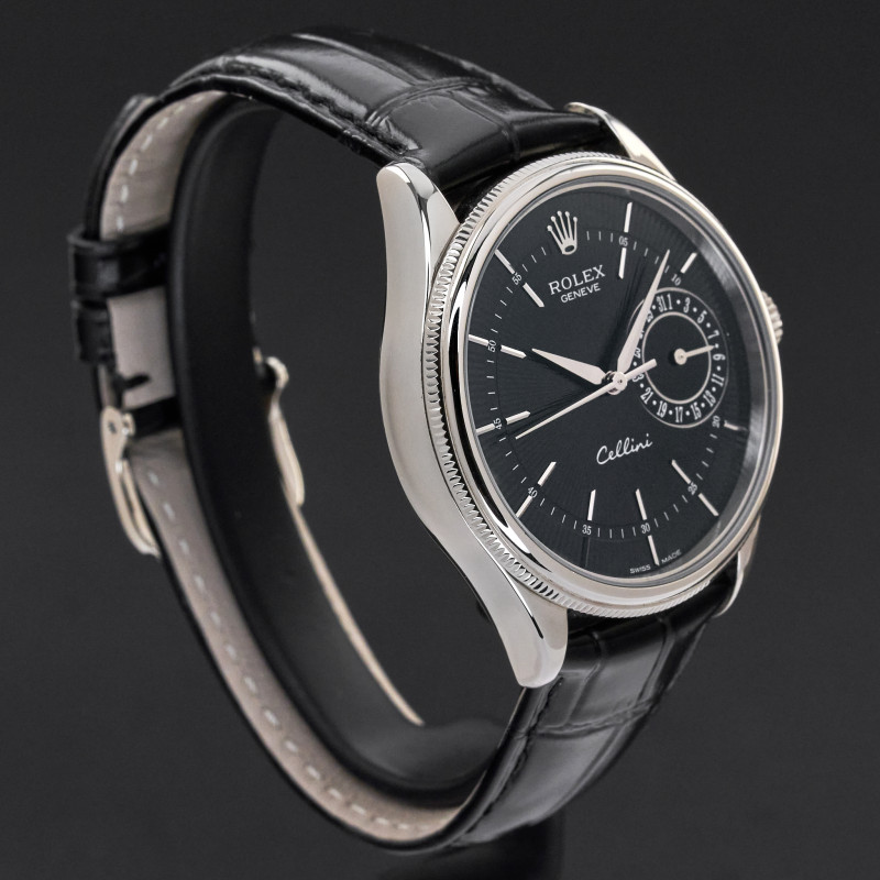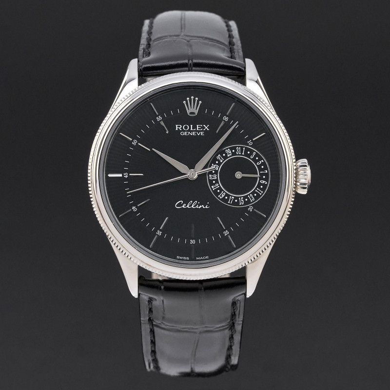 This particular Rolex Cellini Date introduced in 2016, is a graceful expression of Rolex’s dress watch philosophy. It's black guilloché dial features an elegant sunray motif that adds visual richness and dimension without overwhelming the minimalist layout. The discreet date subdial at 3 o’clock maintains symmetry while enhancing function, all framed in a timeless, classic silhouette.