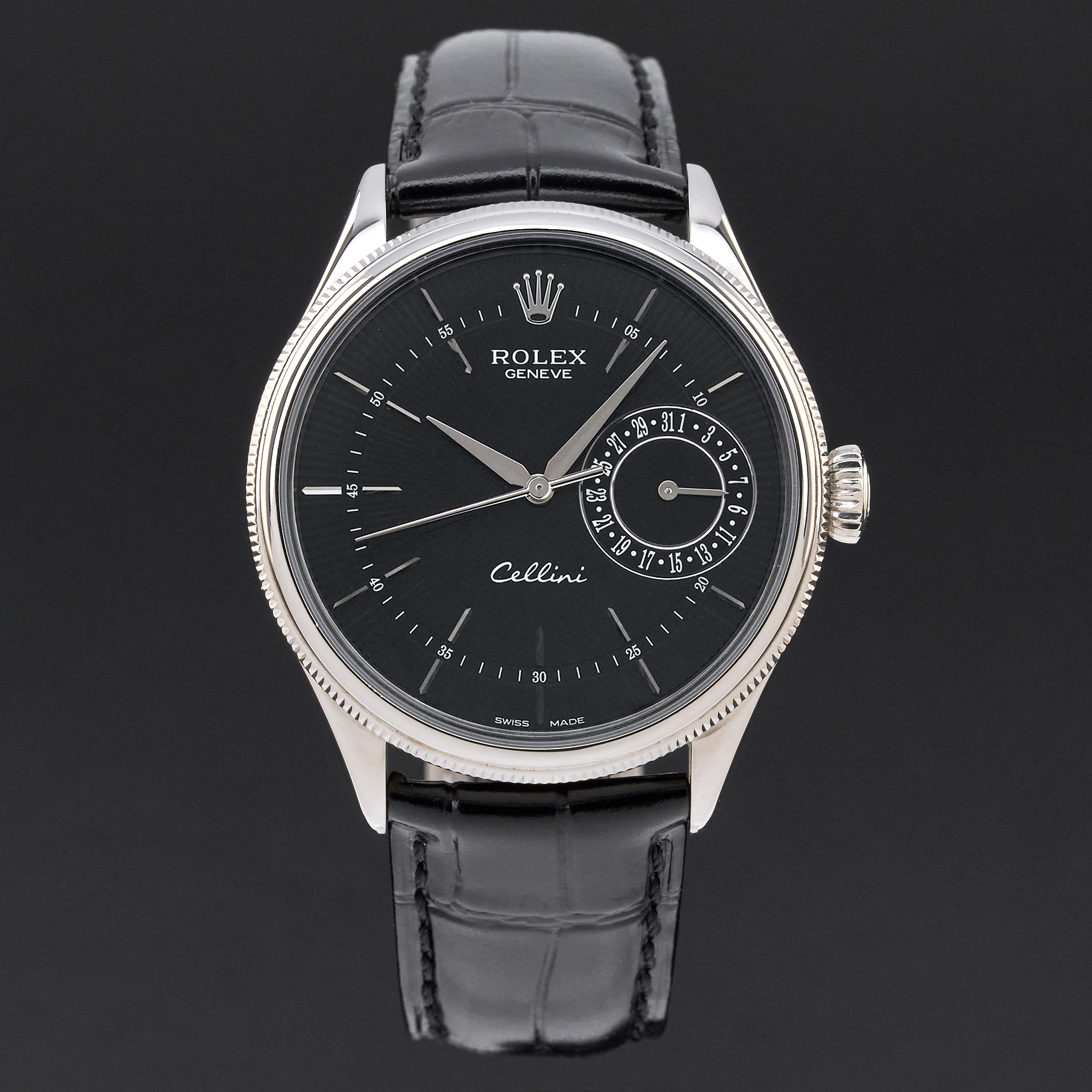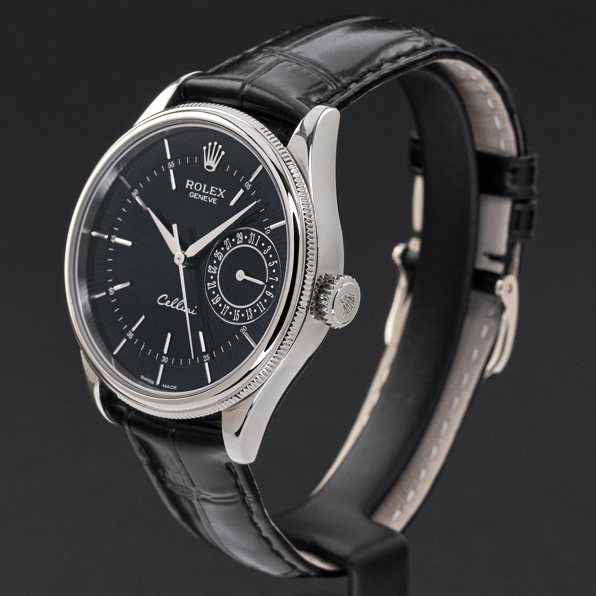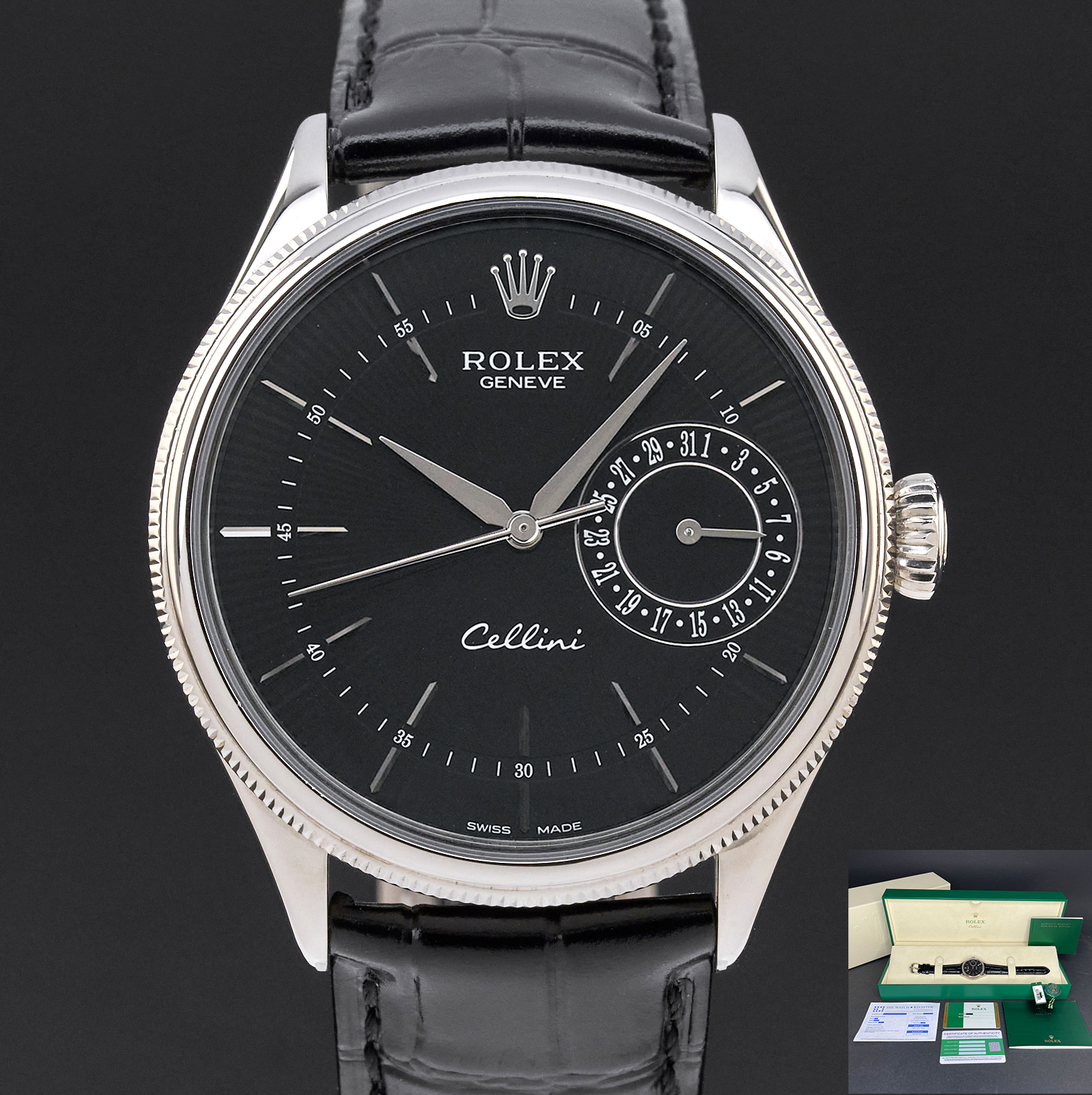 This Rolex Cellini Date 50519 features a Black Guilloche dial and is crafted from 18K white gold, with a production year of 2016.