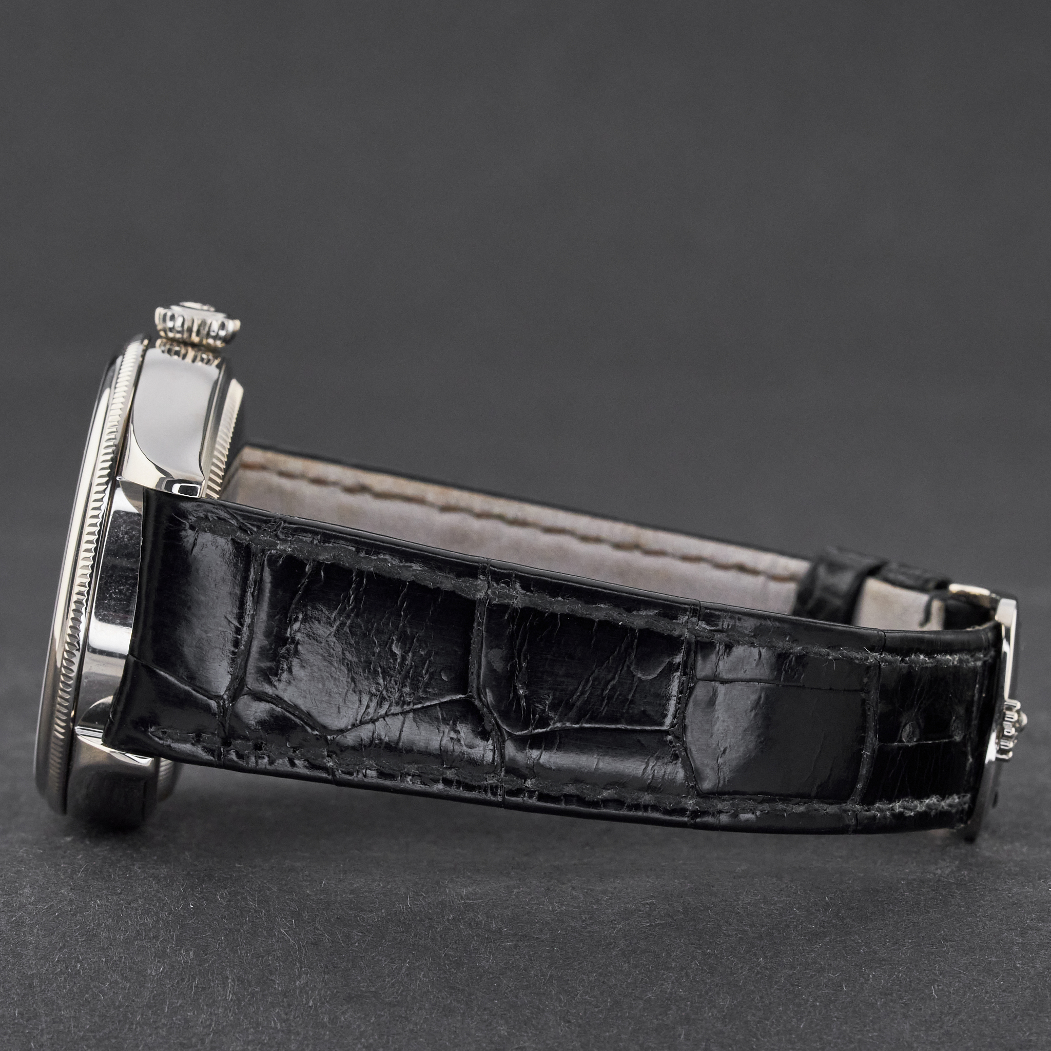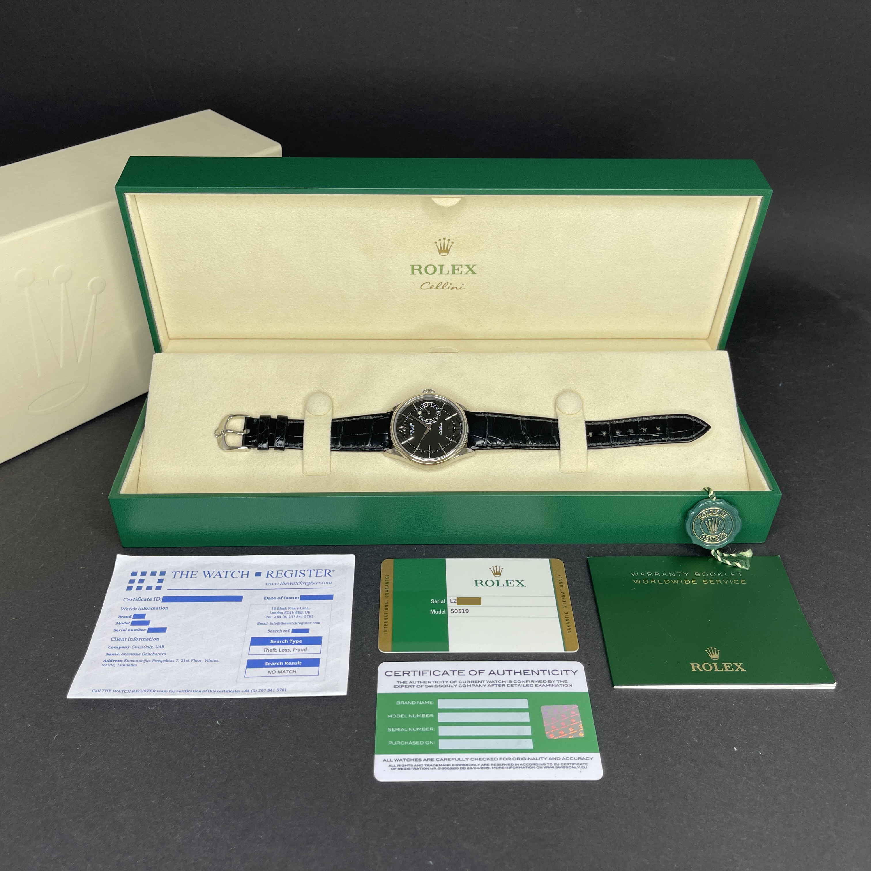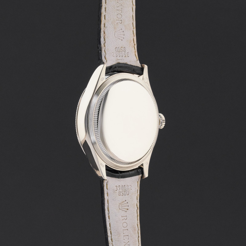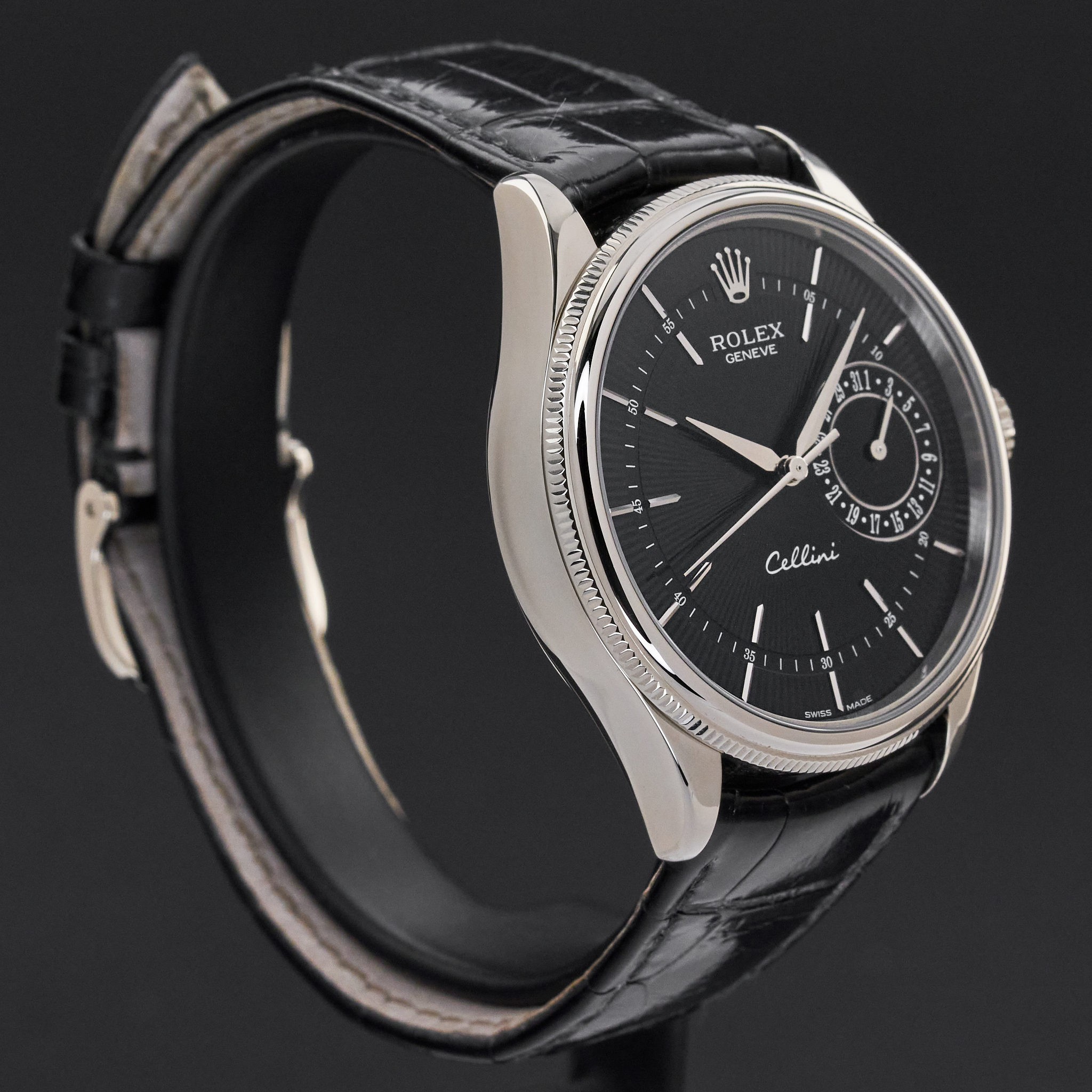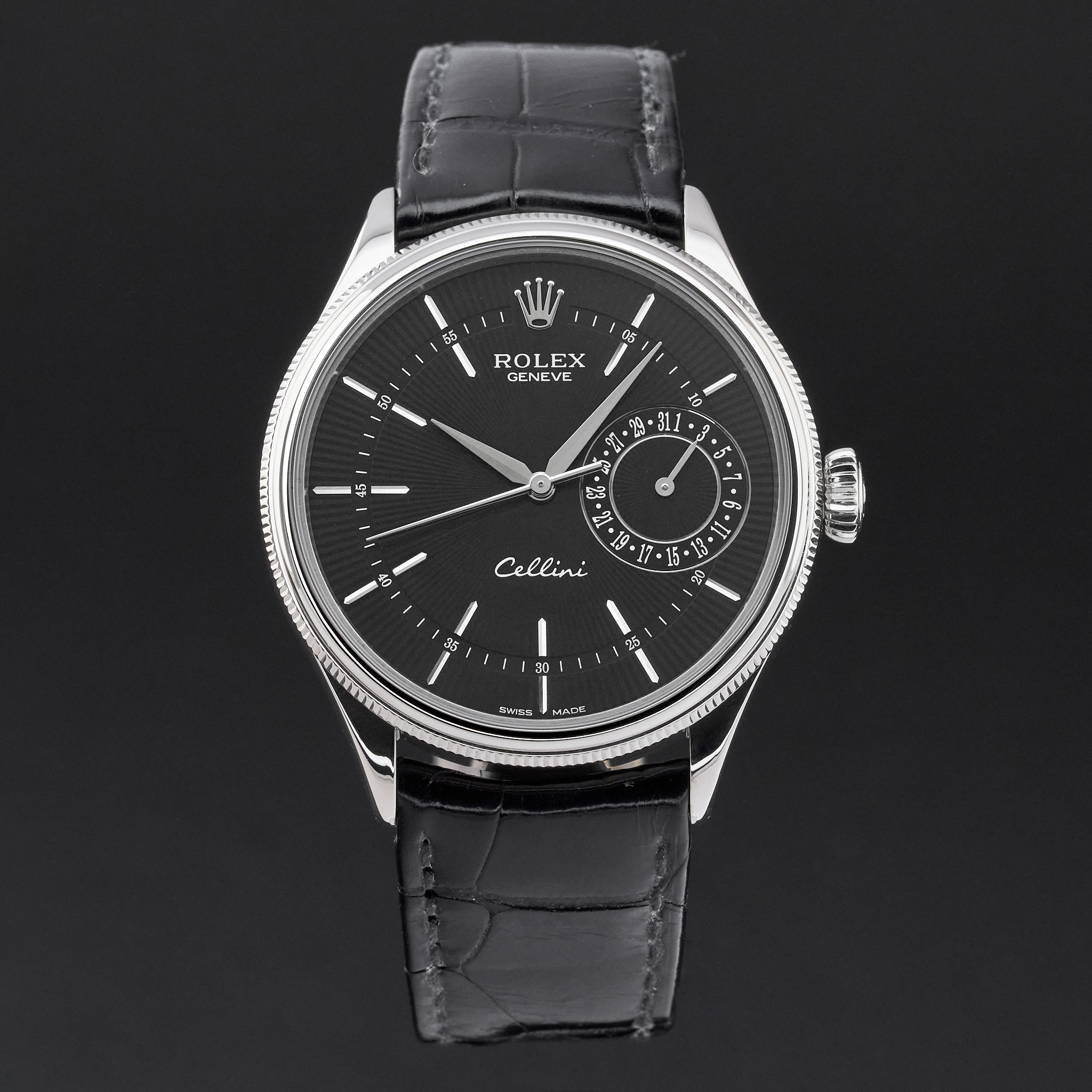 This Rolex Cellini Date 50519 features a Black Guilloche dial and is crafted from 18K white gold, with a production year of 2016.