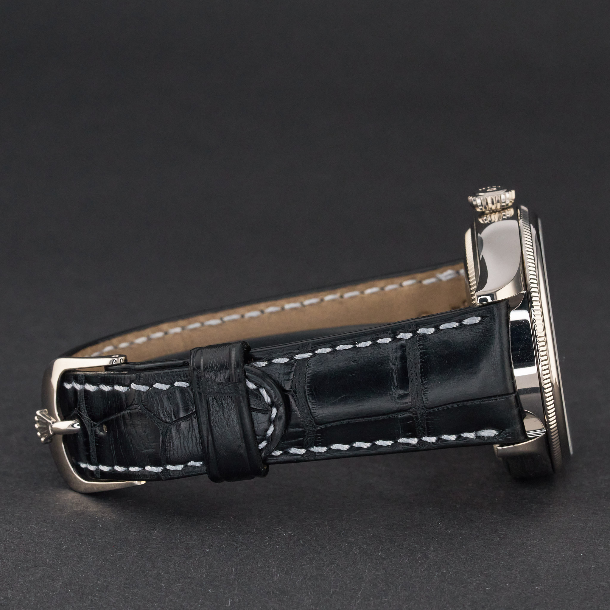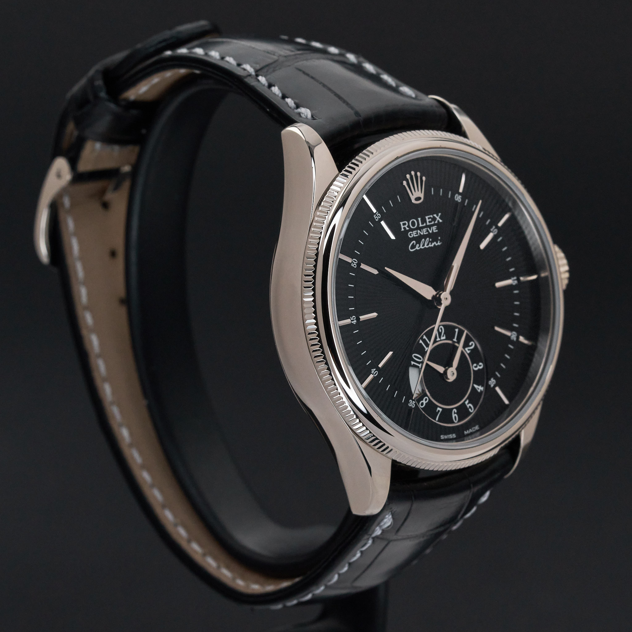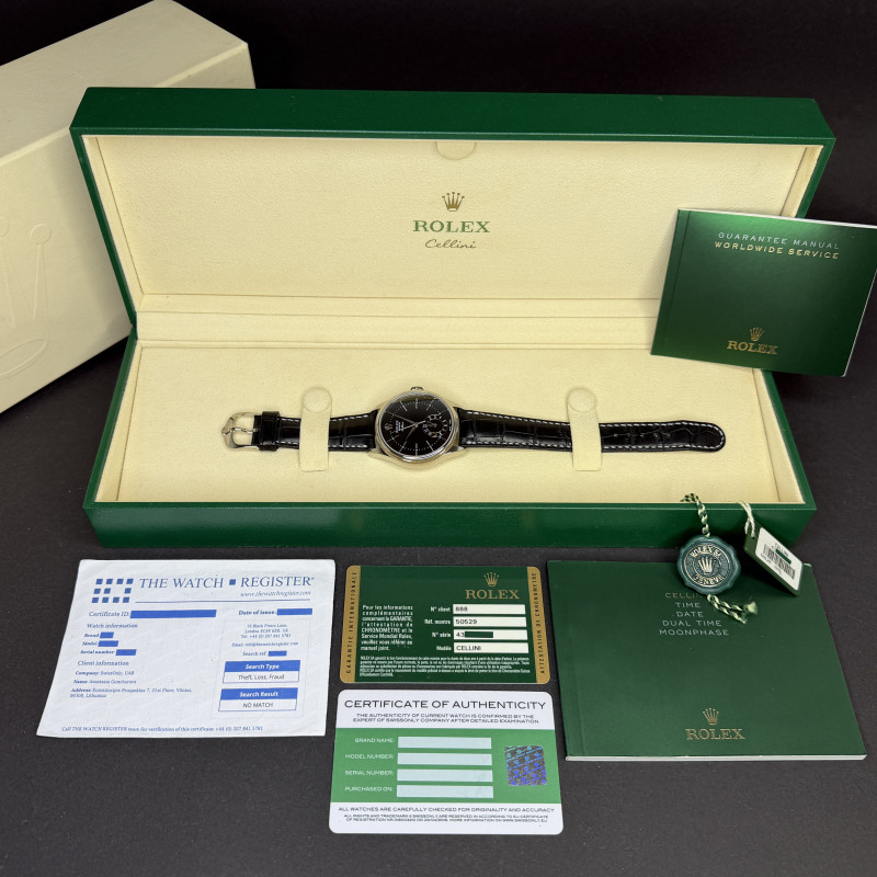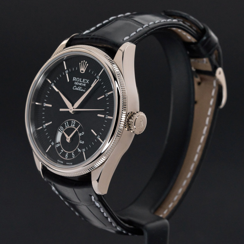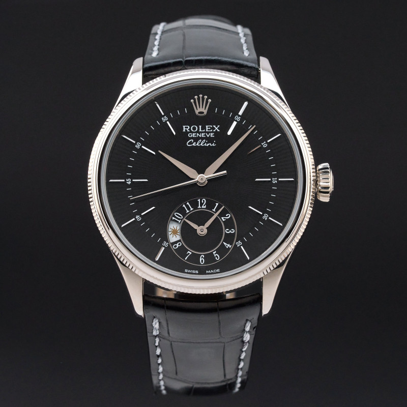 This Rolex Cellini Dual Time 50529 features a Black Guilloche dial and is crafted from 18K white gold, with a production year of 2014.
