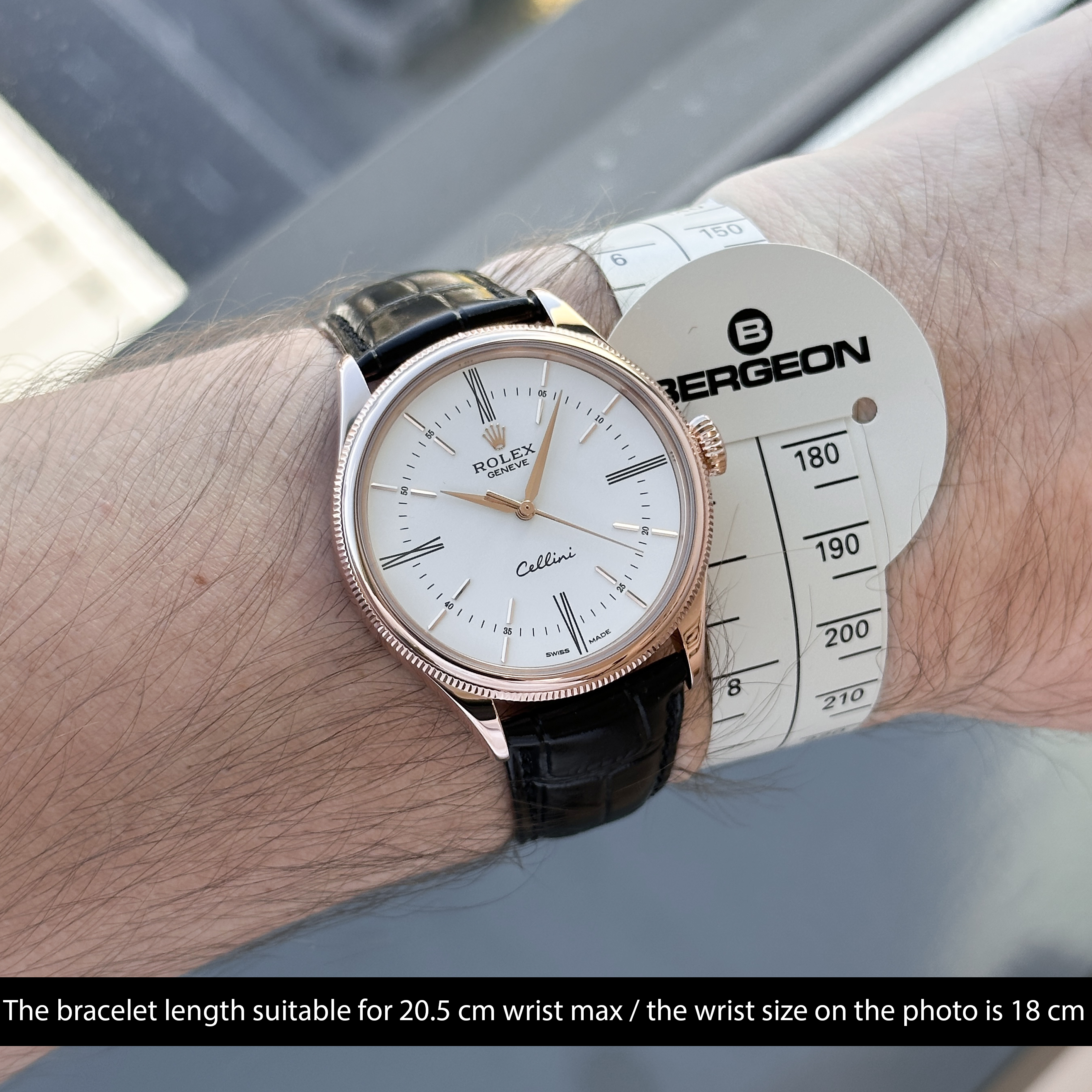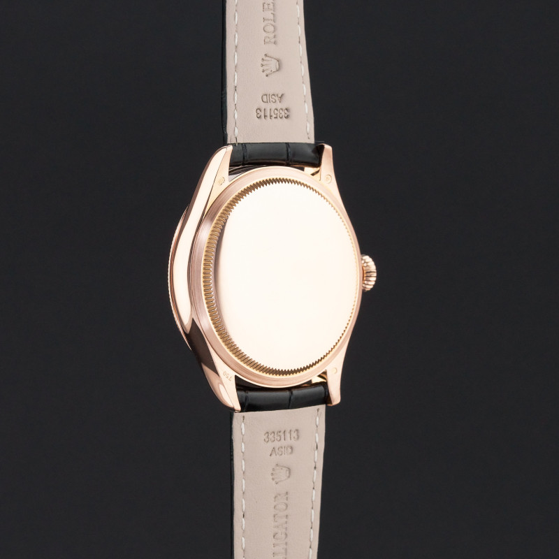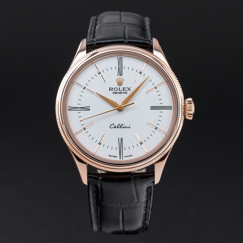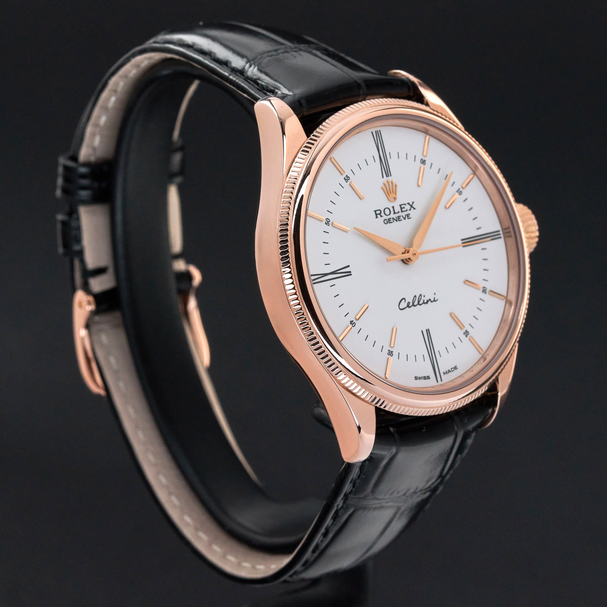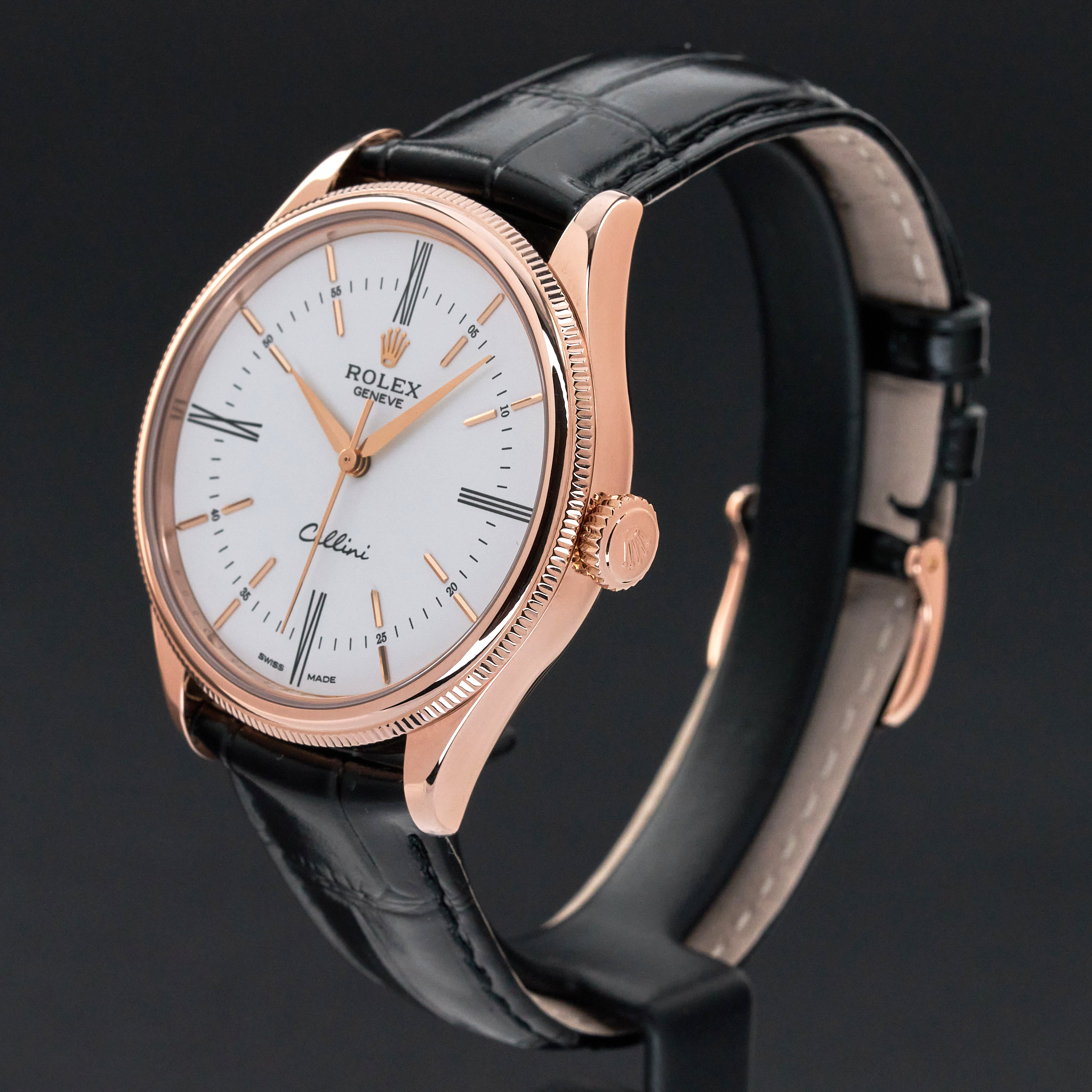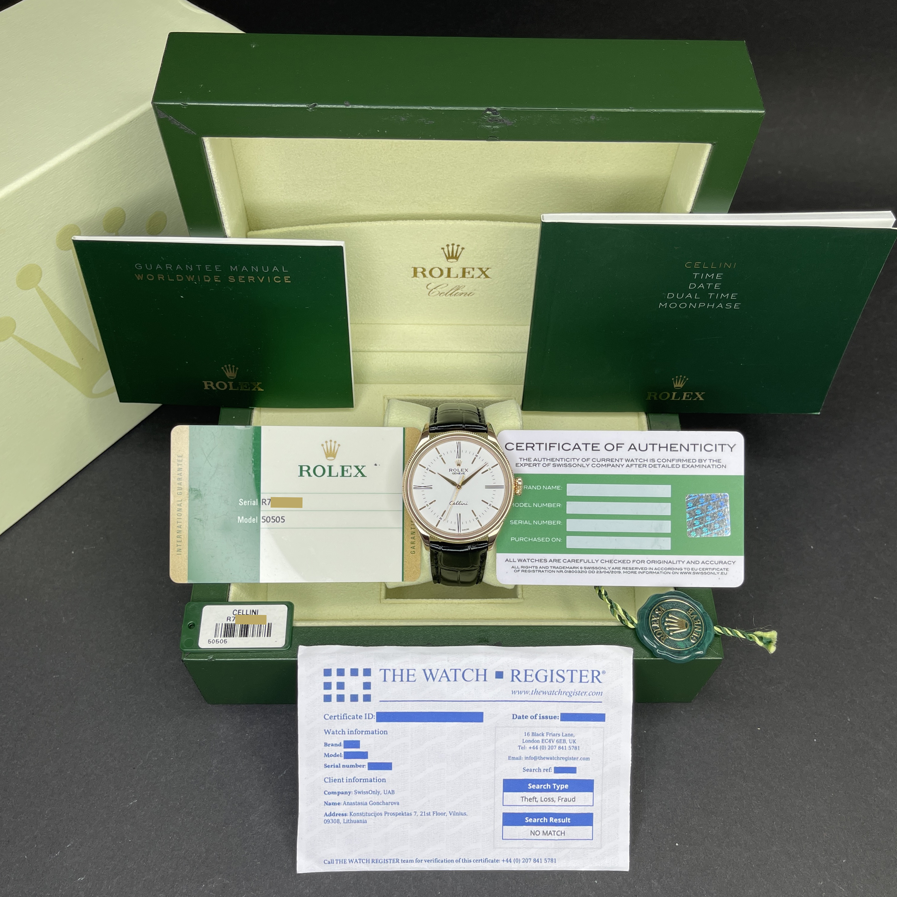 This Rolex Cellini Time 50505 features a White Roman dial and is crafted from 18K rose gold, with a production year of 2016.