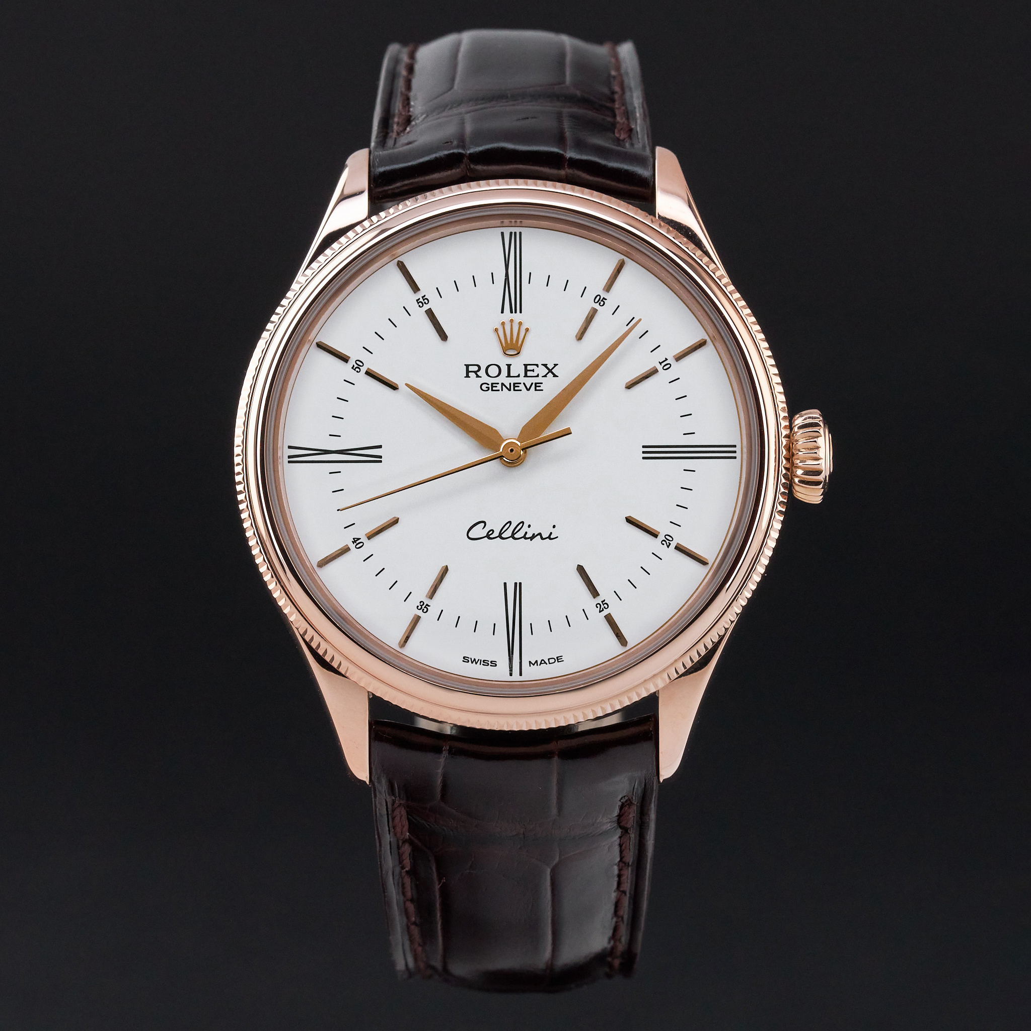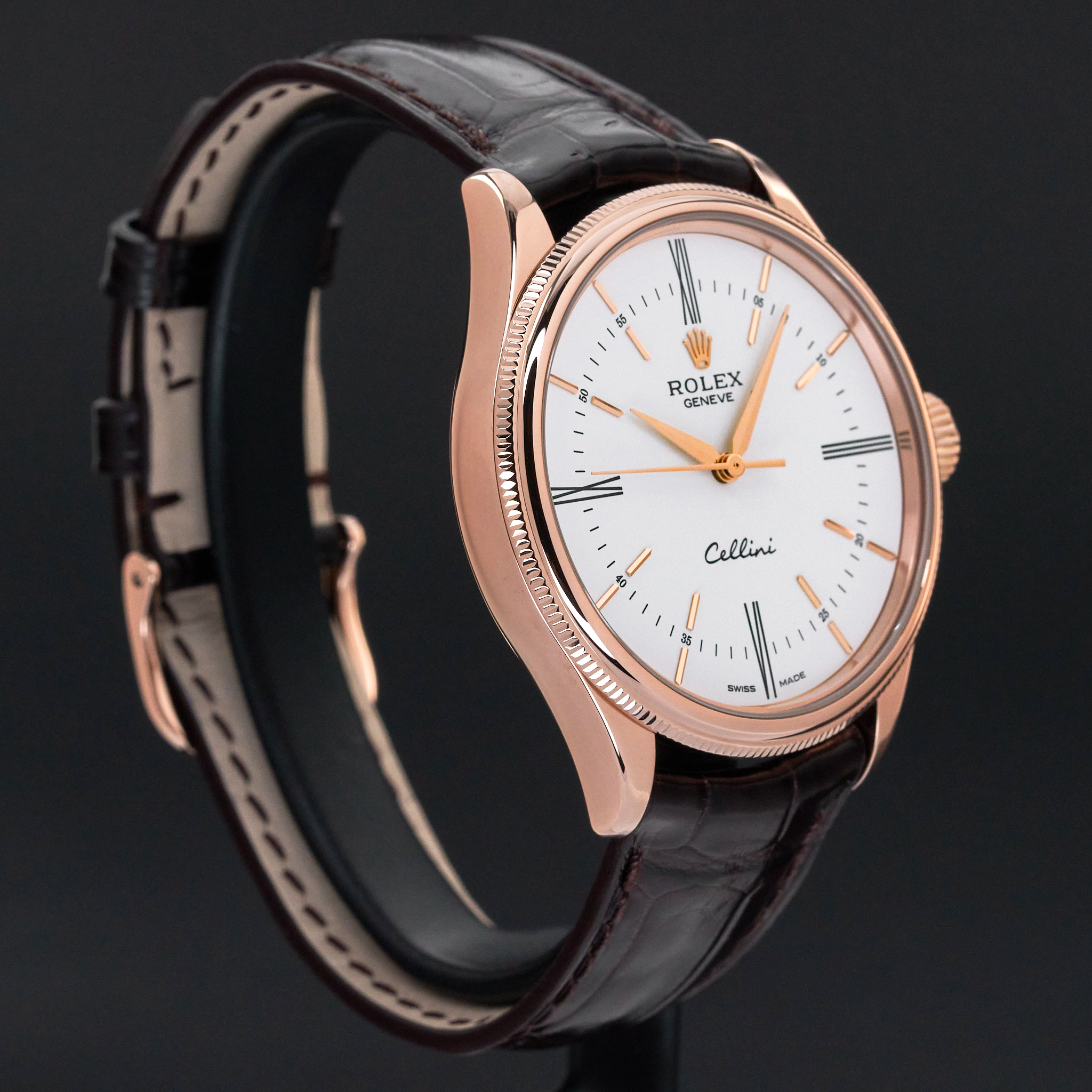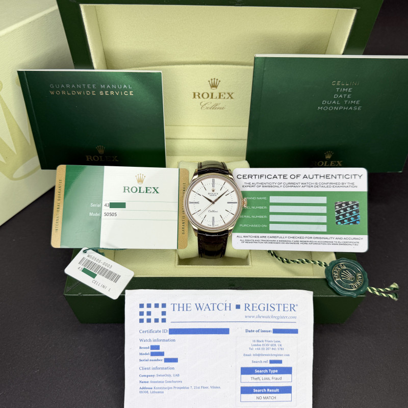 This Rolex Cellini Time 50505 features a White Roman dial and is crafted from 18K rose gold, with a production year of 2017.