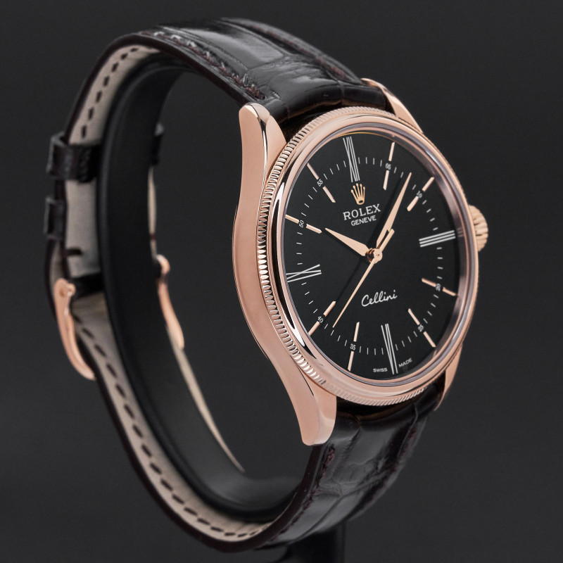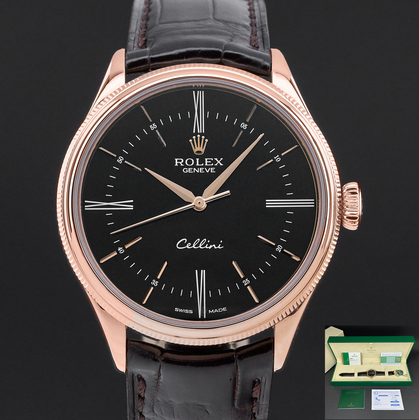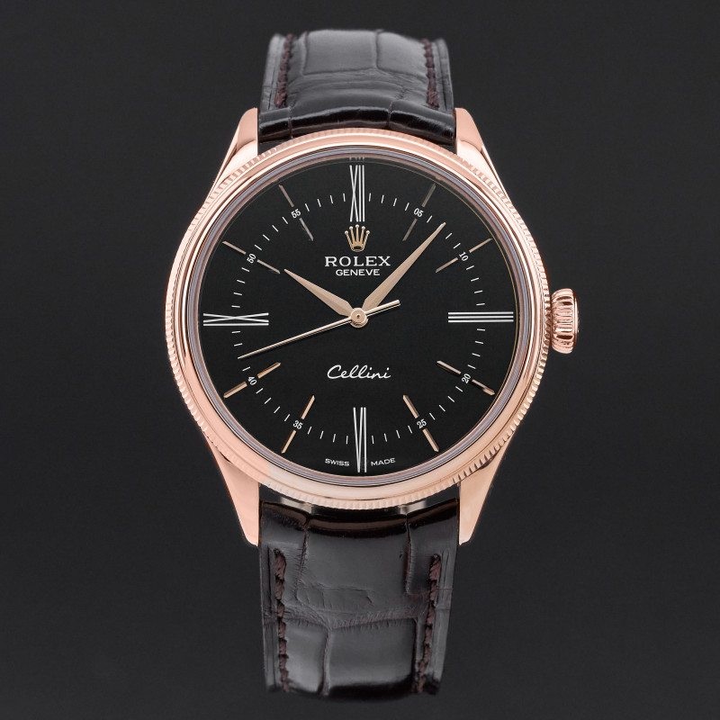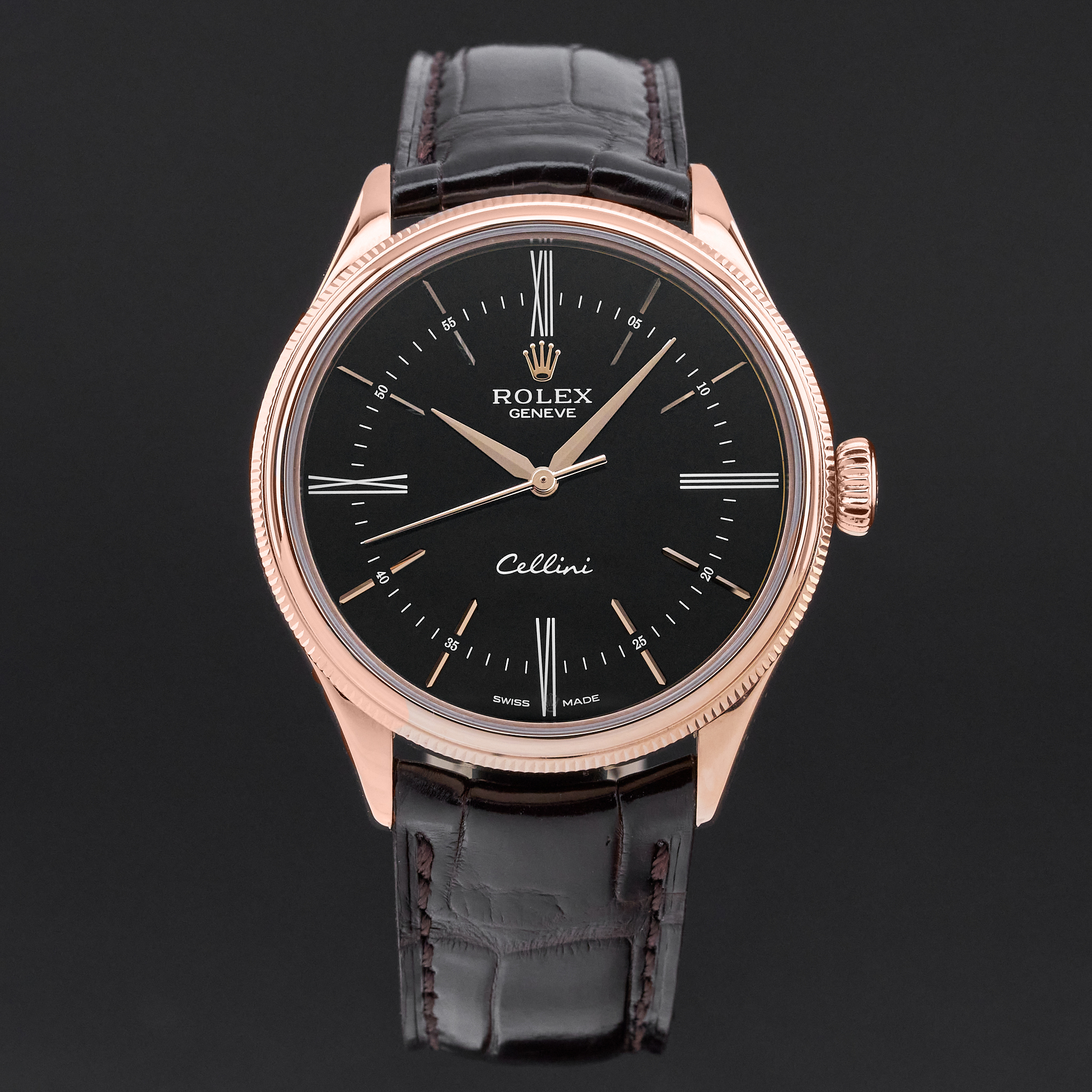 This Rolex Cellini Time 50505 features a Black Roman dial and is crafted from 18K rose gold, with a production year of 2018.