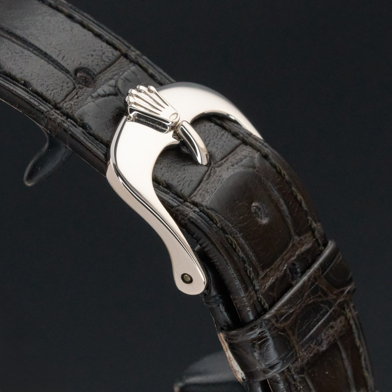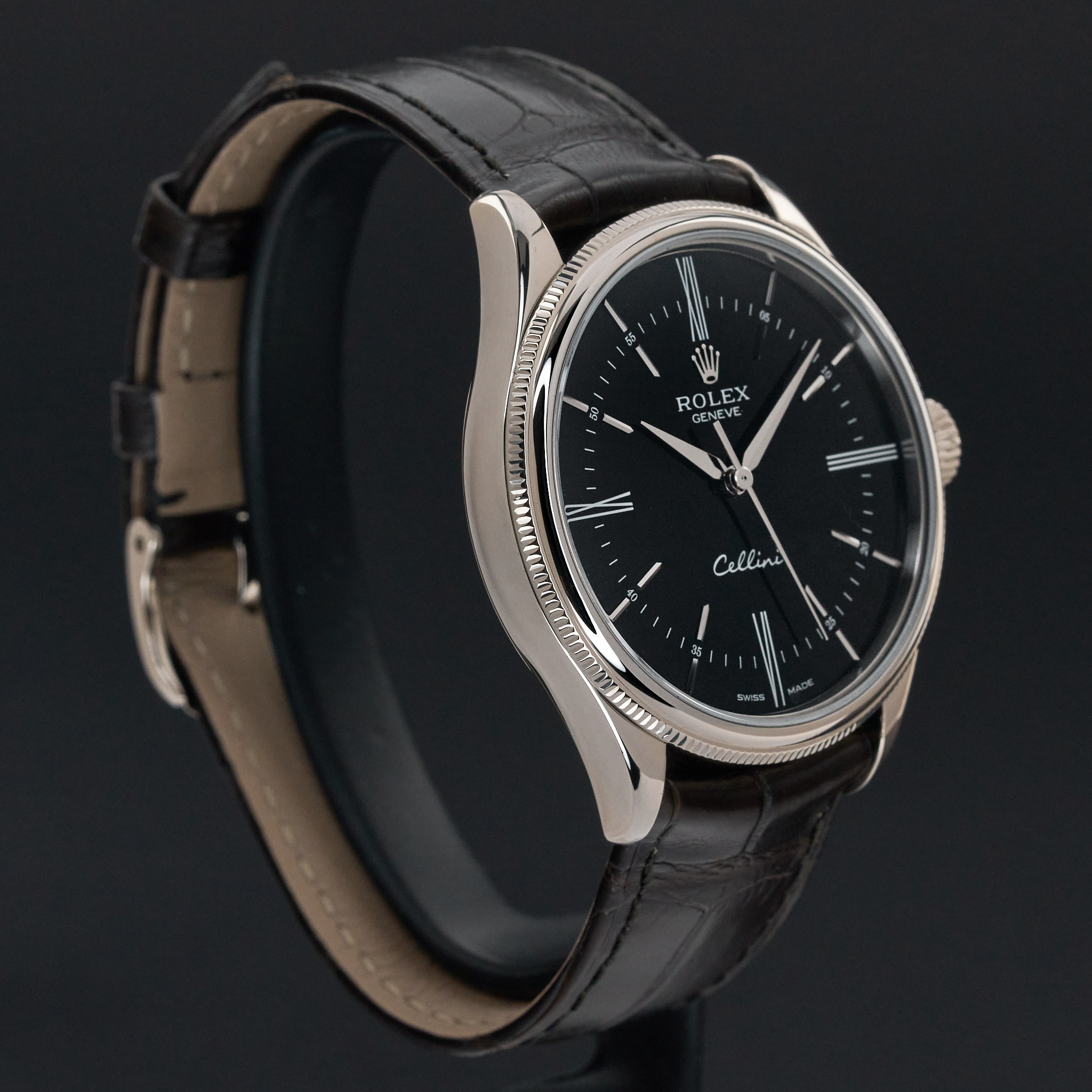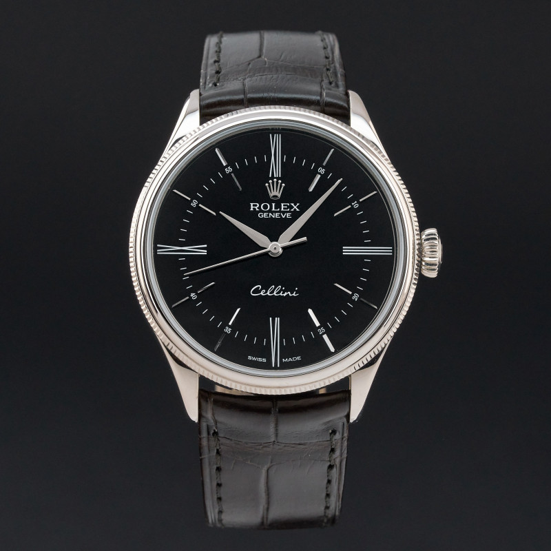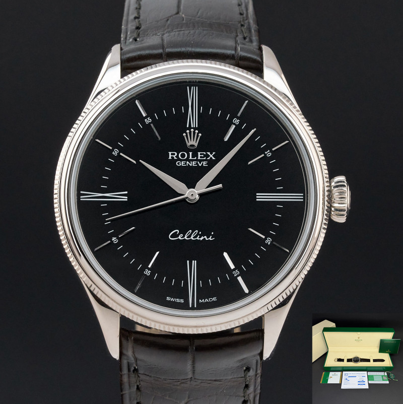 This Rolex Cellini Time 50509 features a Black Roman dial and is crafted from 18K white gold, with a production year of 2018.