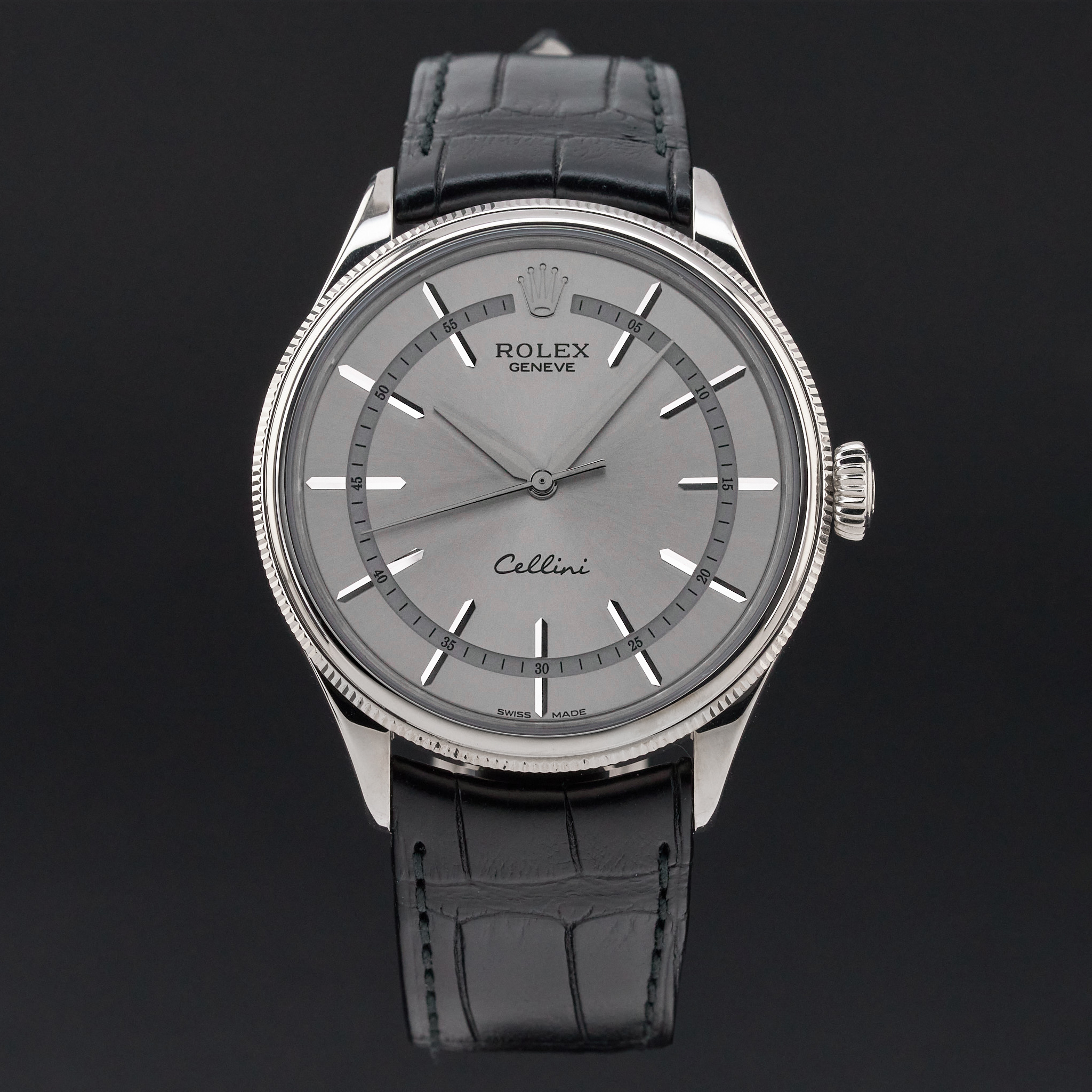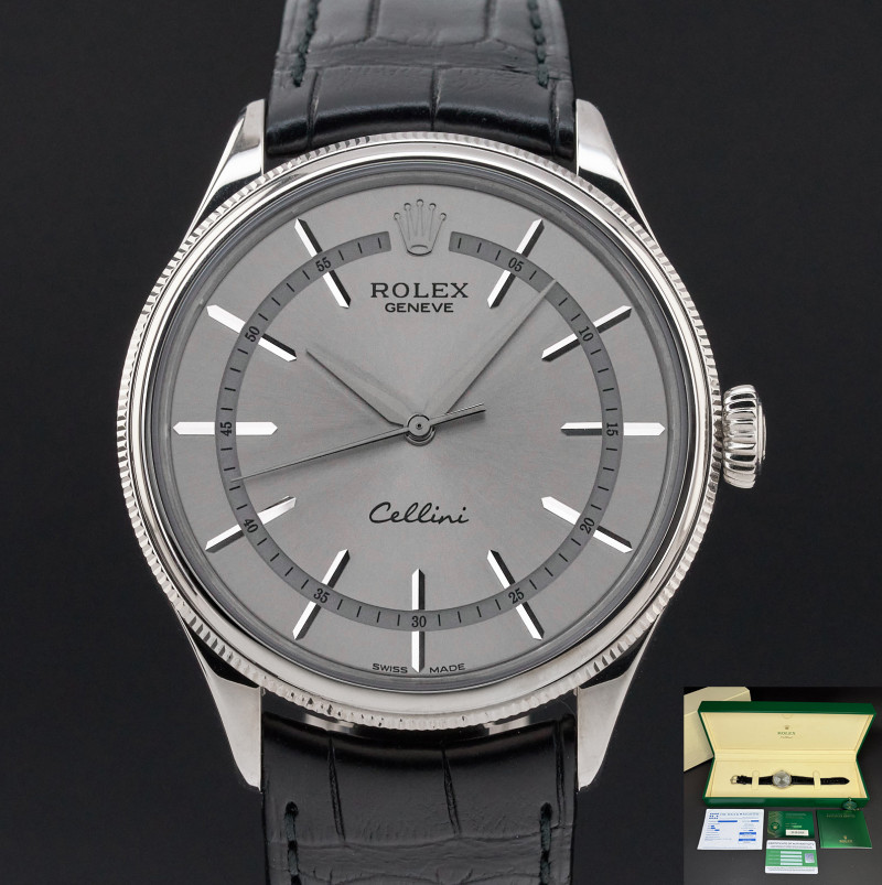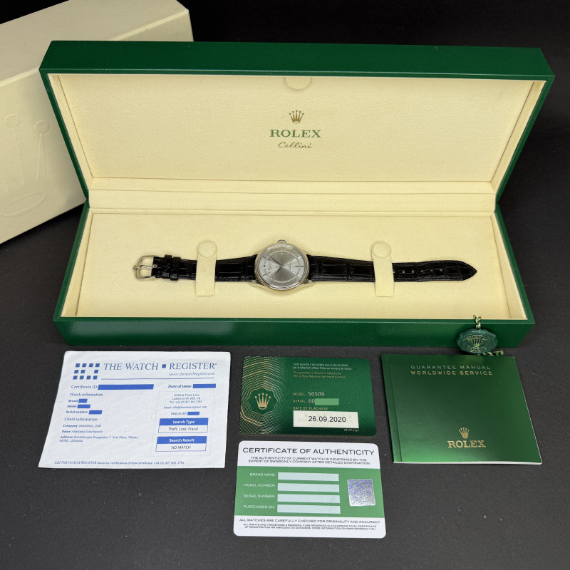 This Rolex Cellini Time 50509 features a Grey dial and is crafted from 18K white gold, with a production year of 2020.