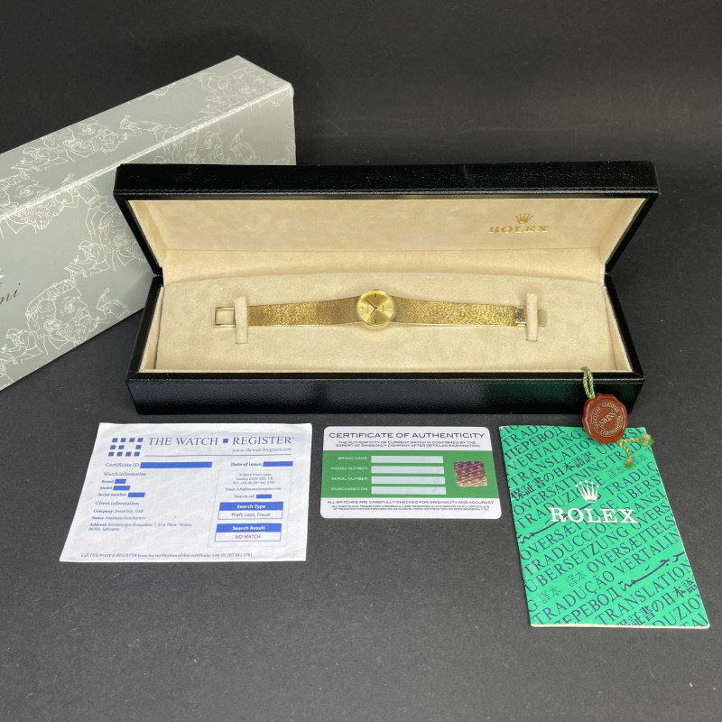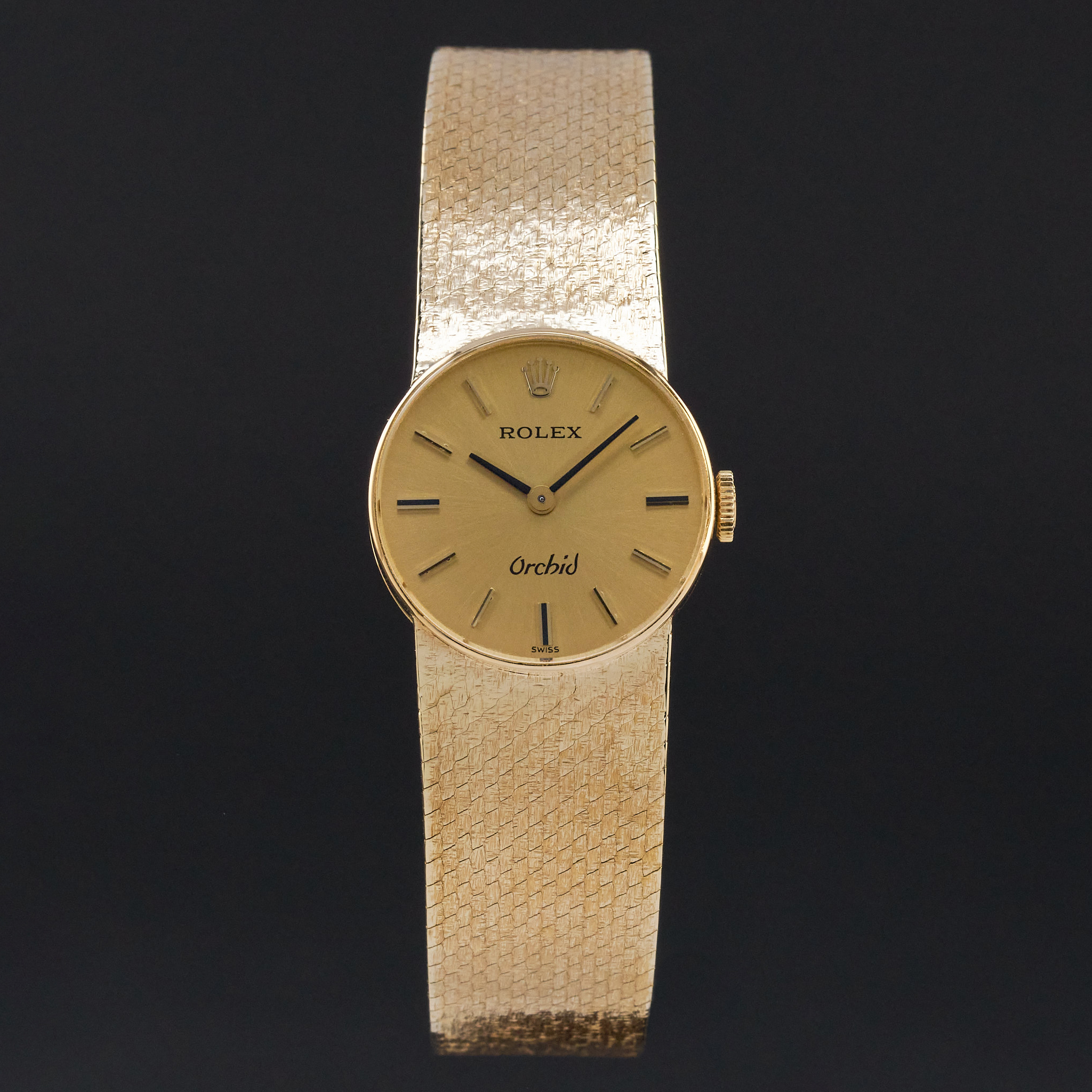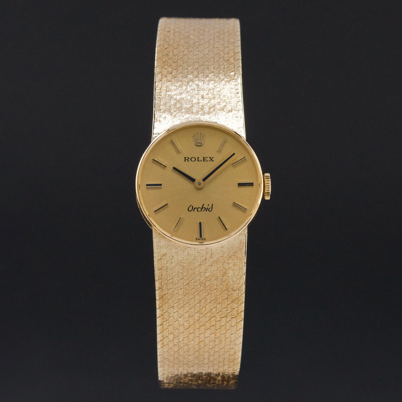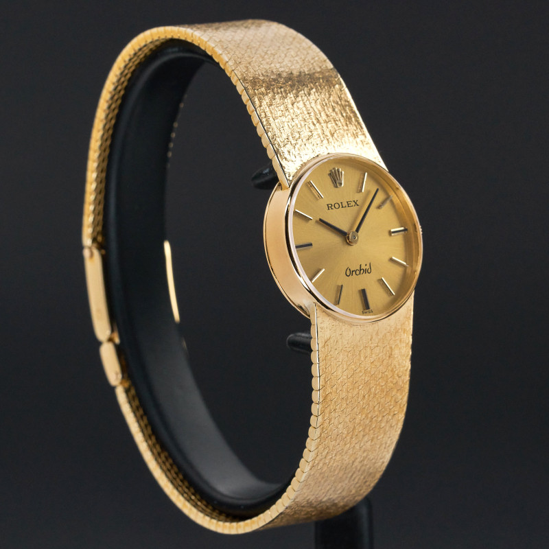 This Rolex Orchid 2671 features a Champagne dial and is crafted from 18K yellow gold, with a production year of 1975.