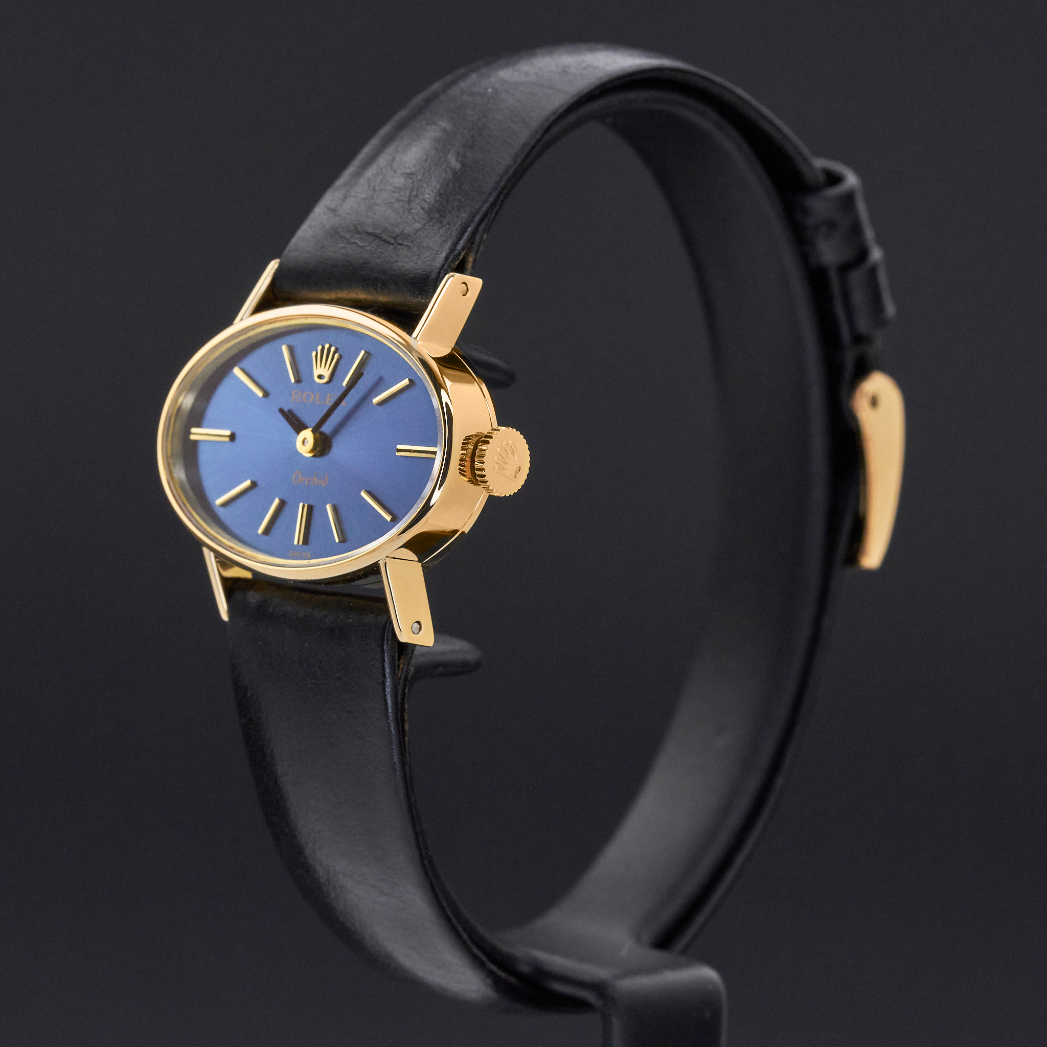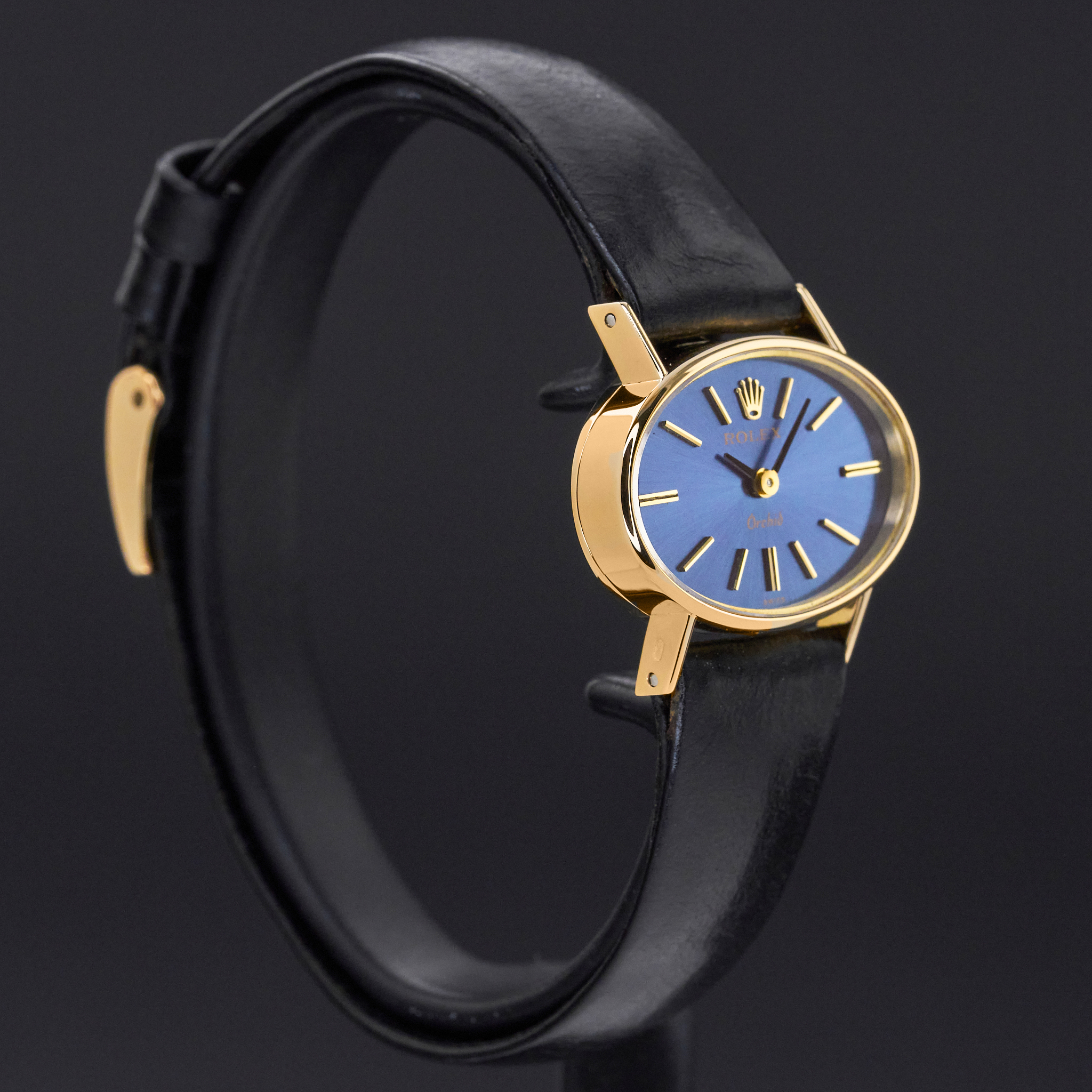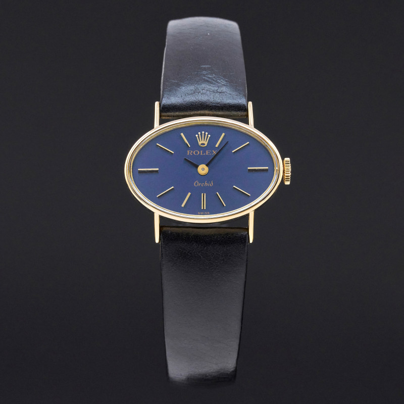 This Rolex Orchid 2674 features a Blue dial and is crafted from 18K yellow gold, with a production year of 1976.