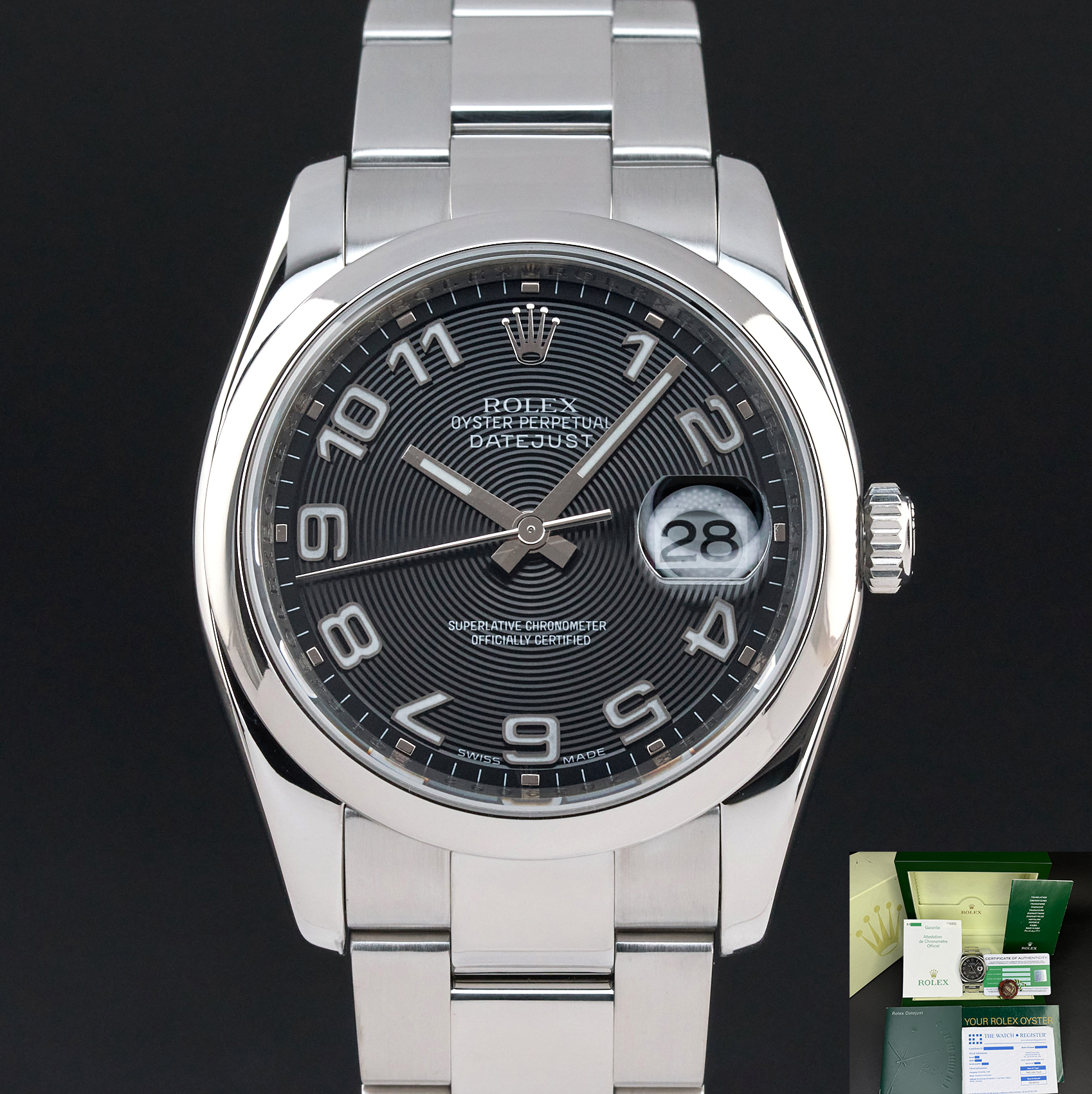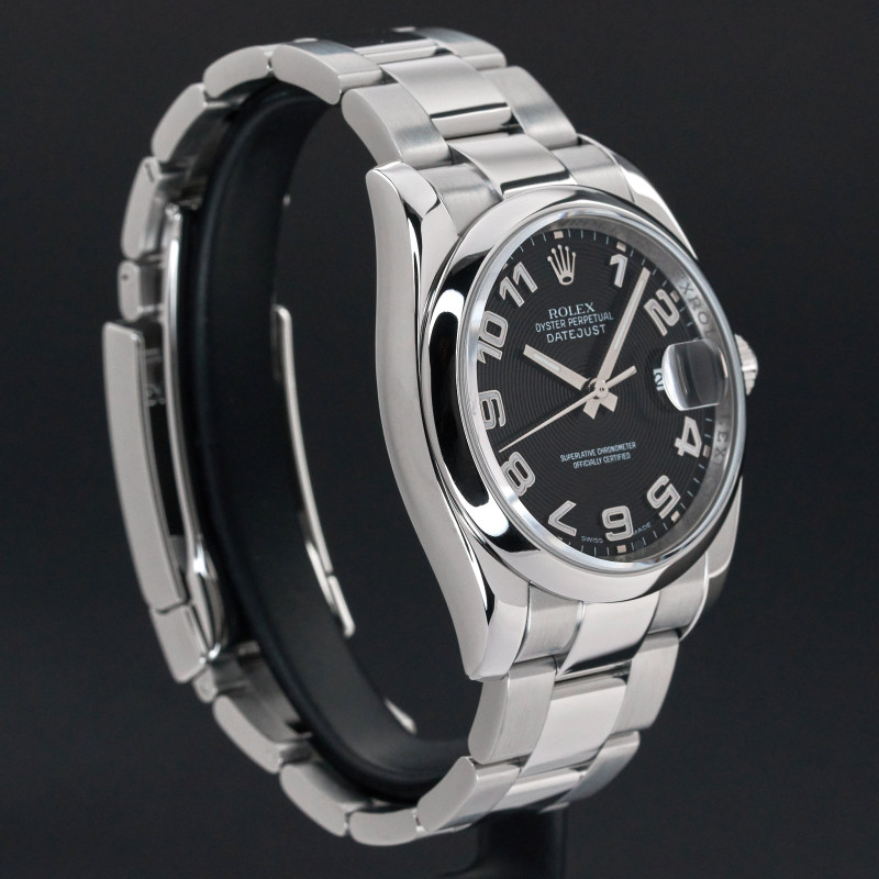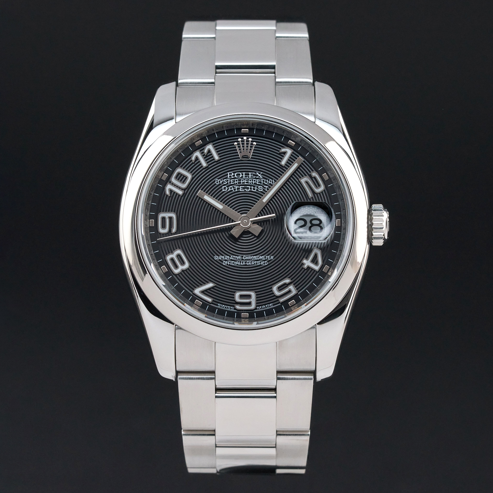 This Rolex Datejust 116200 features a Black concentric Arabic dial and is crafted from stainless steel, with a production year of 2006.