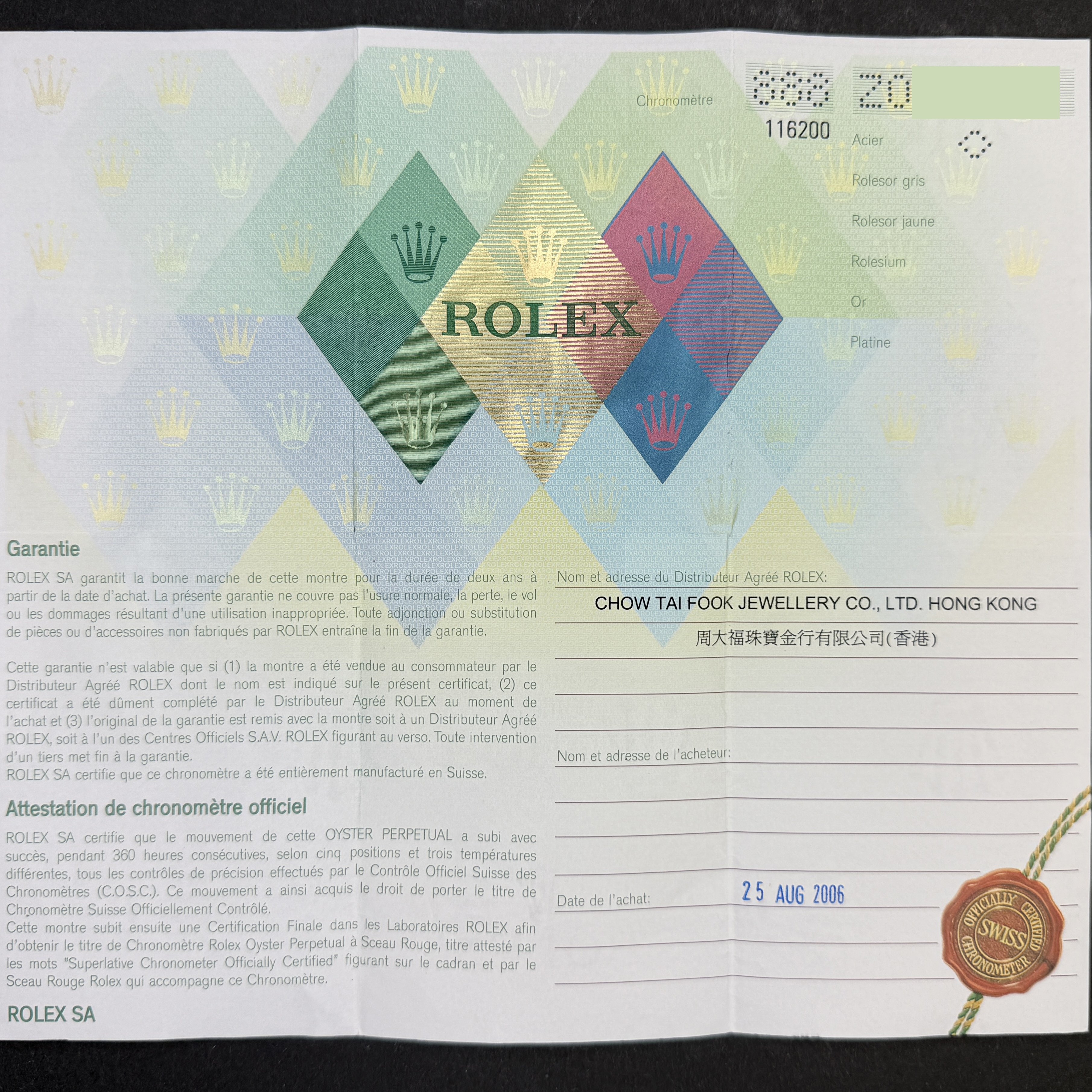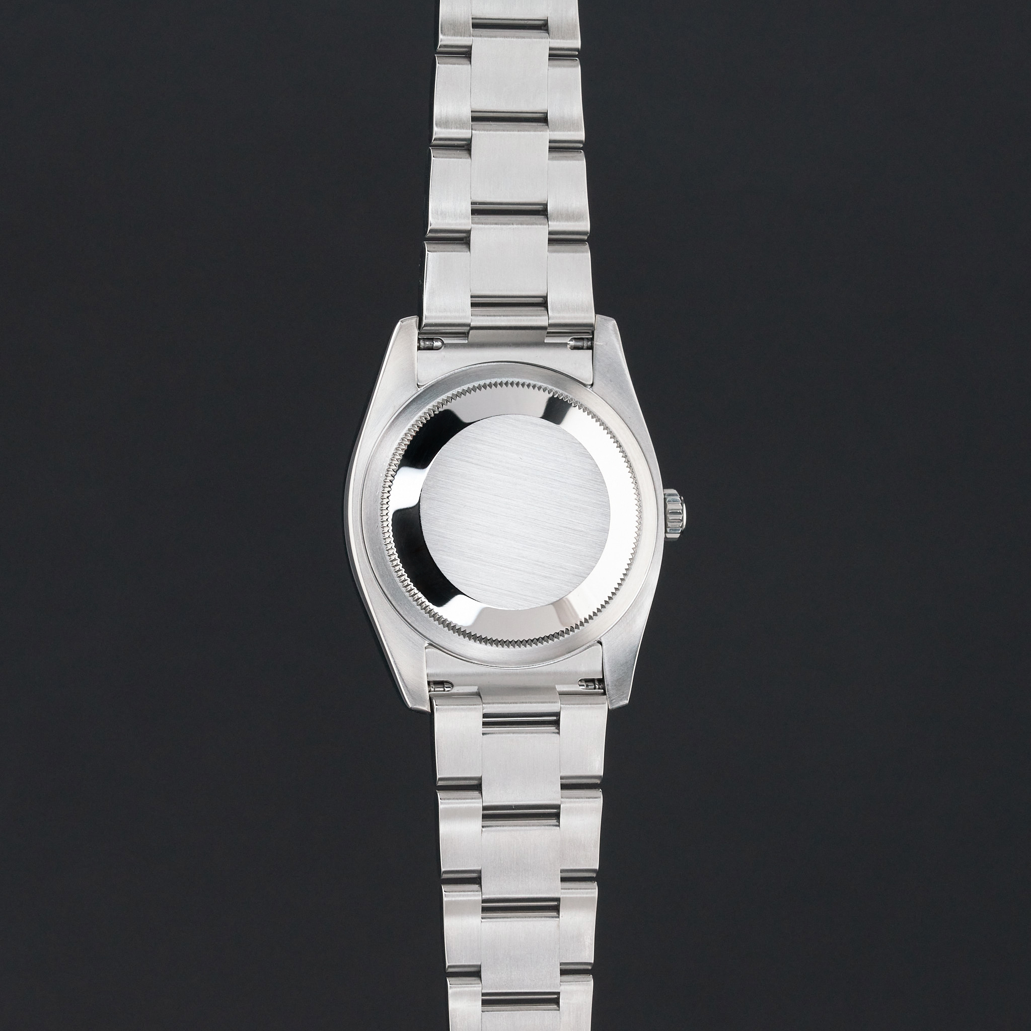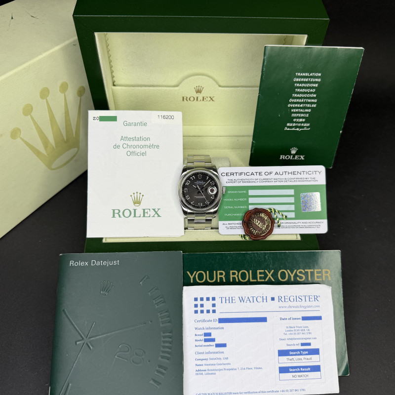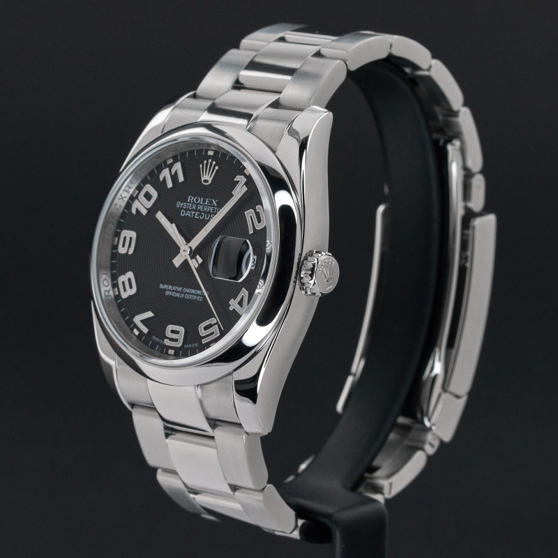This Rolex Datejust 116200 features a Black concentric Arabic dial and is crafted from stainless steel, with a production year of 2006.