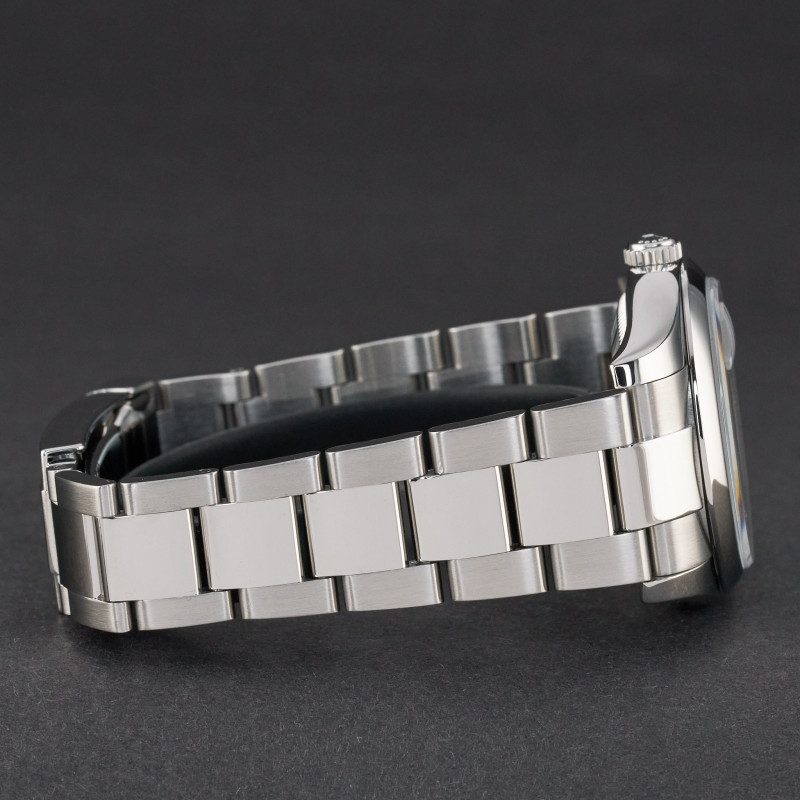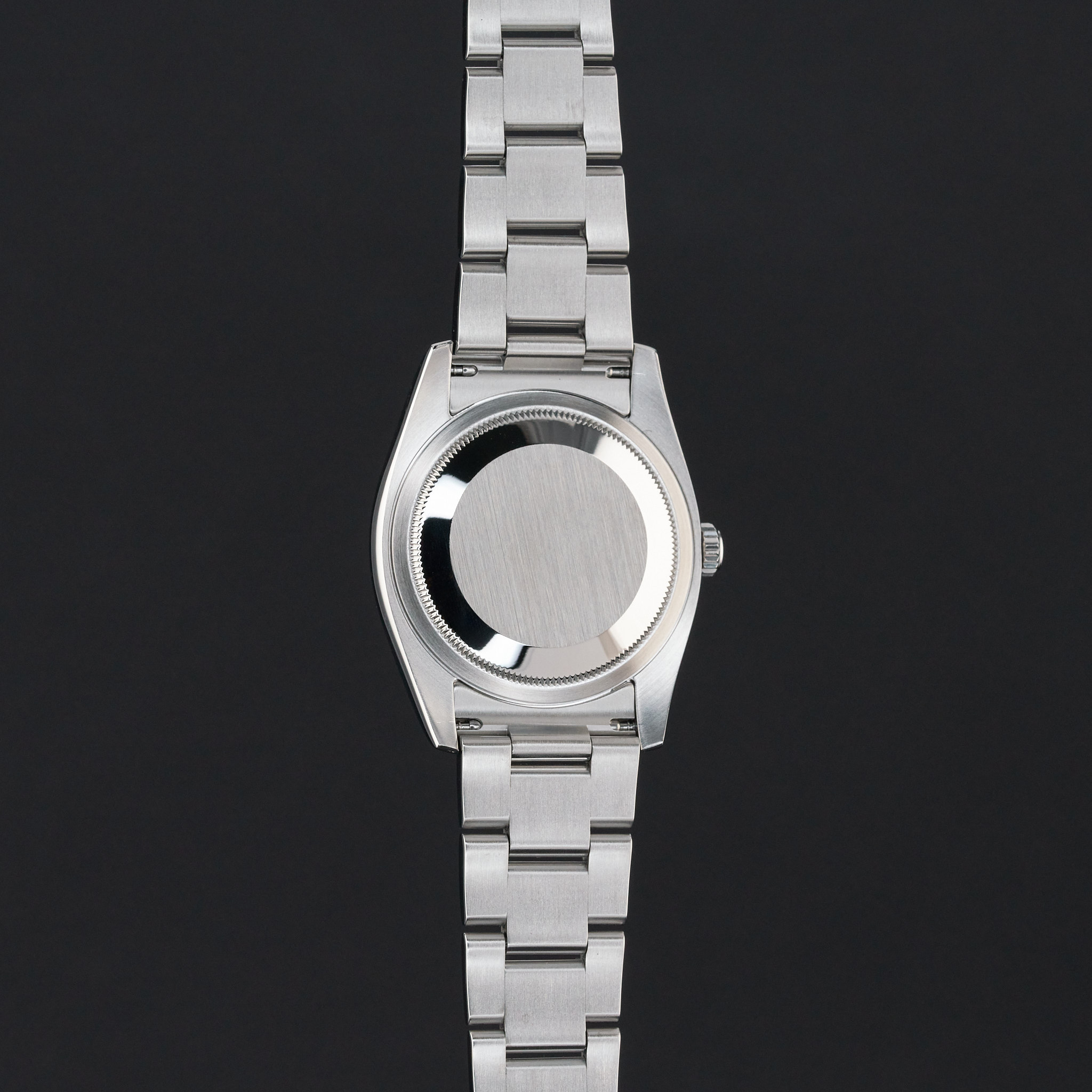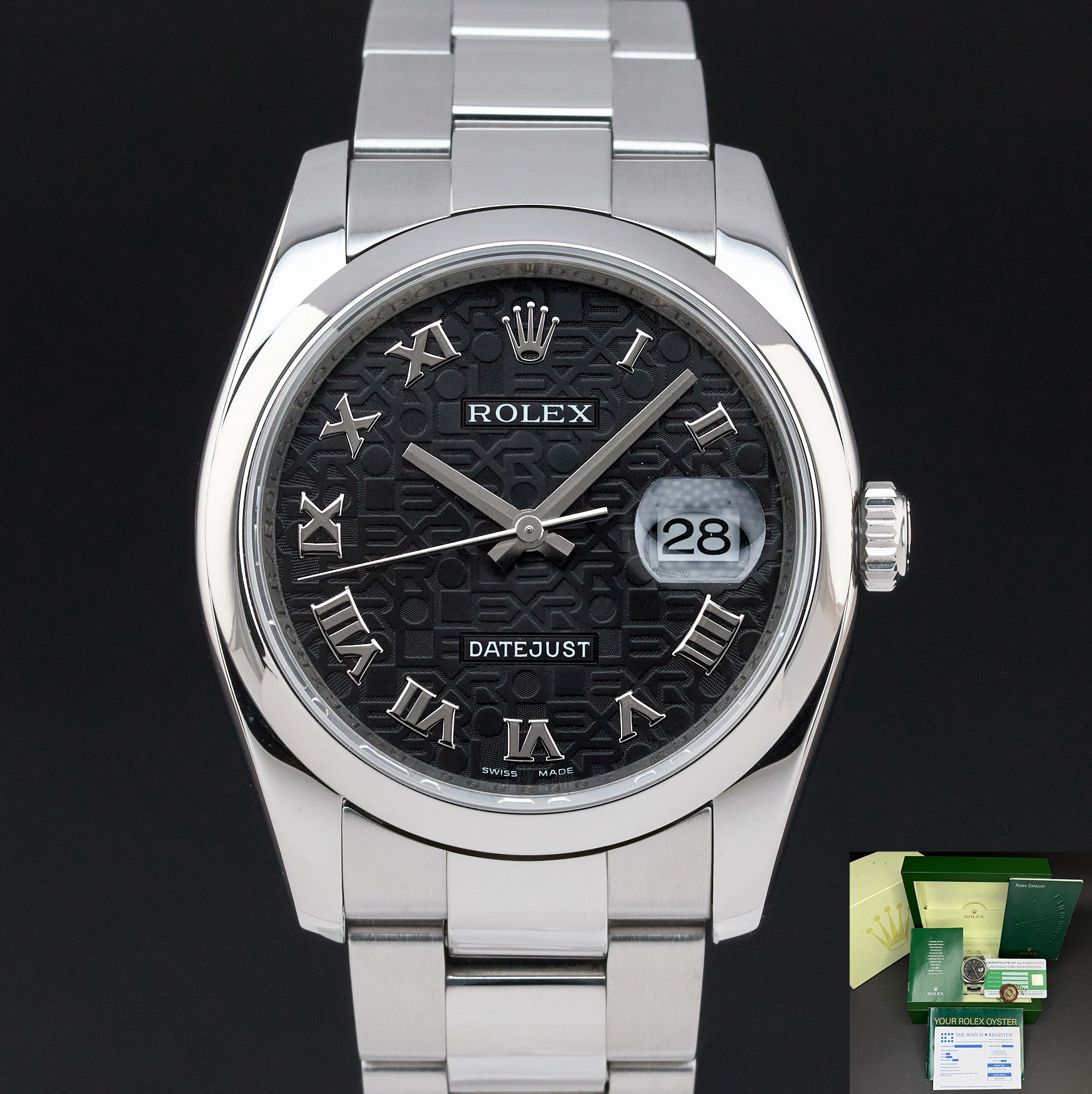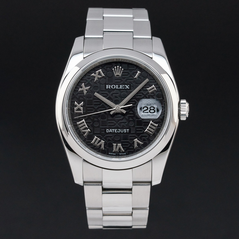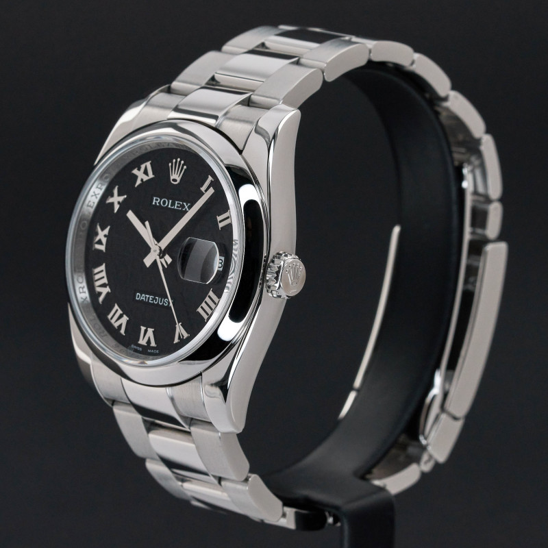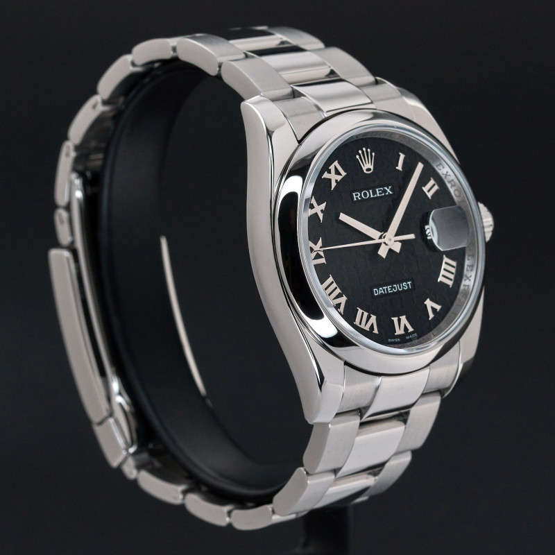 This Rolex Datejust 116200 features a Black jubilee Roman dial and is crafted from stainless steel, with a production year of 2006.