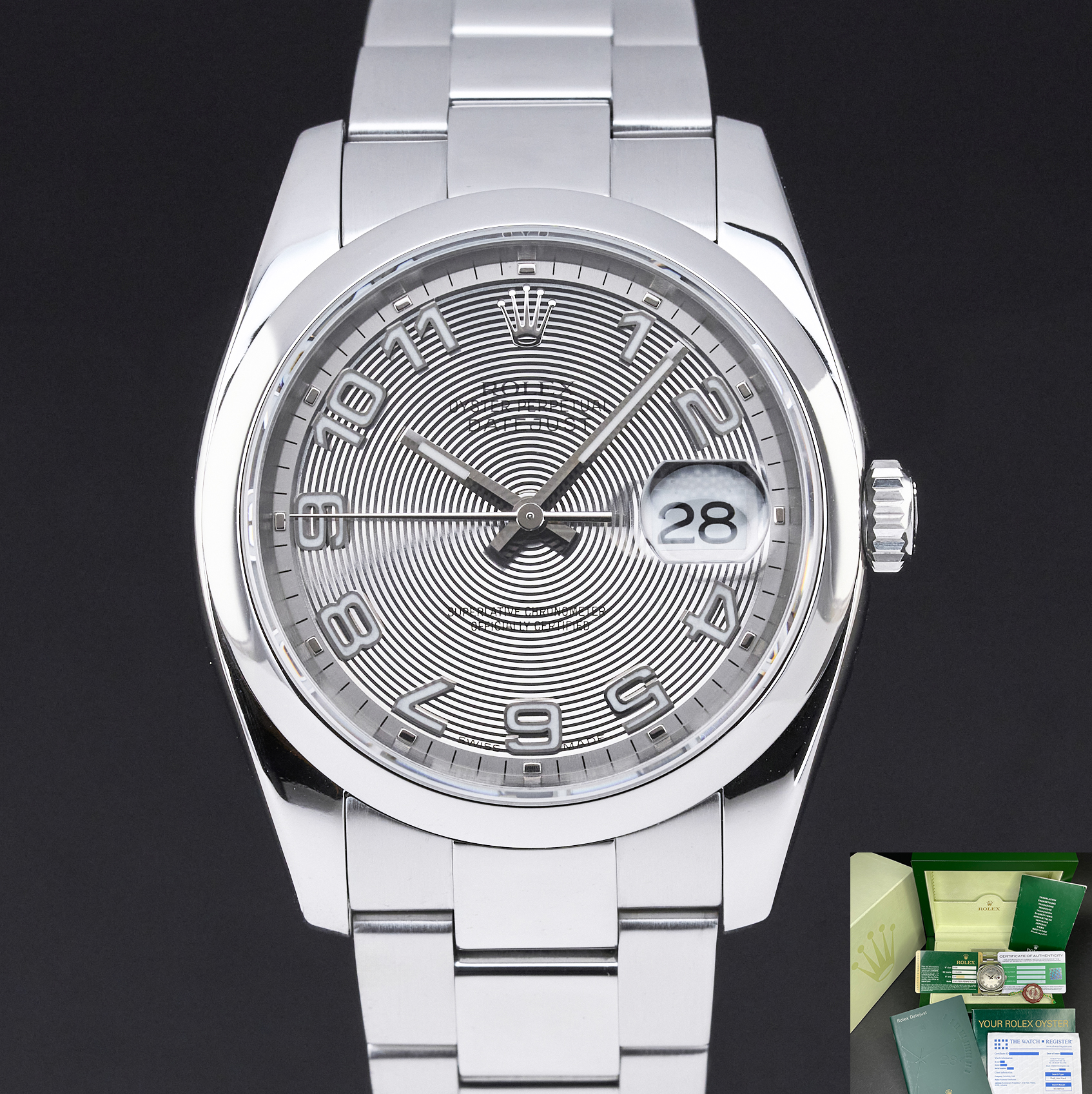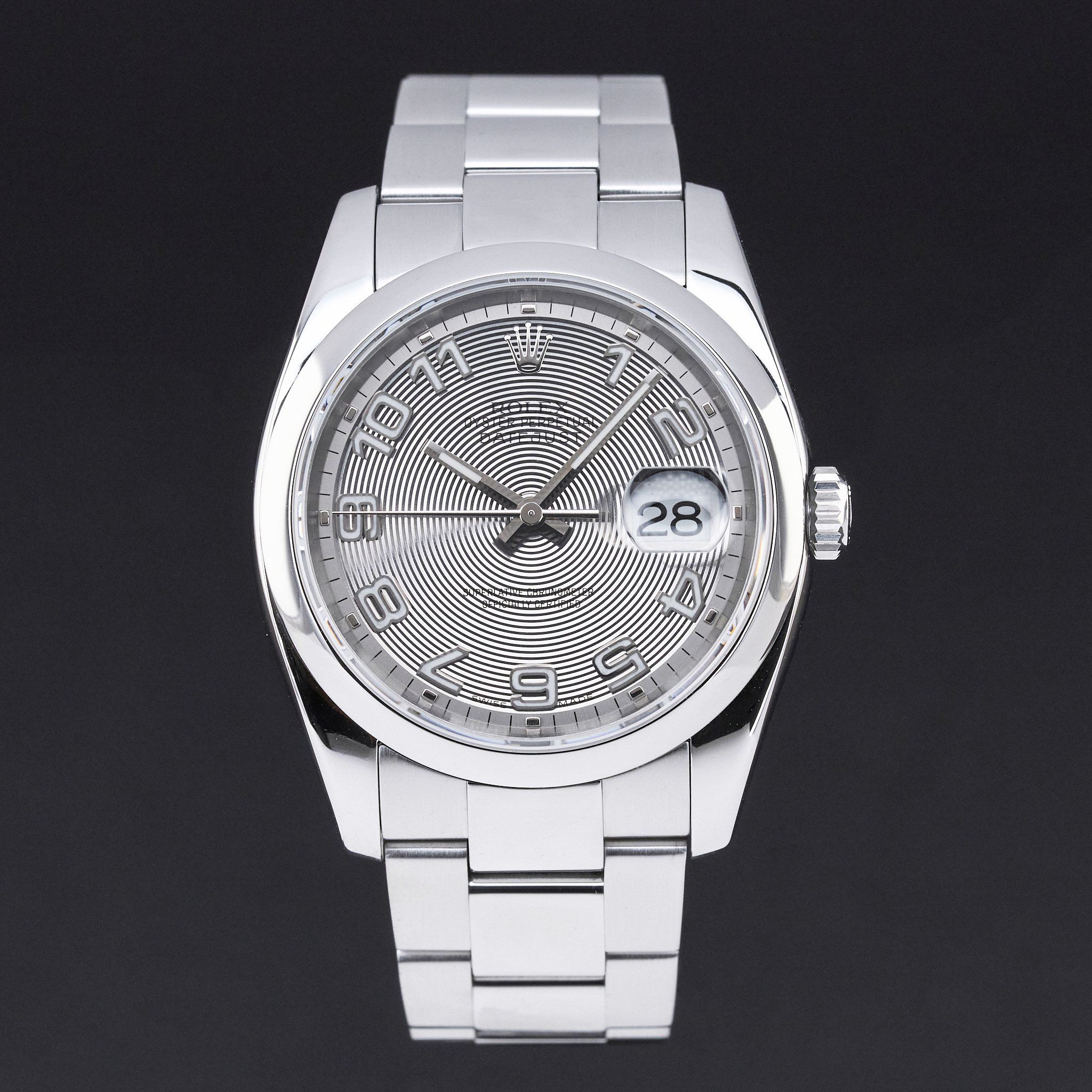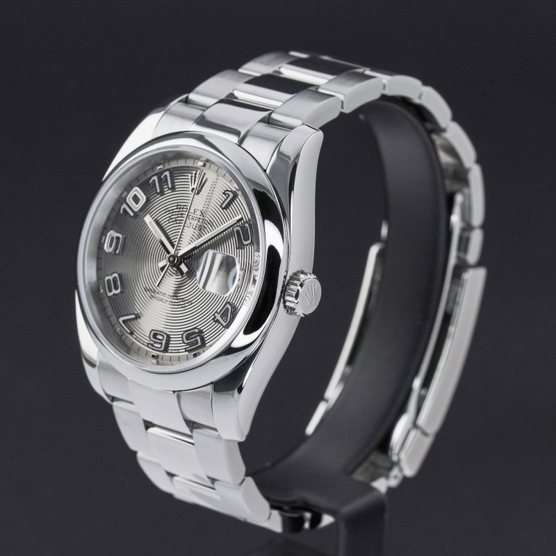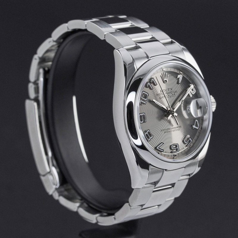 This Rolex Datejust 116200 features a Silver concentric Arabic dial and is crafted from stainless steel, with a production year of 2006.