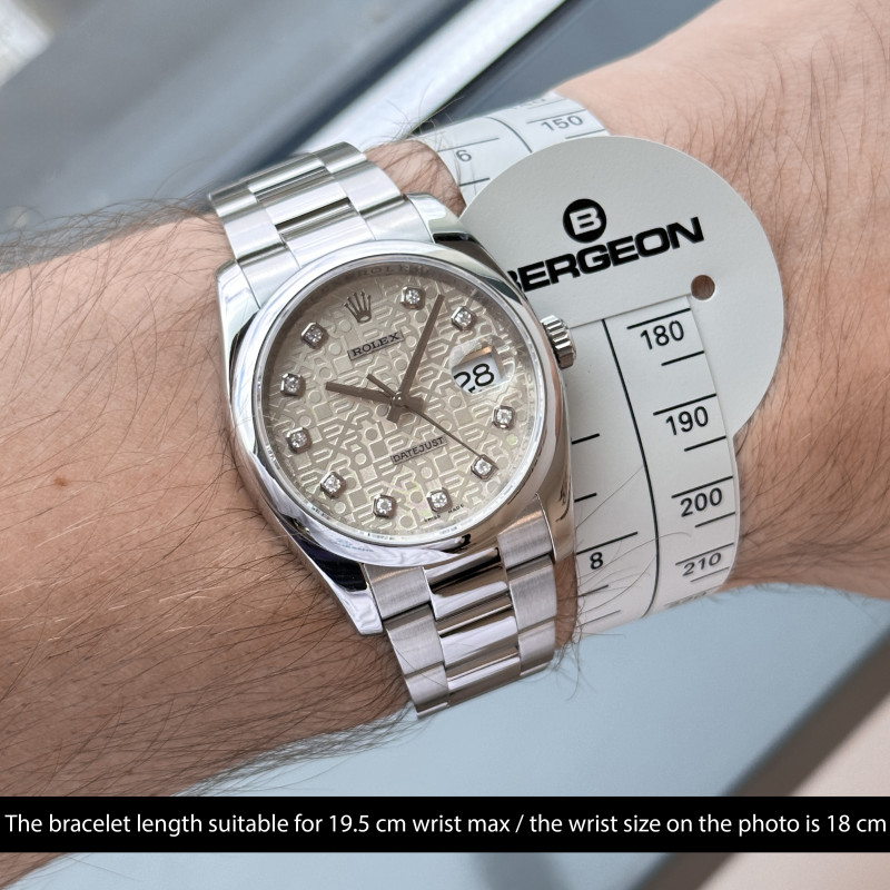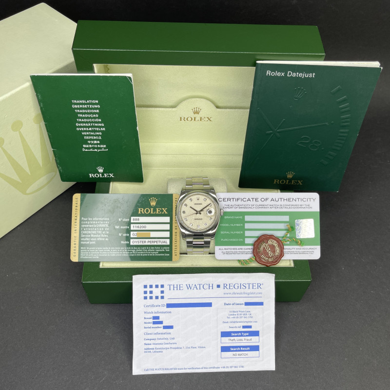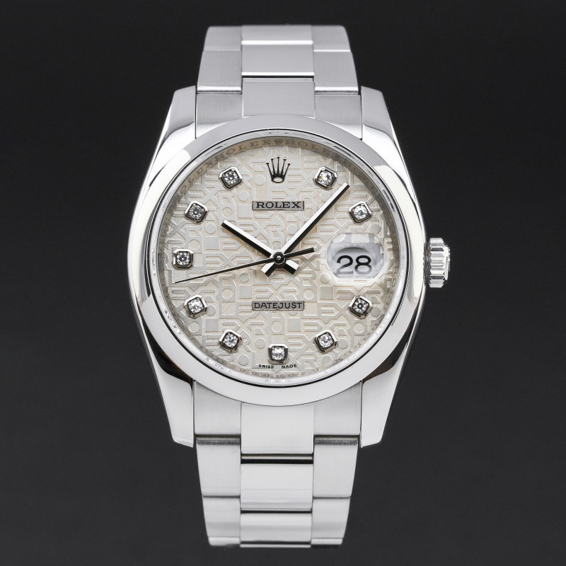 This Rolex Datejust 116200 features a Silver jubilee diamond dial and is crafted from stainless steel, with a production year of 2010.