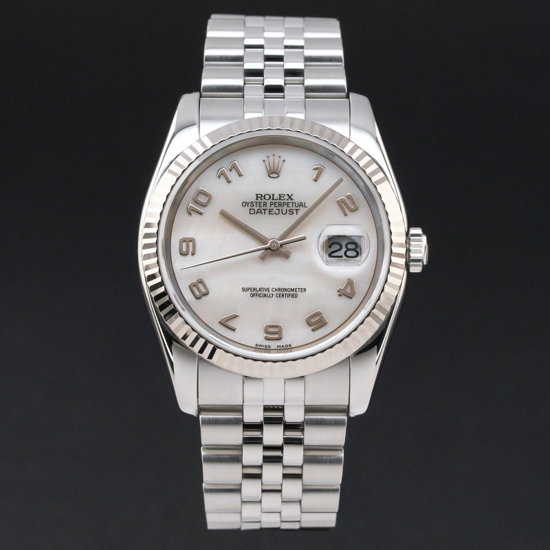This Rolex Datejust 116234 features a Silver Mother of Pearl Arabic dial and is crafted from stainless steel, with a production year of 2006.