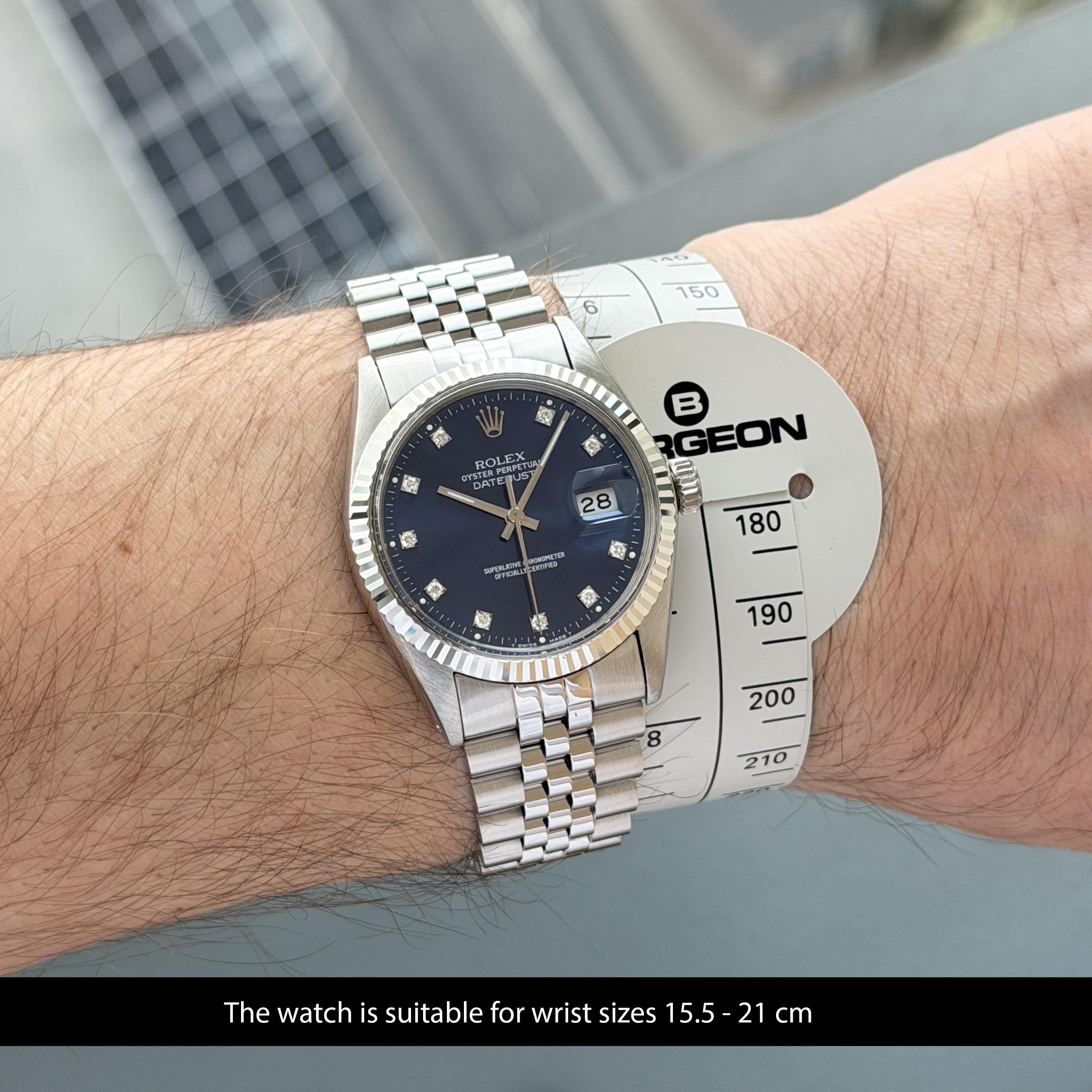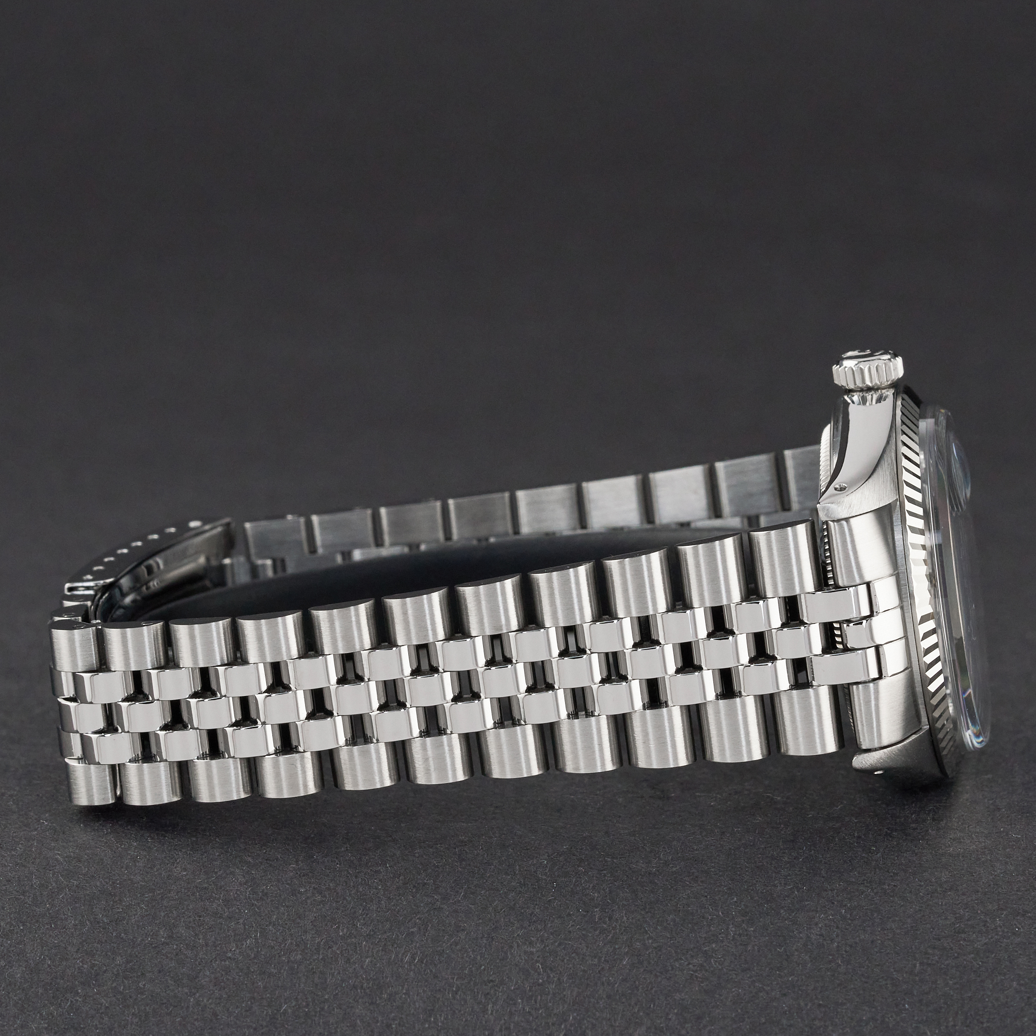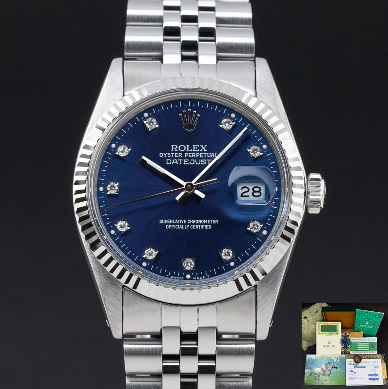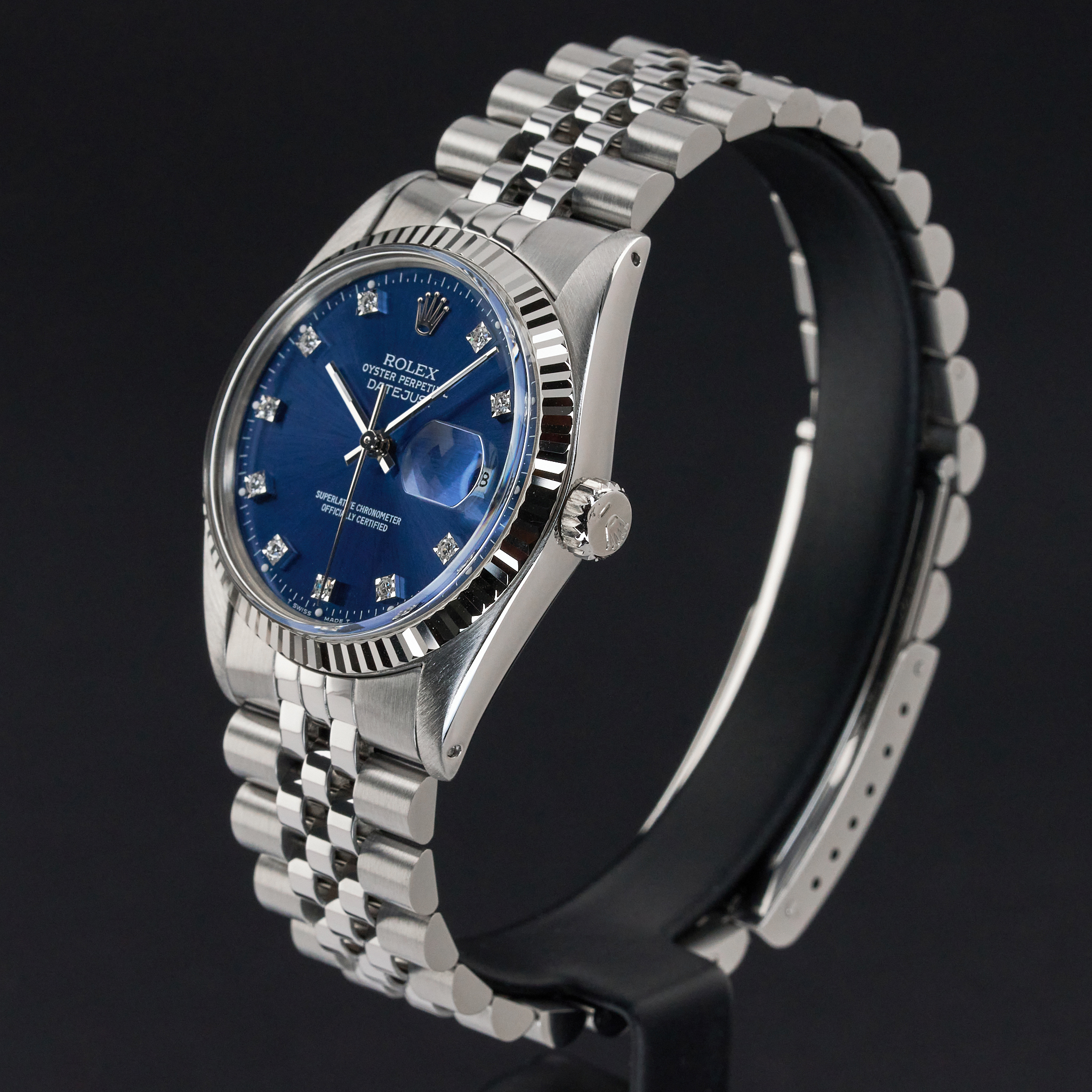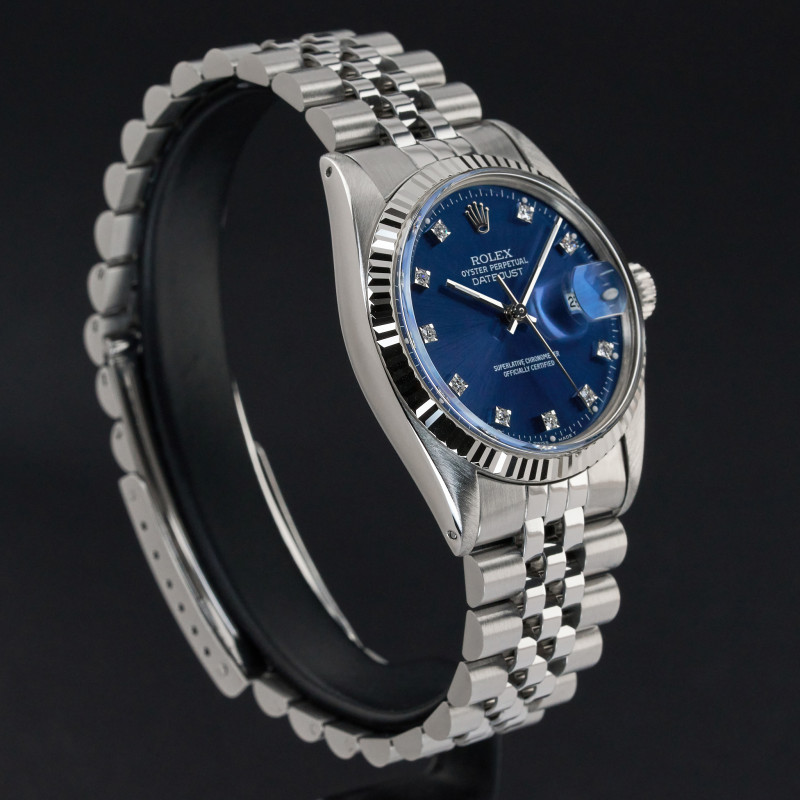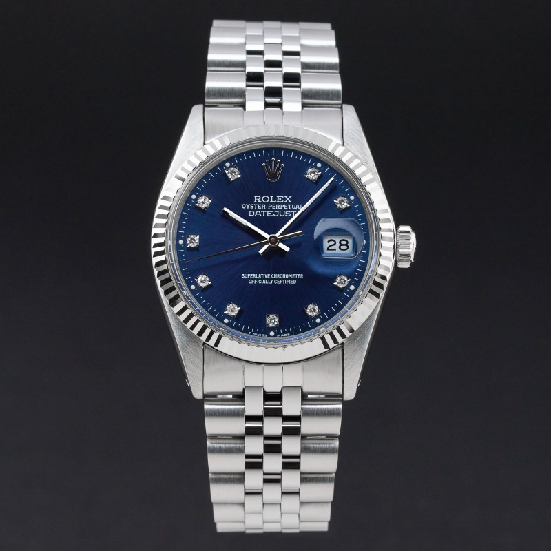 This Rolex Datejust 16014 features a Blue small diamond dial and is crafted from stainless steel, with a production year of 1988.