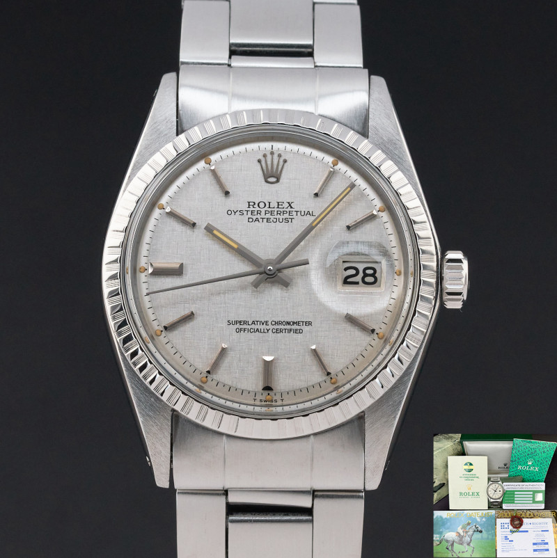 This Rolex Datejust 1603 features a Silver linen dial and is crafted from stainless steel, with a production year of 1973.