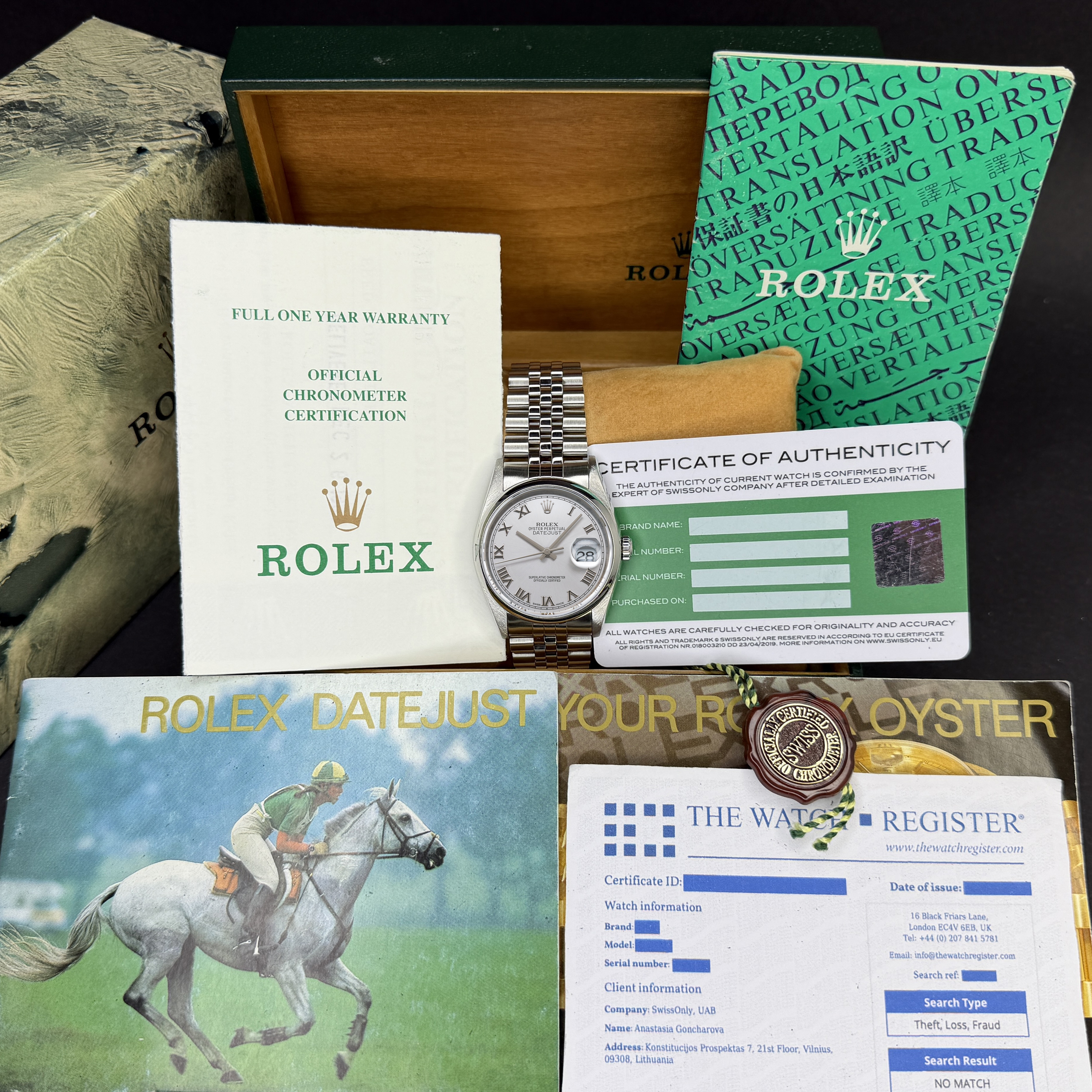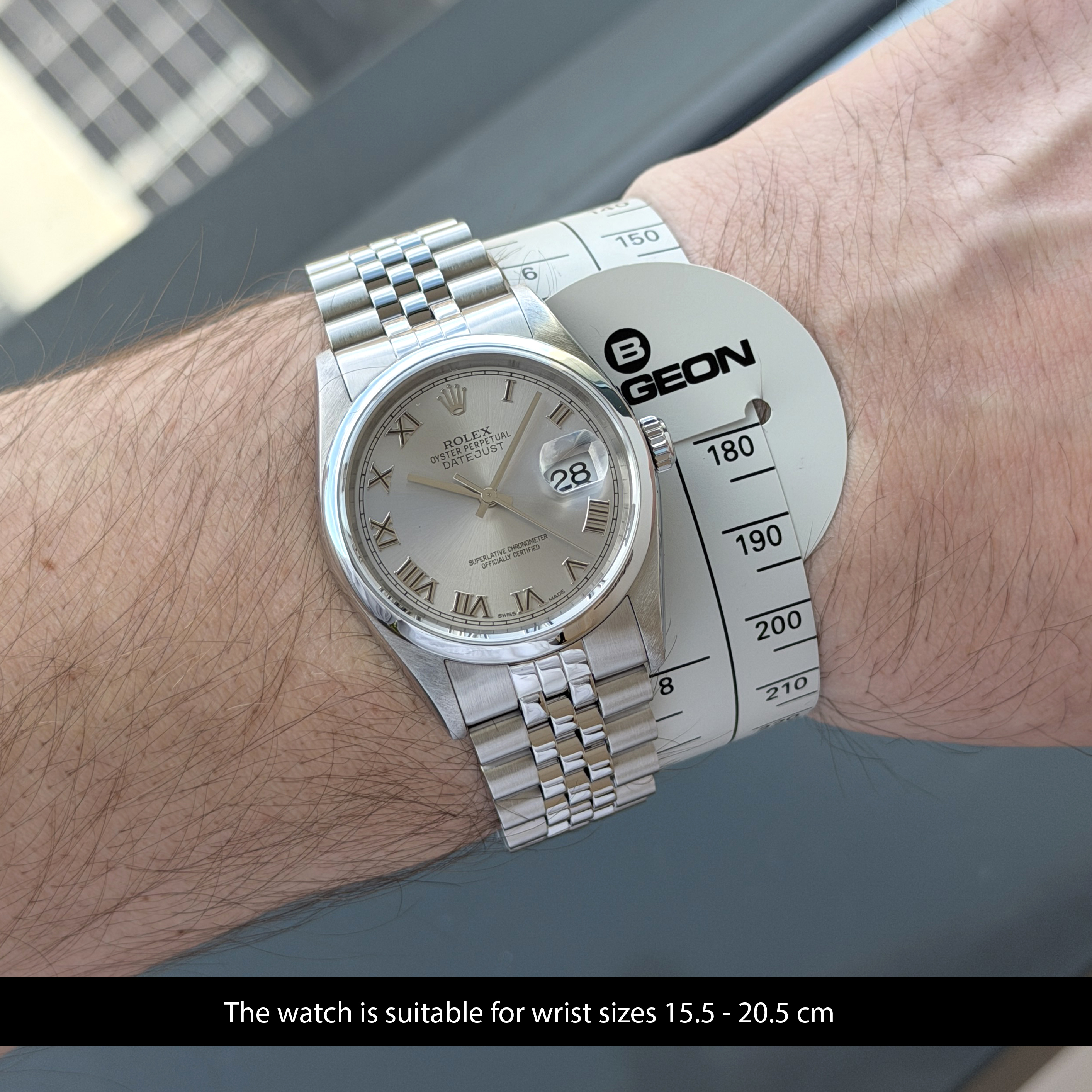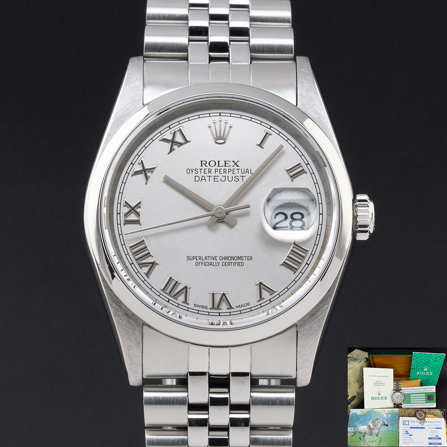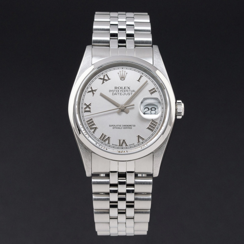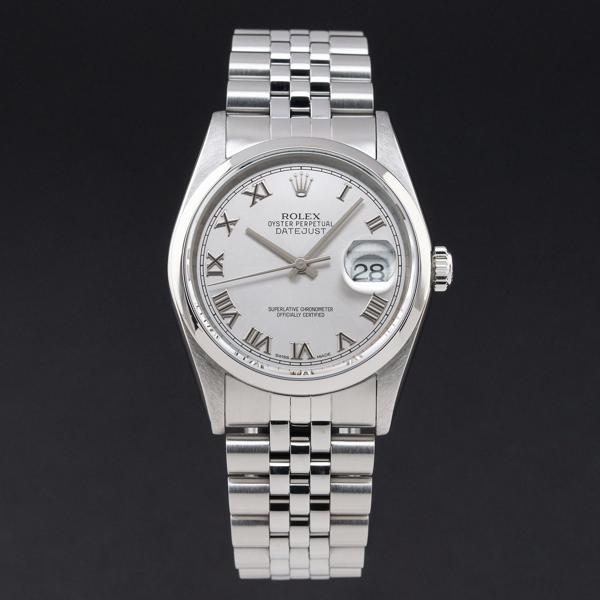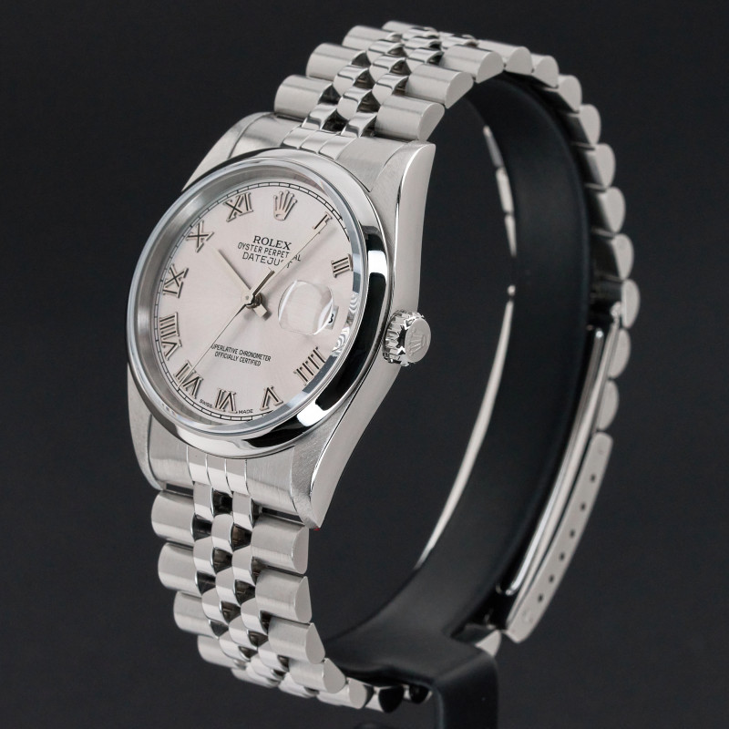 This Rolex Datejust 16200 features a Silver Roman dial and is crafted from stainless steel, with a production year of 1997.