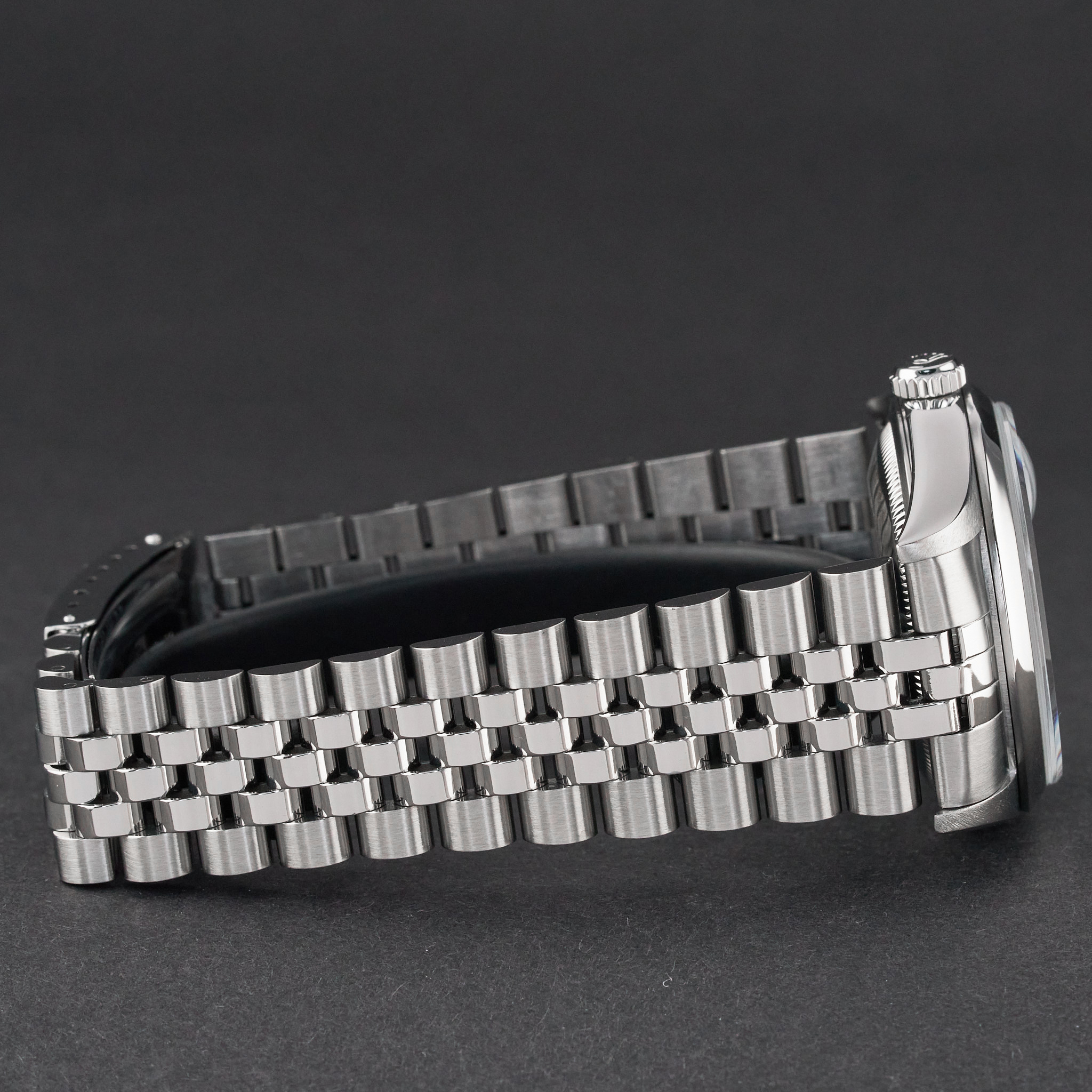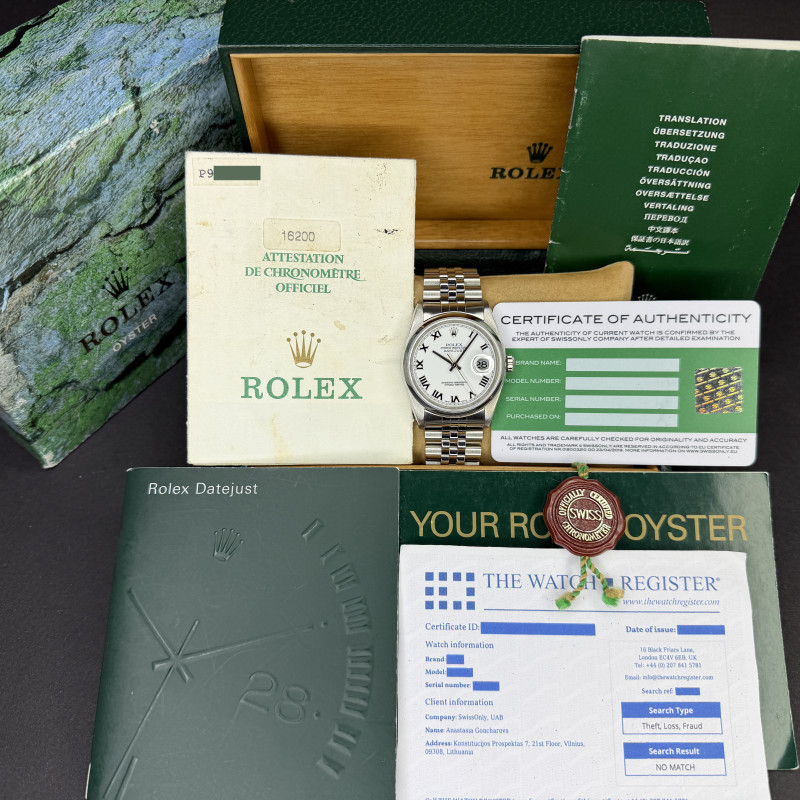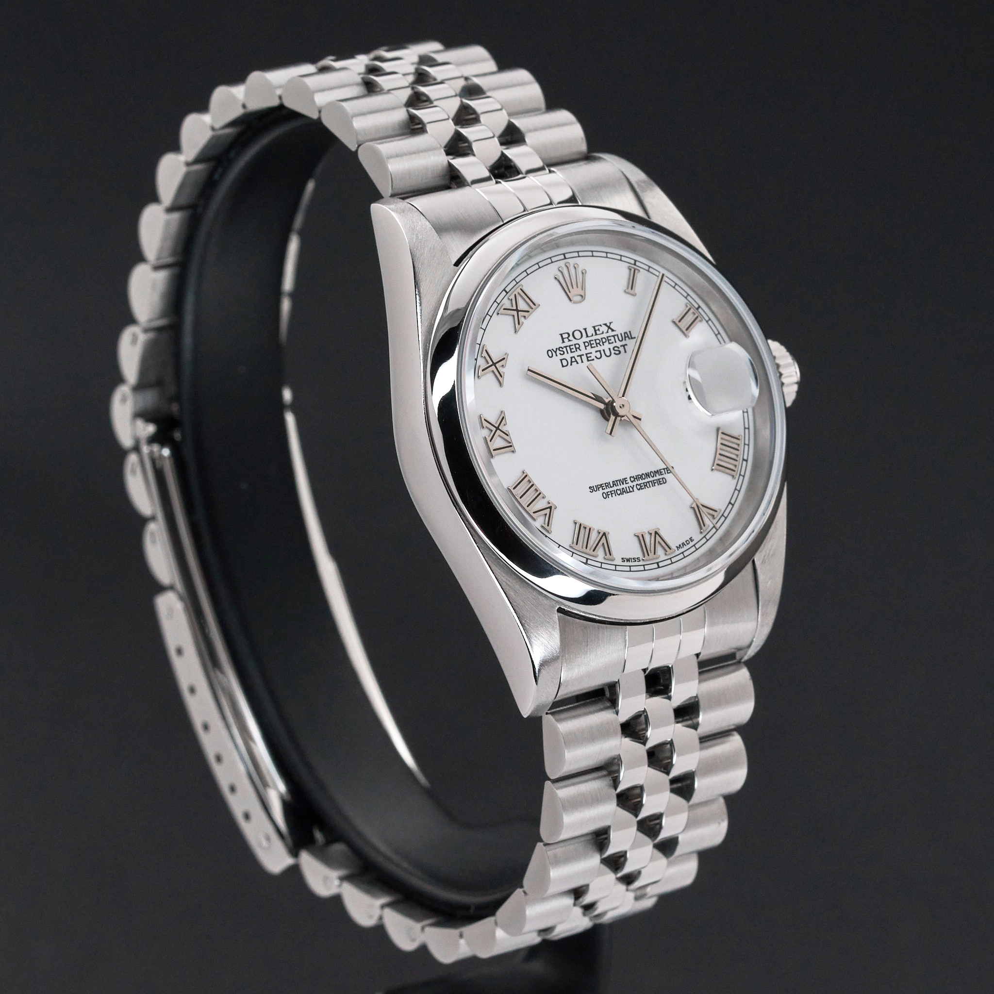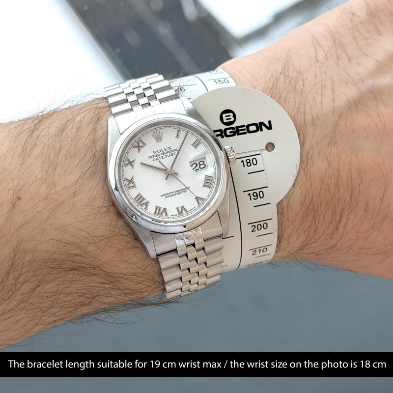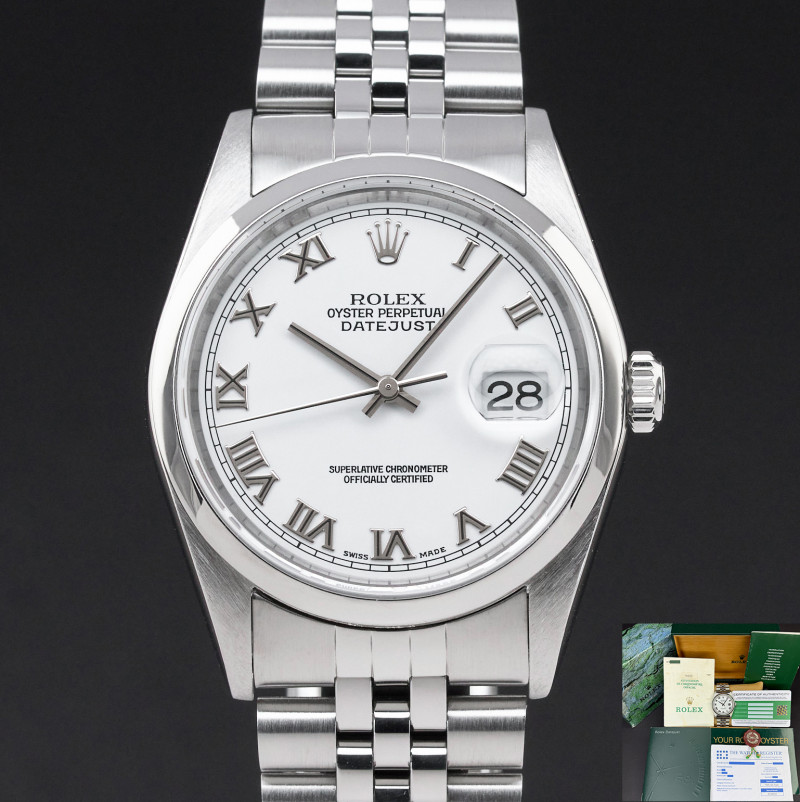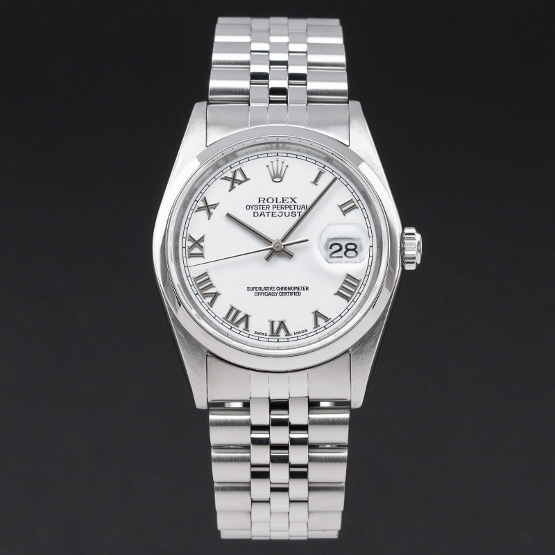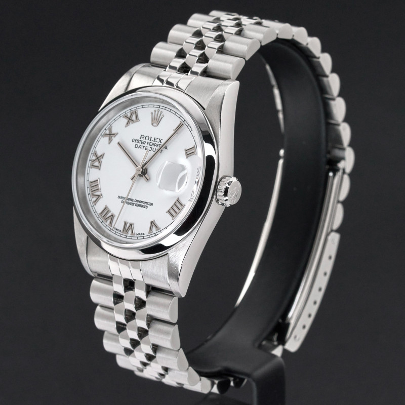 This Rolex Datejust 16200 features a White Roman dial and is crafted from stainless steel, with a production year of 2000.