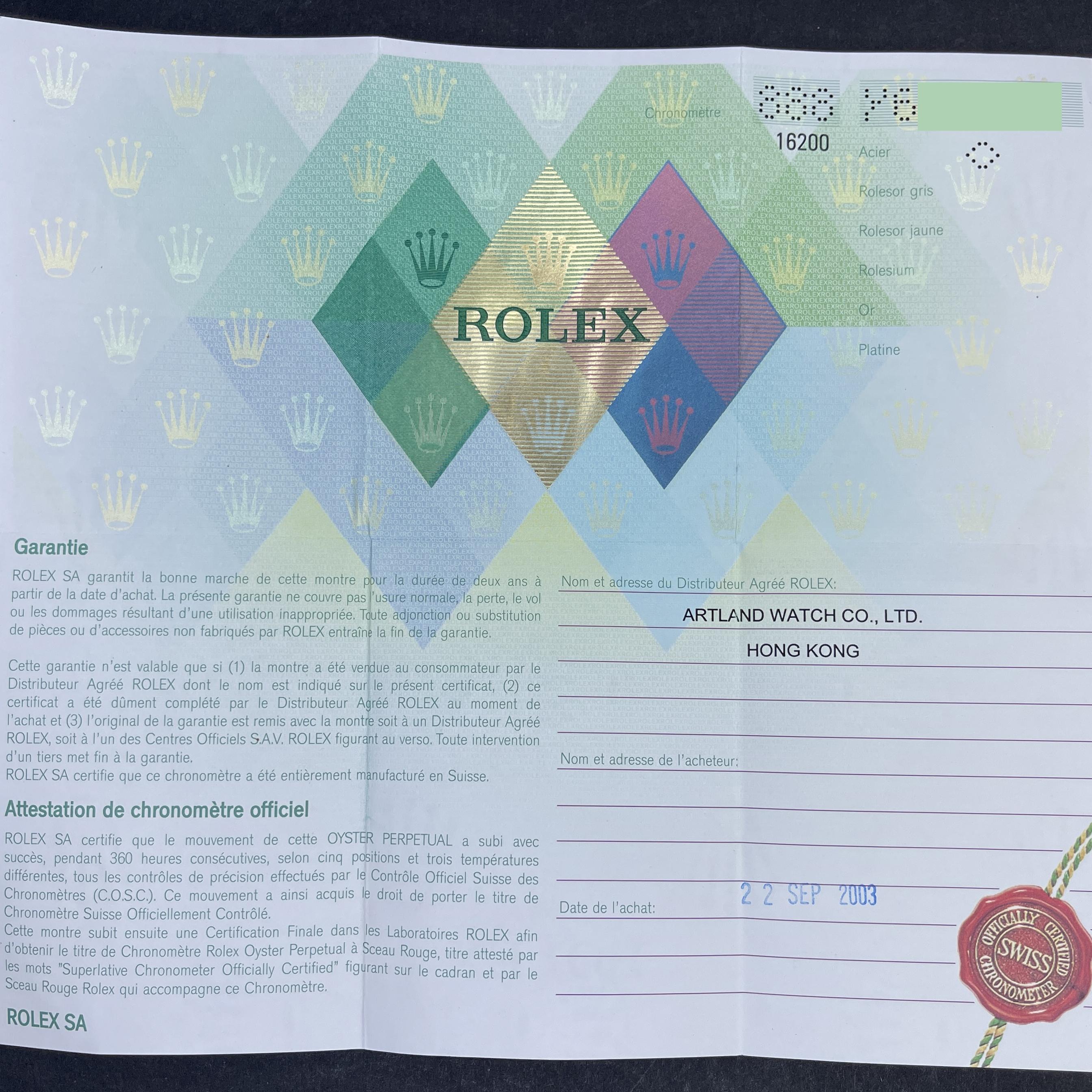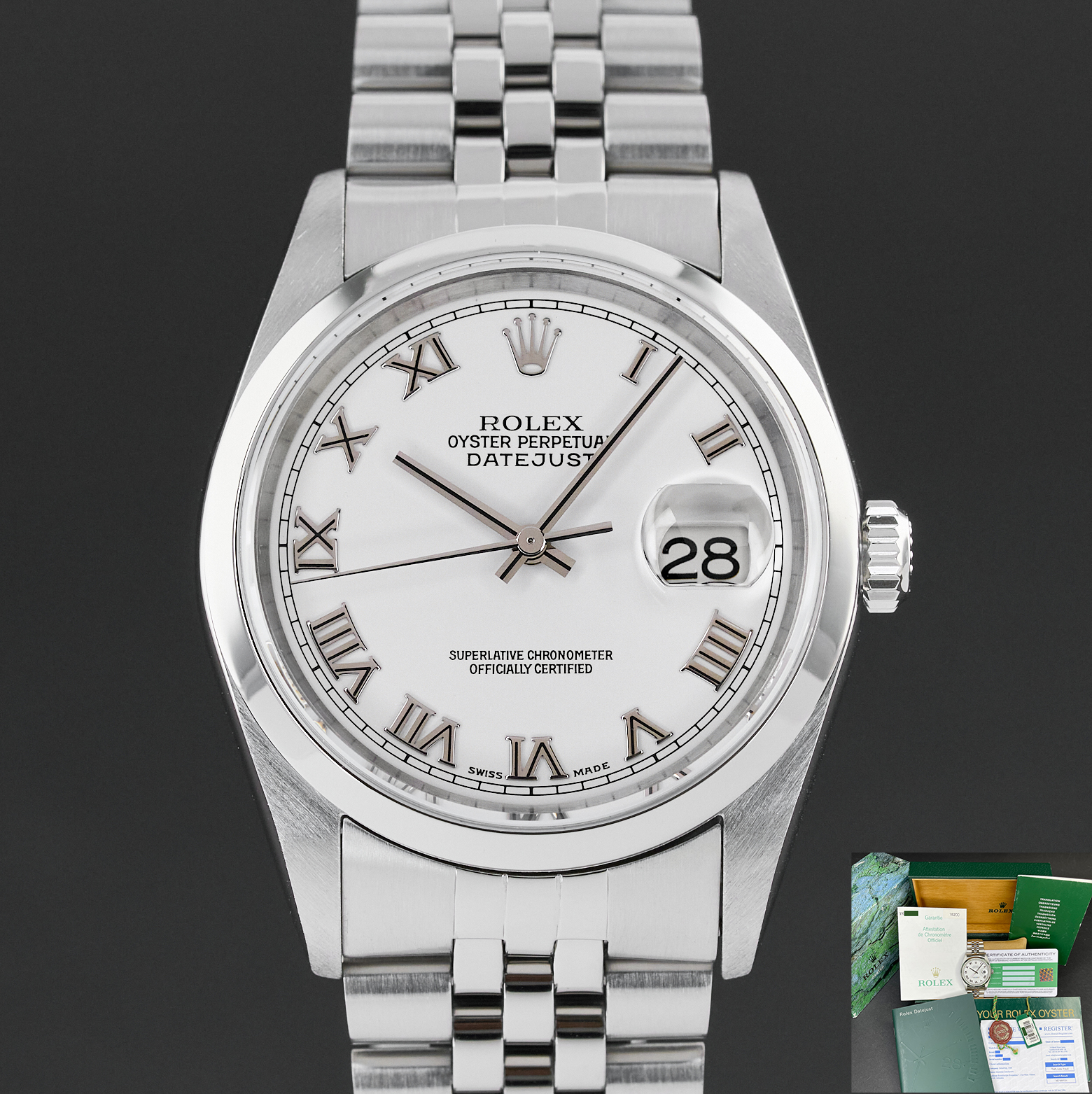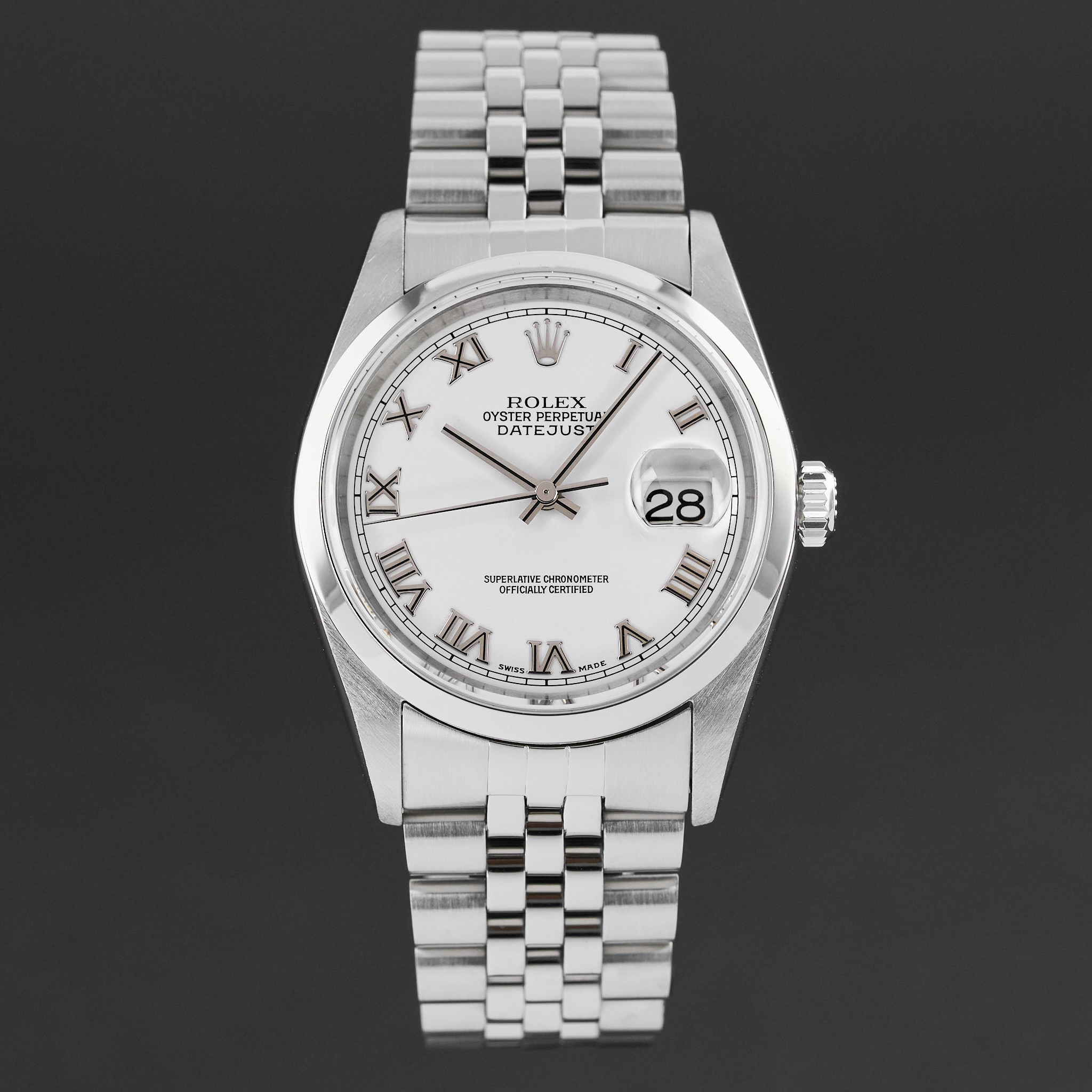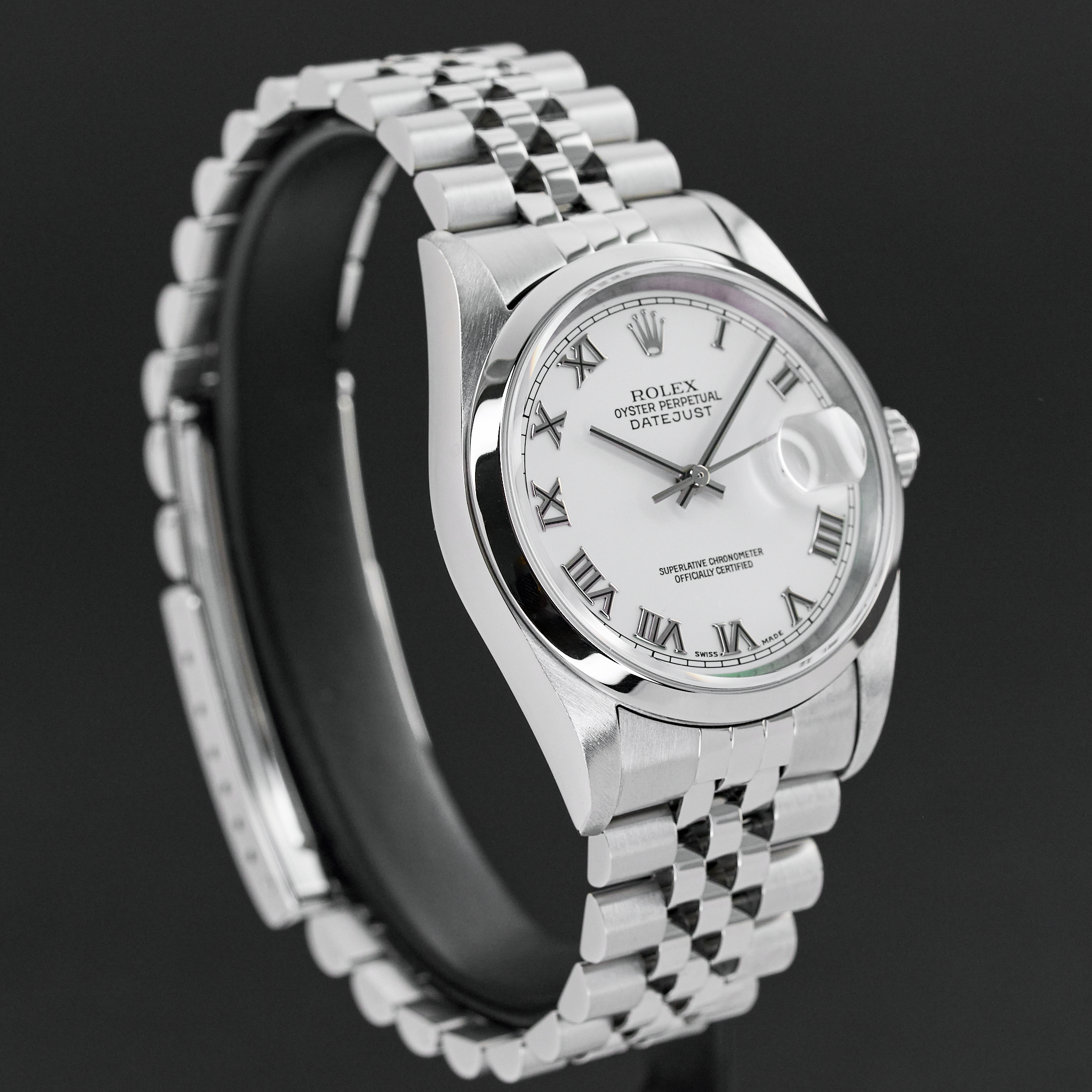This Rolex Datejust 16200 features a White Roman dial and is crafted from stainless steel, with a production year of 2002.