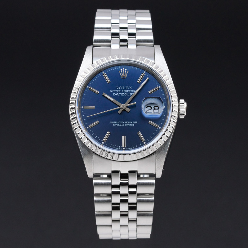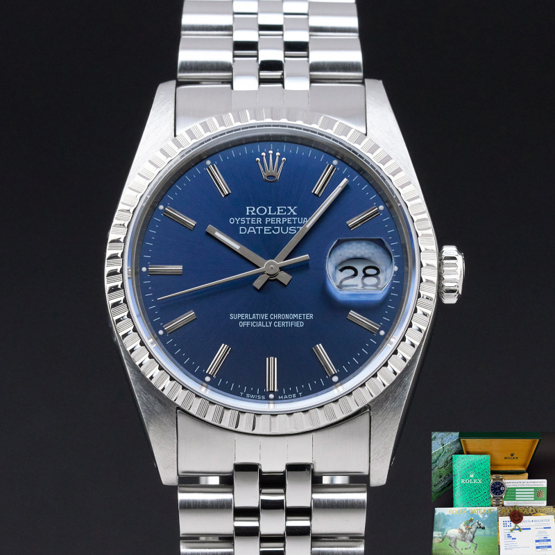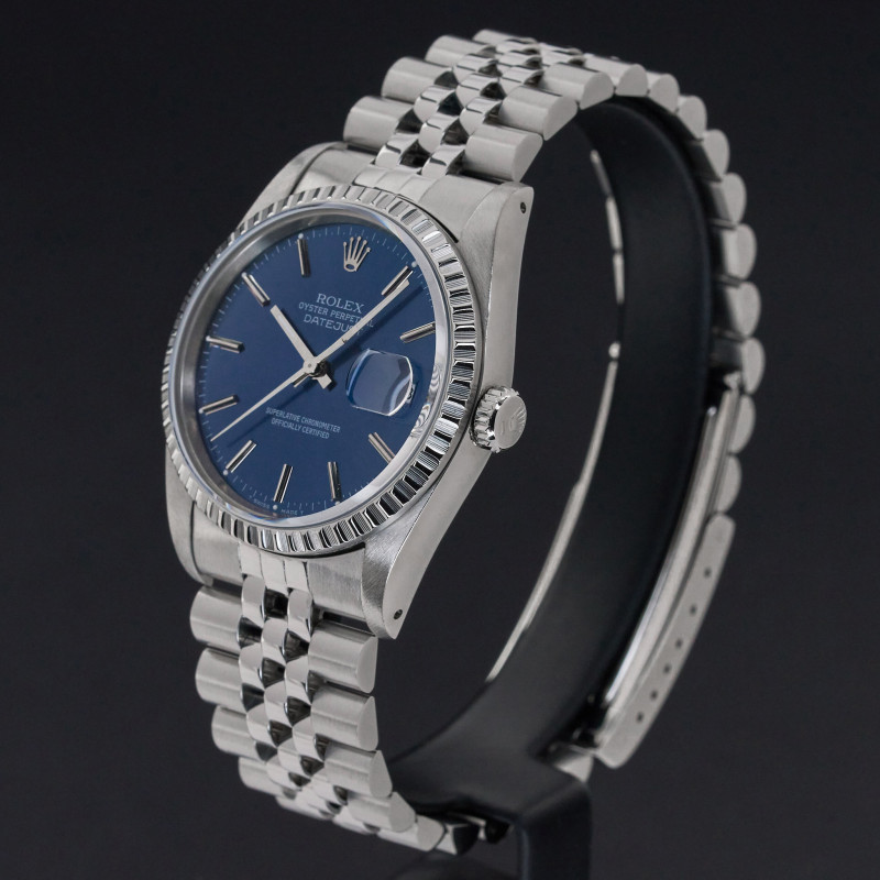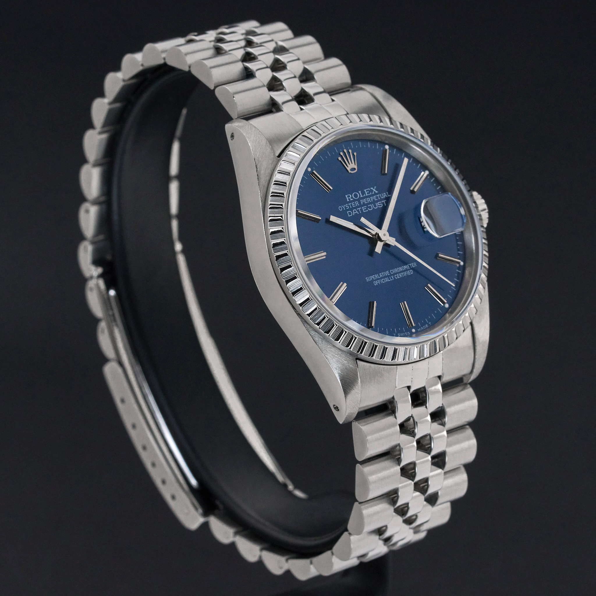 This Rolex Datejust 16220 features a Blue dial and is crafted from stainless steel, with a production year of 1988.