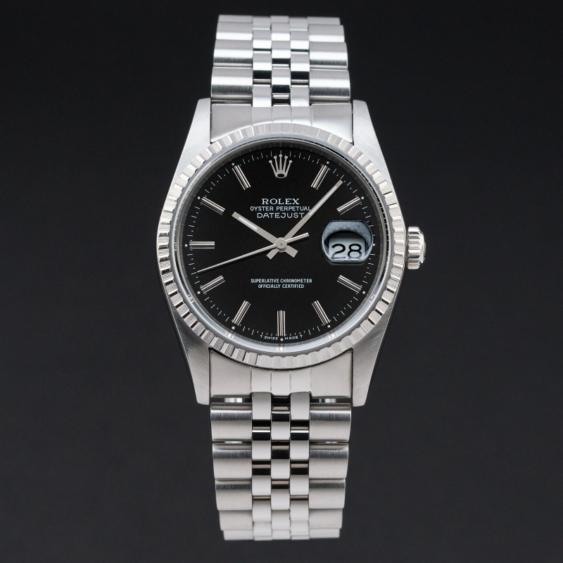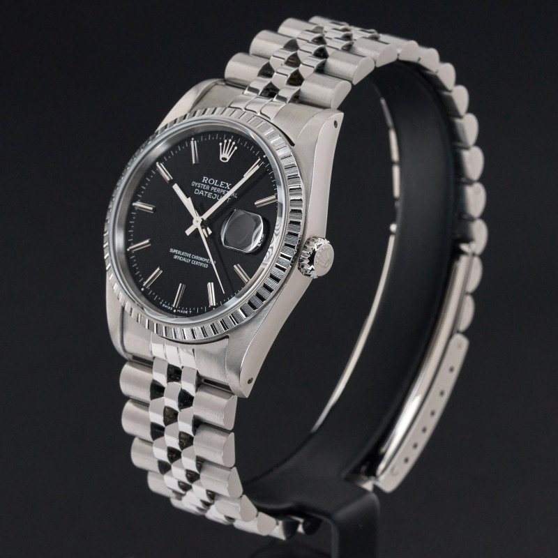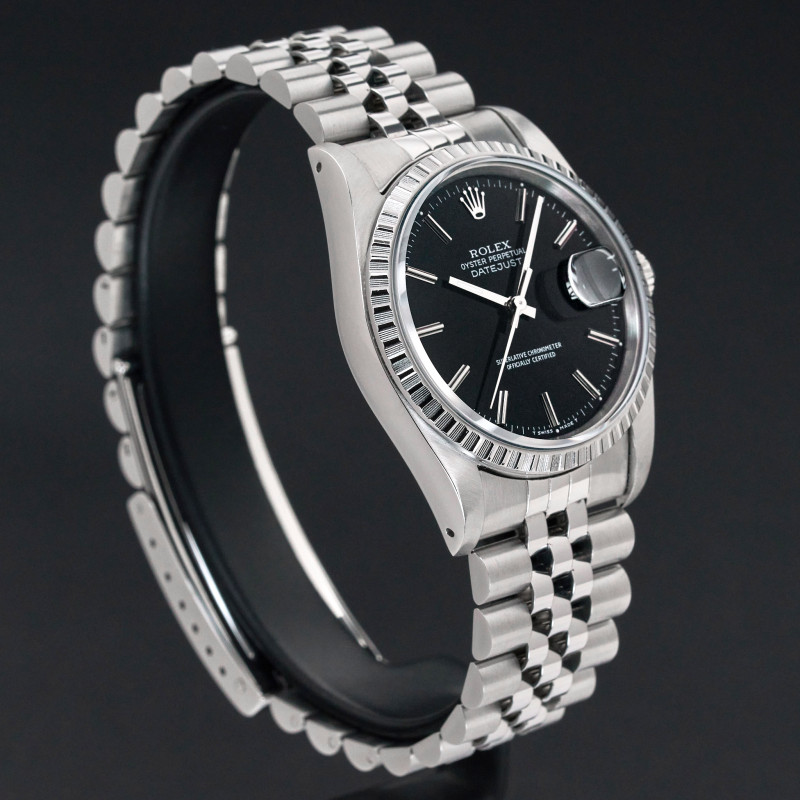 This Rolex Datejust 16220 features a Black dial and is crafted from stainless steel, with a production year of 1989.