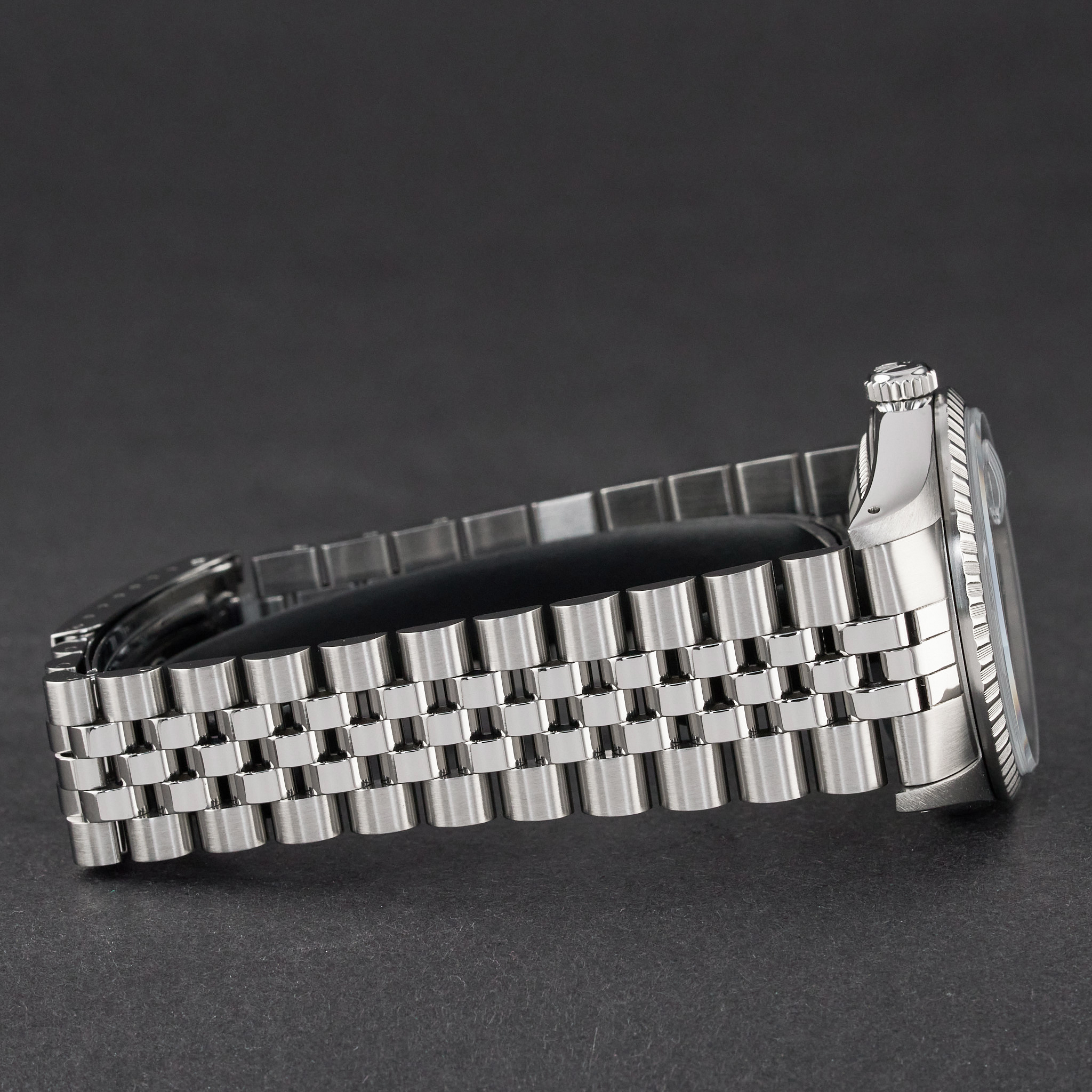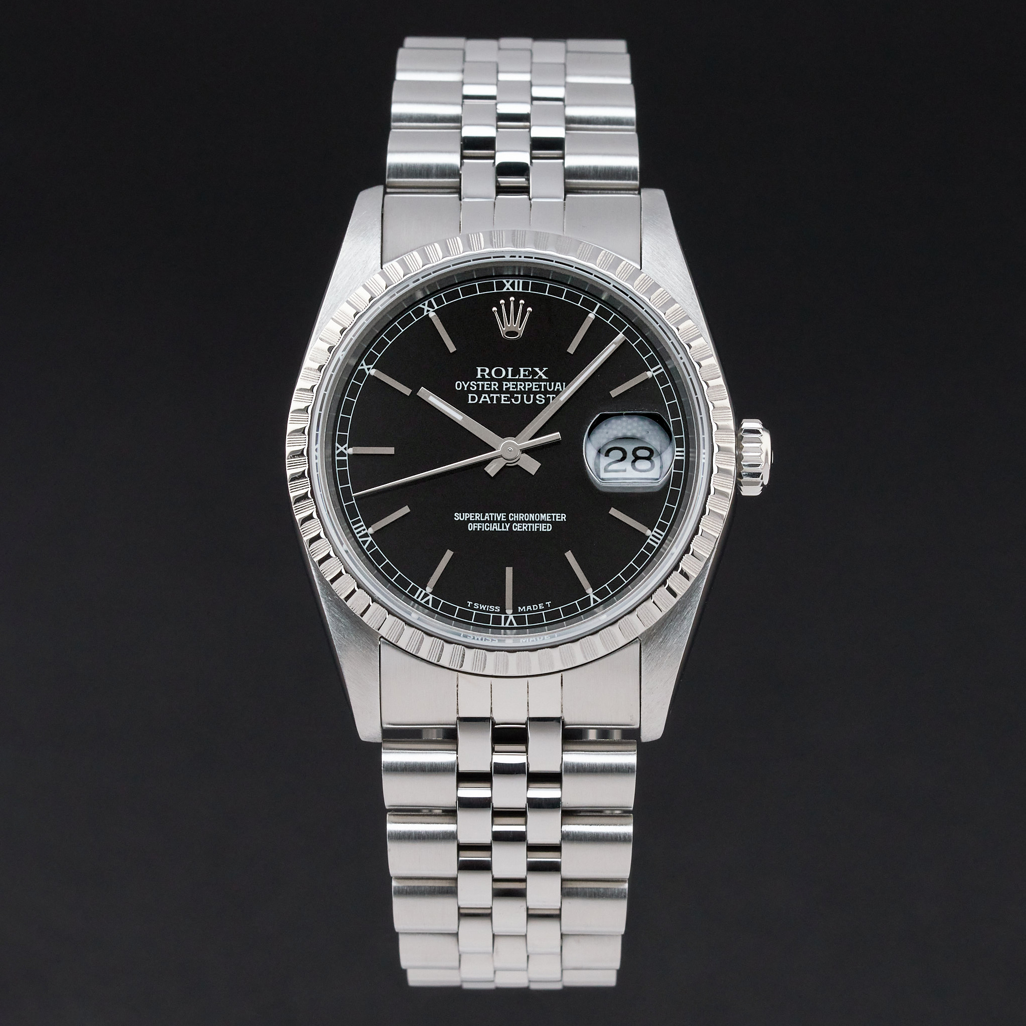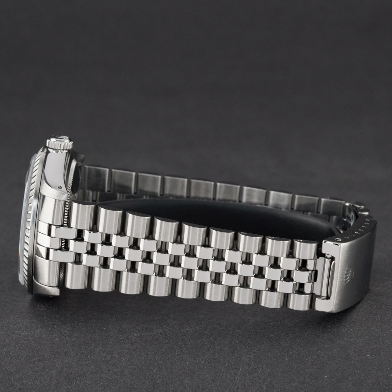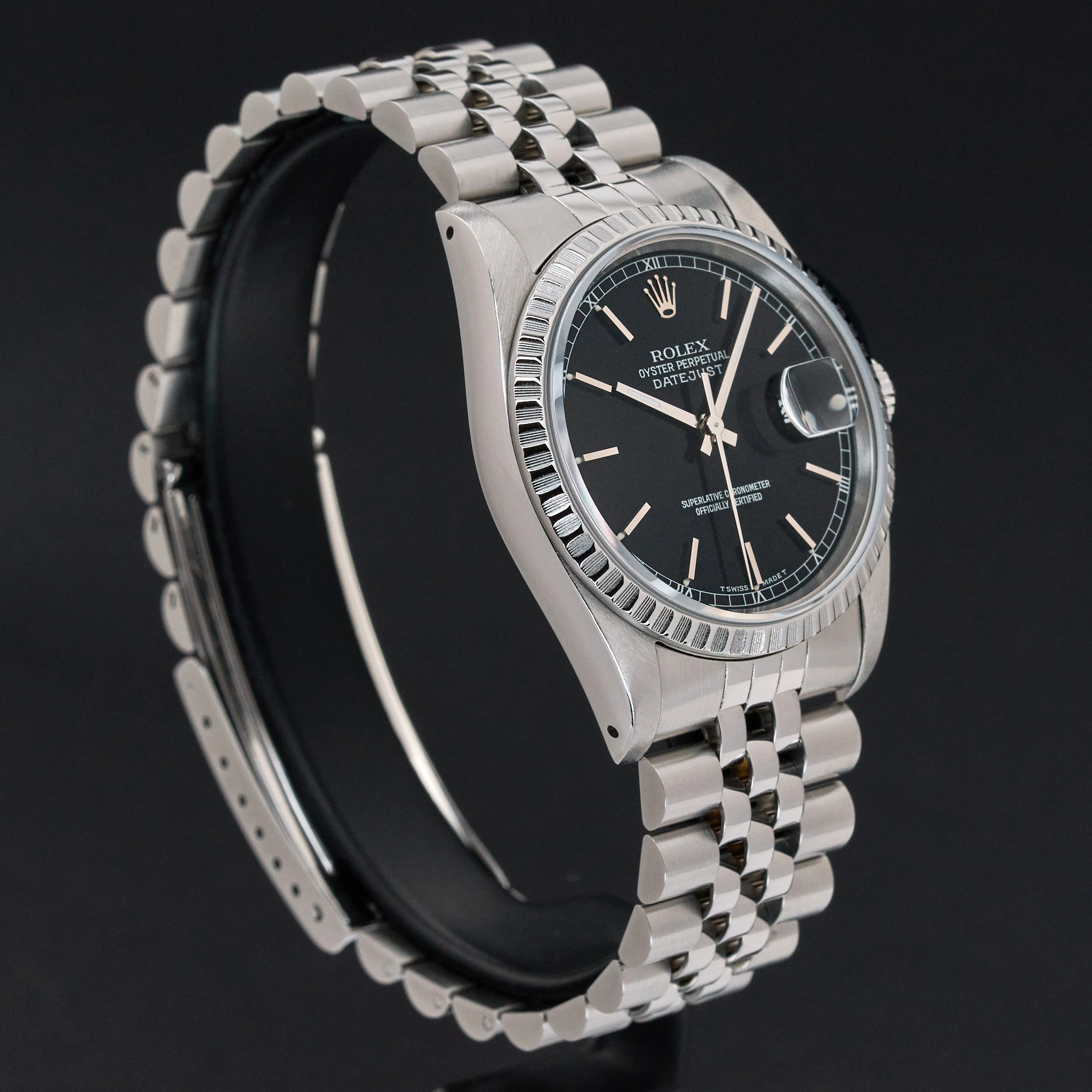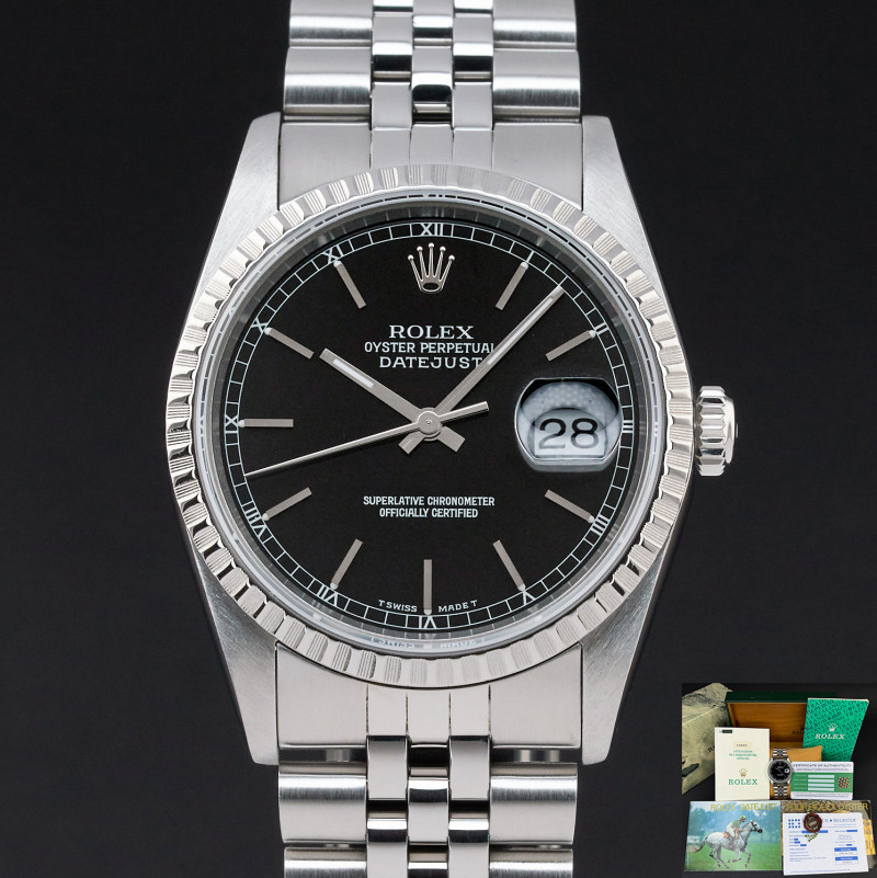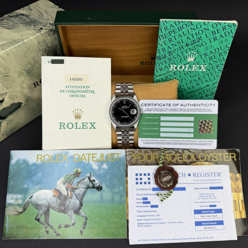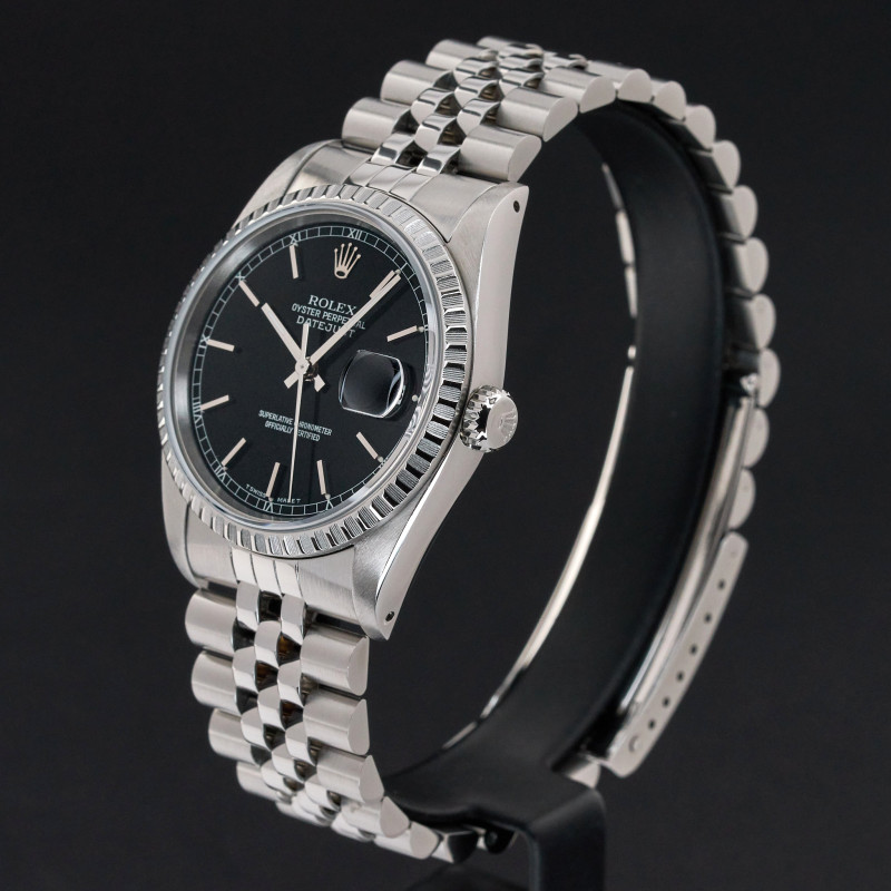 This Rolex Datejust 16220 features a Black dial and is crafted from stainless steel, with a production year of 1989.