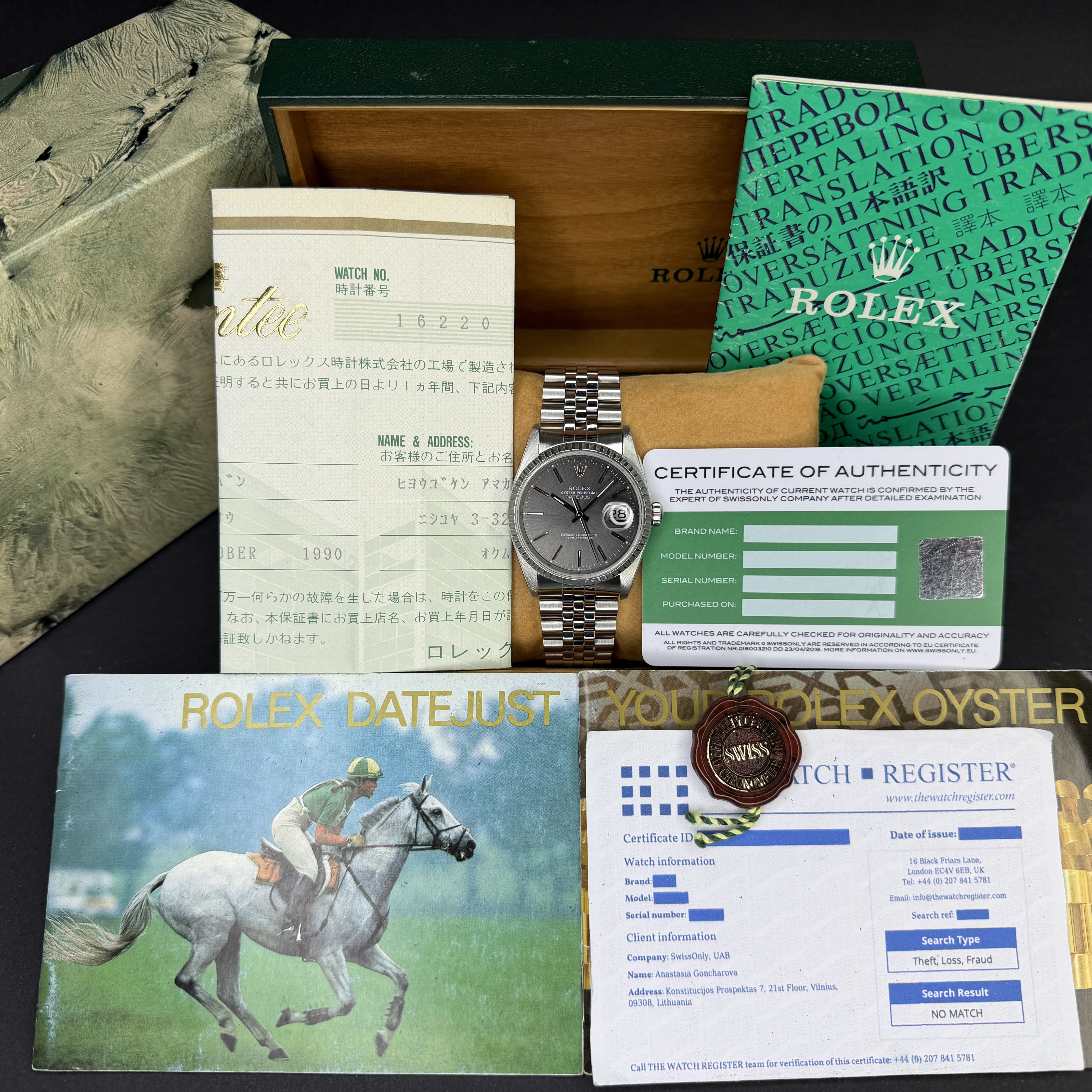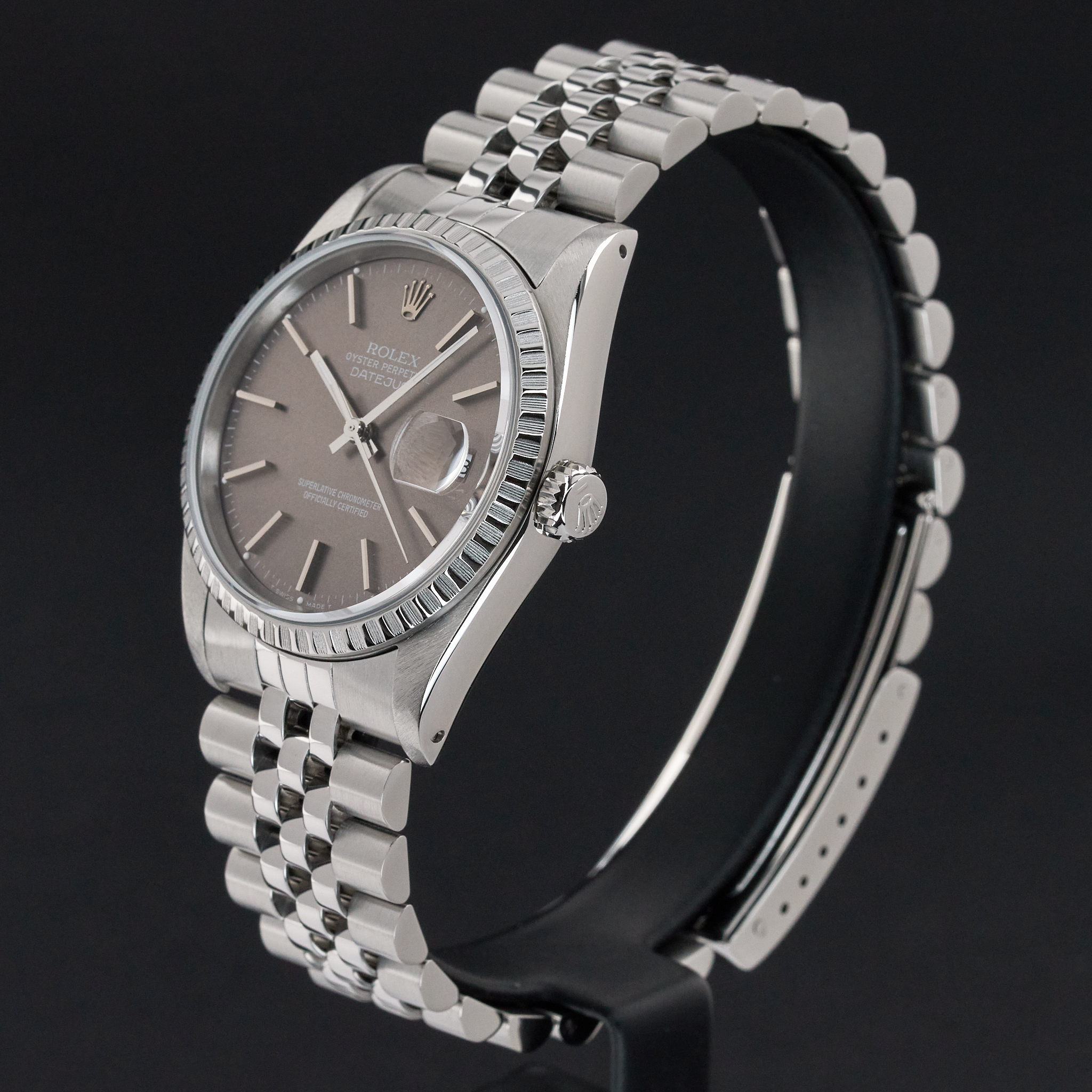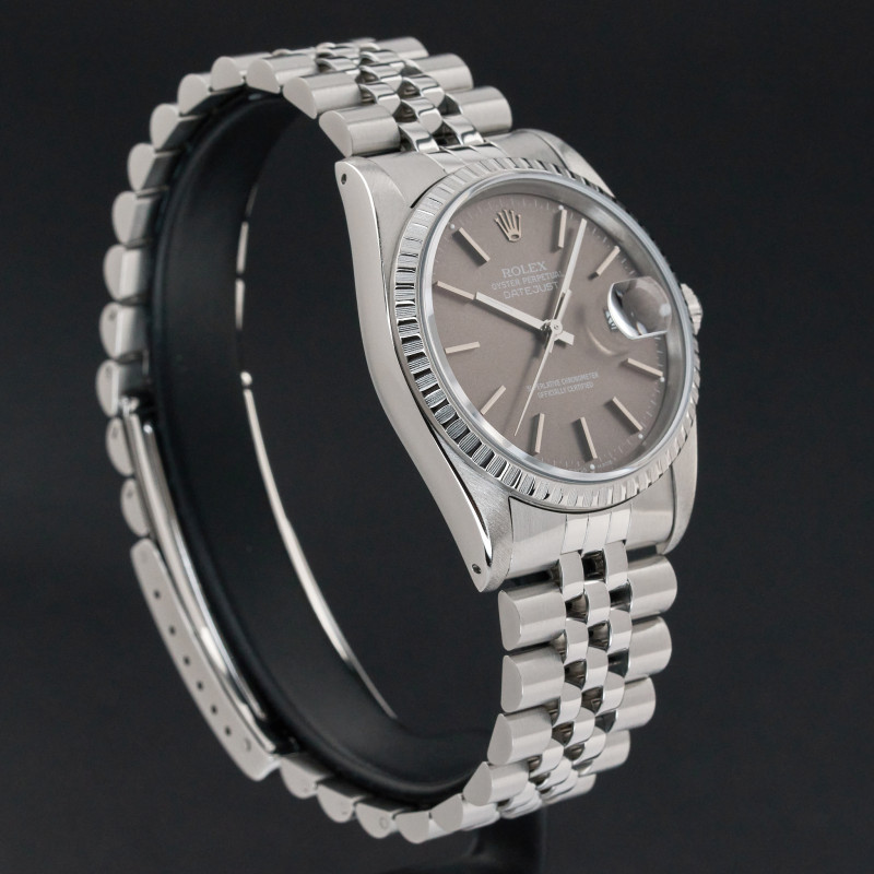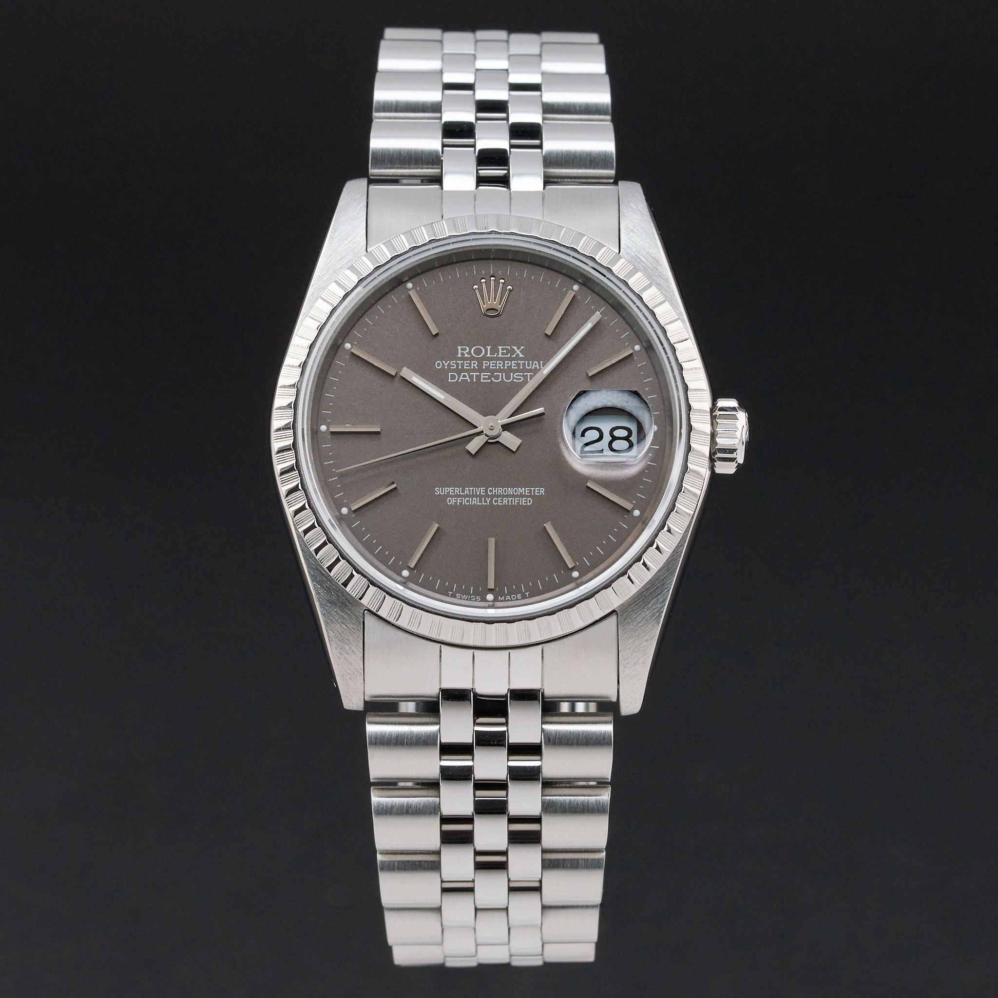 This Rolex Datejust 16220 features a Grey dial and is crafted from stainless steel, with a production year of 1989.