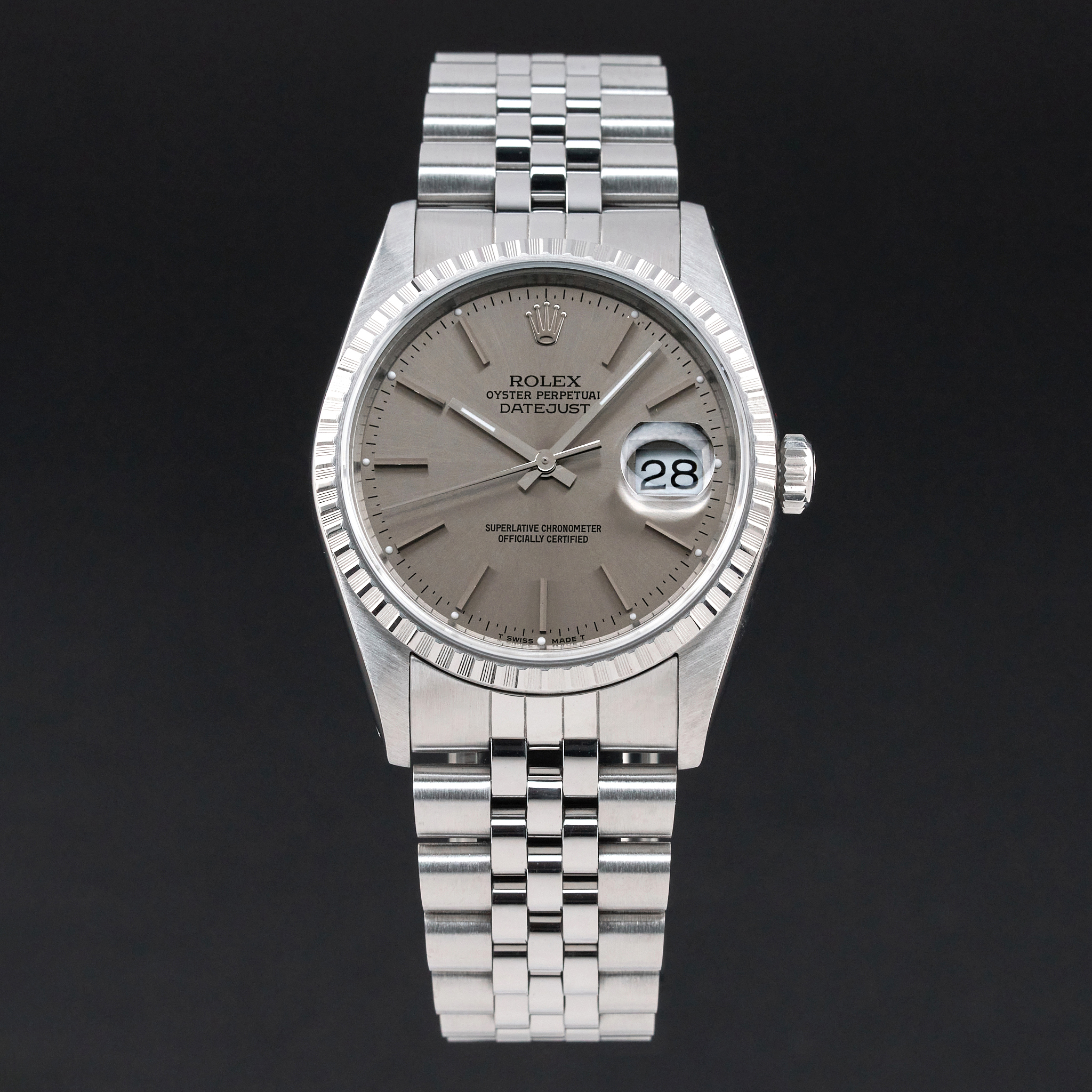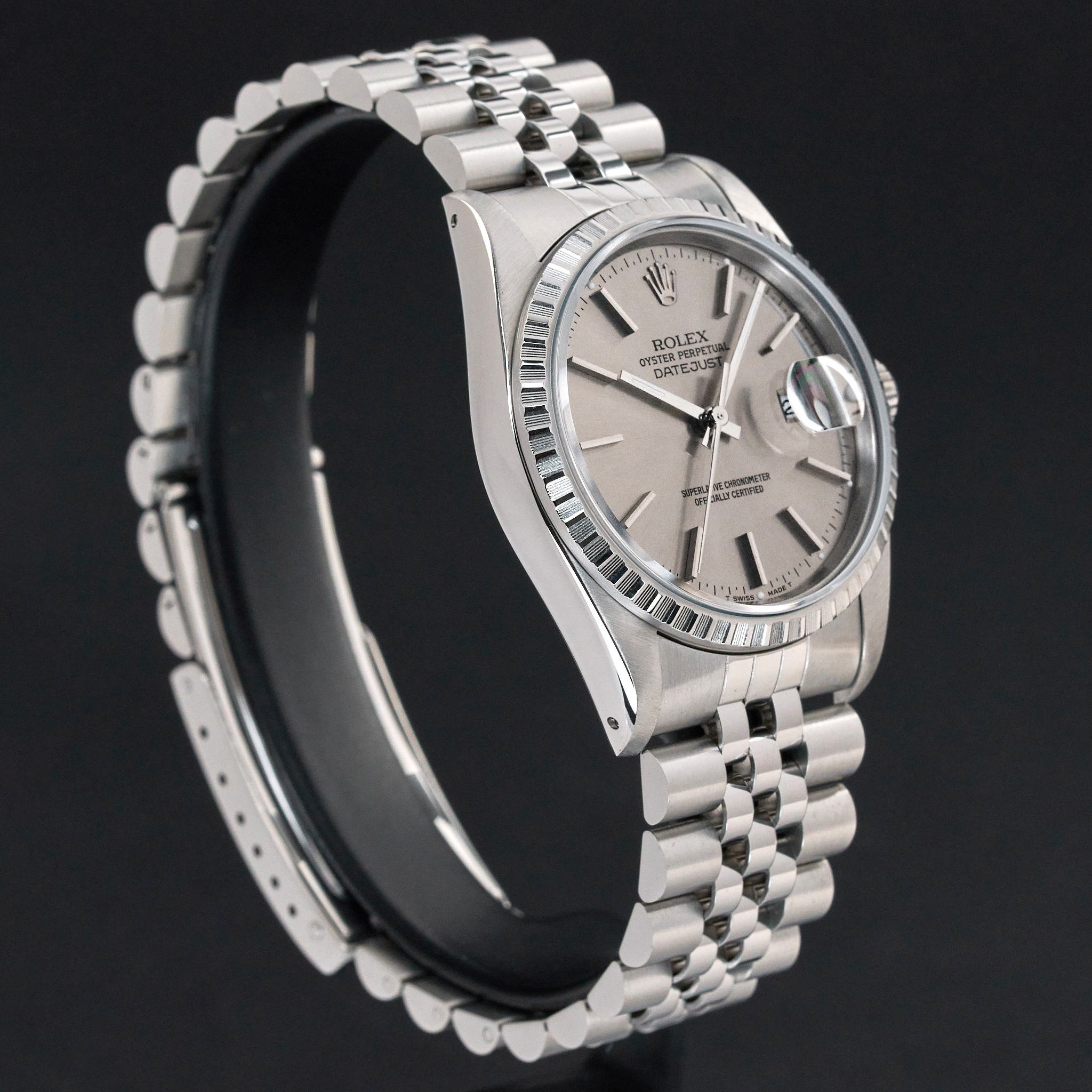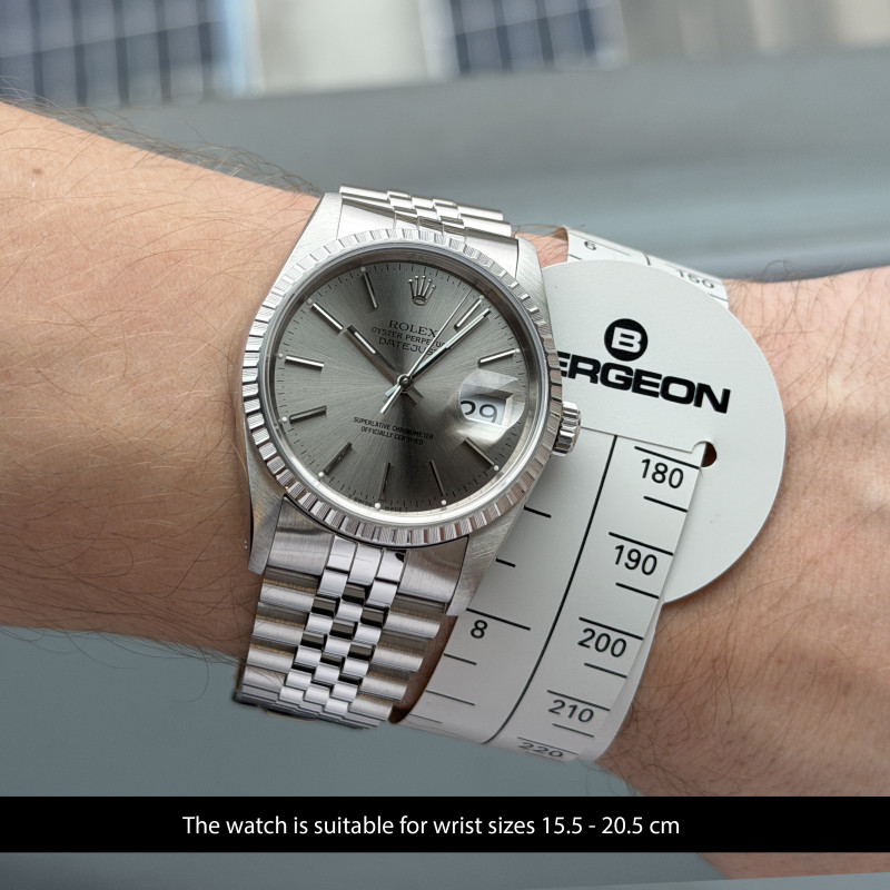 This Rolex Datejust 16220 features a Grey dial and is crafted from stainless steel, with a production year of 1989.