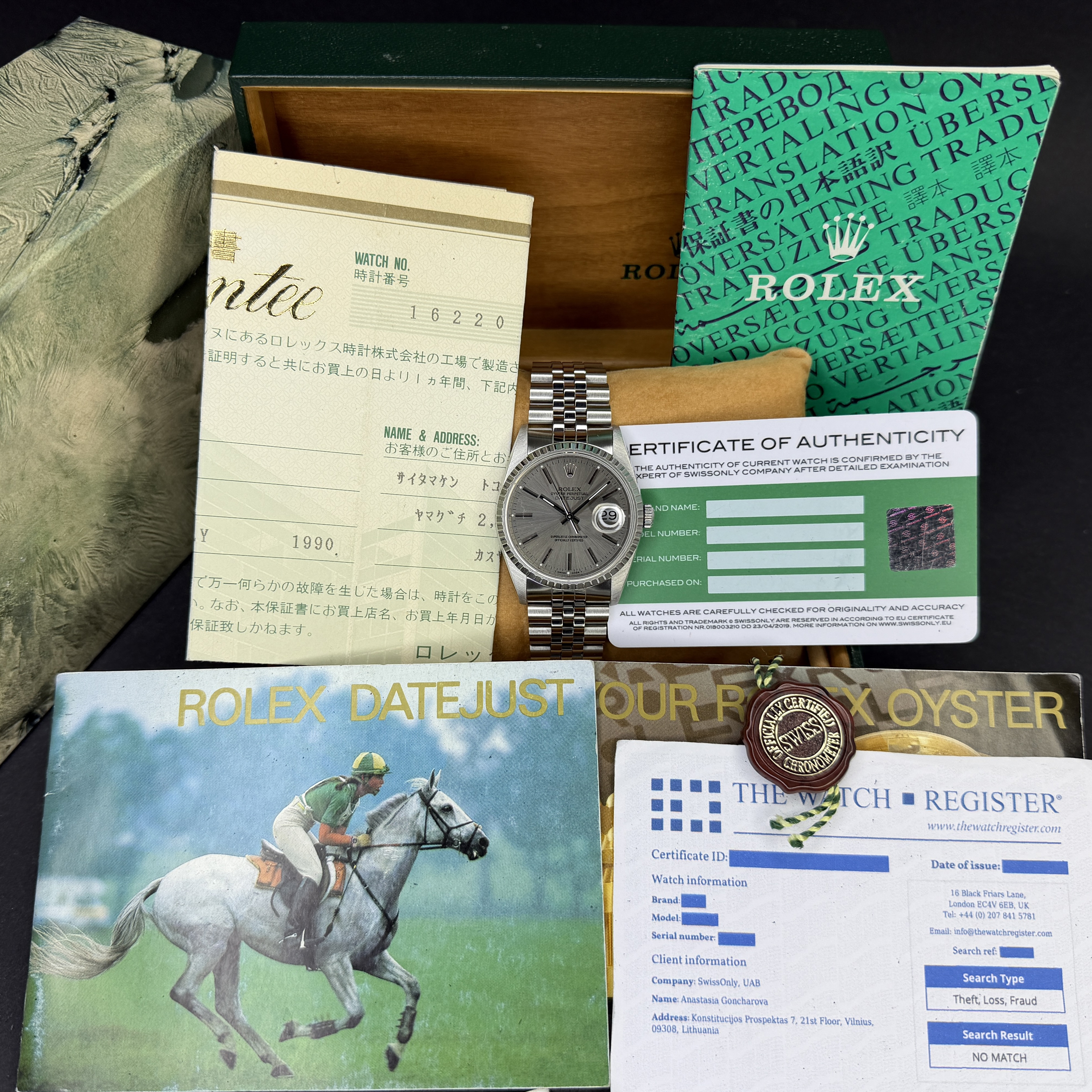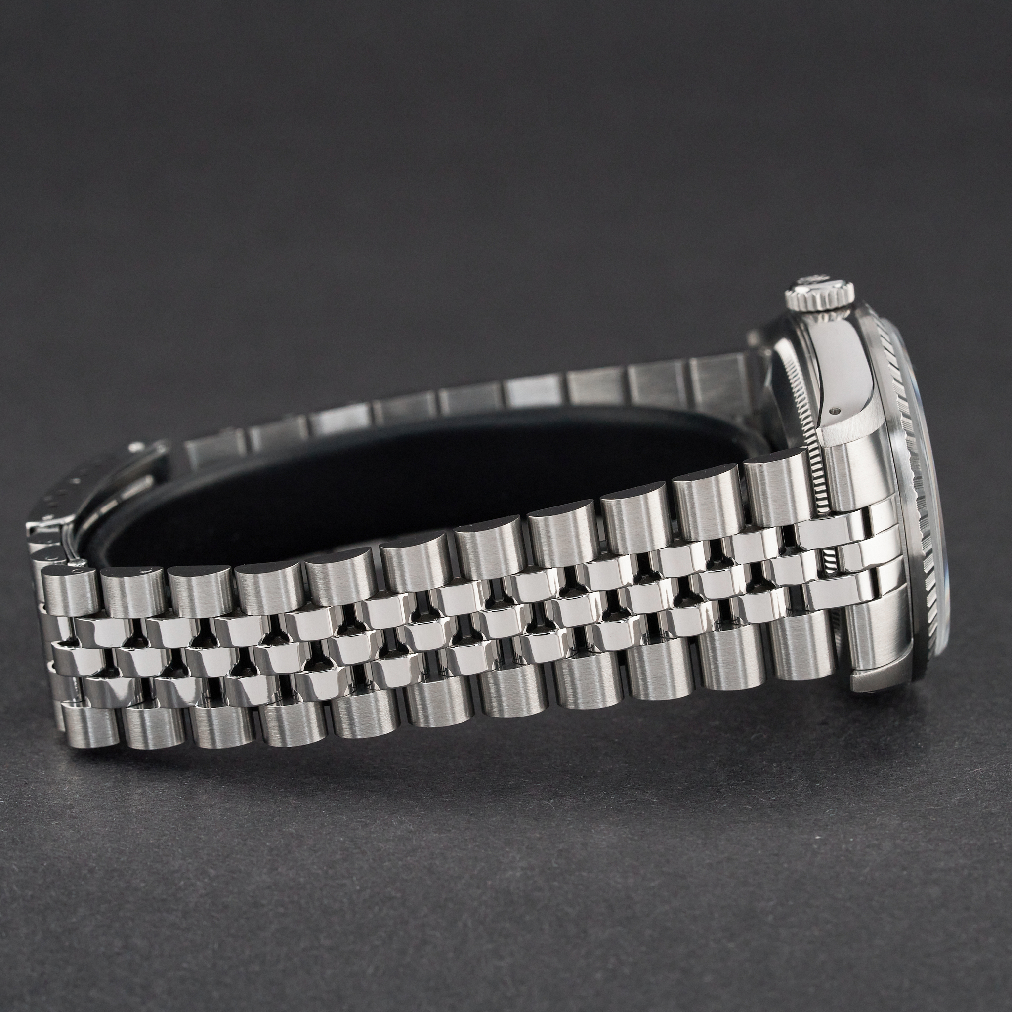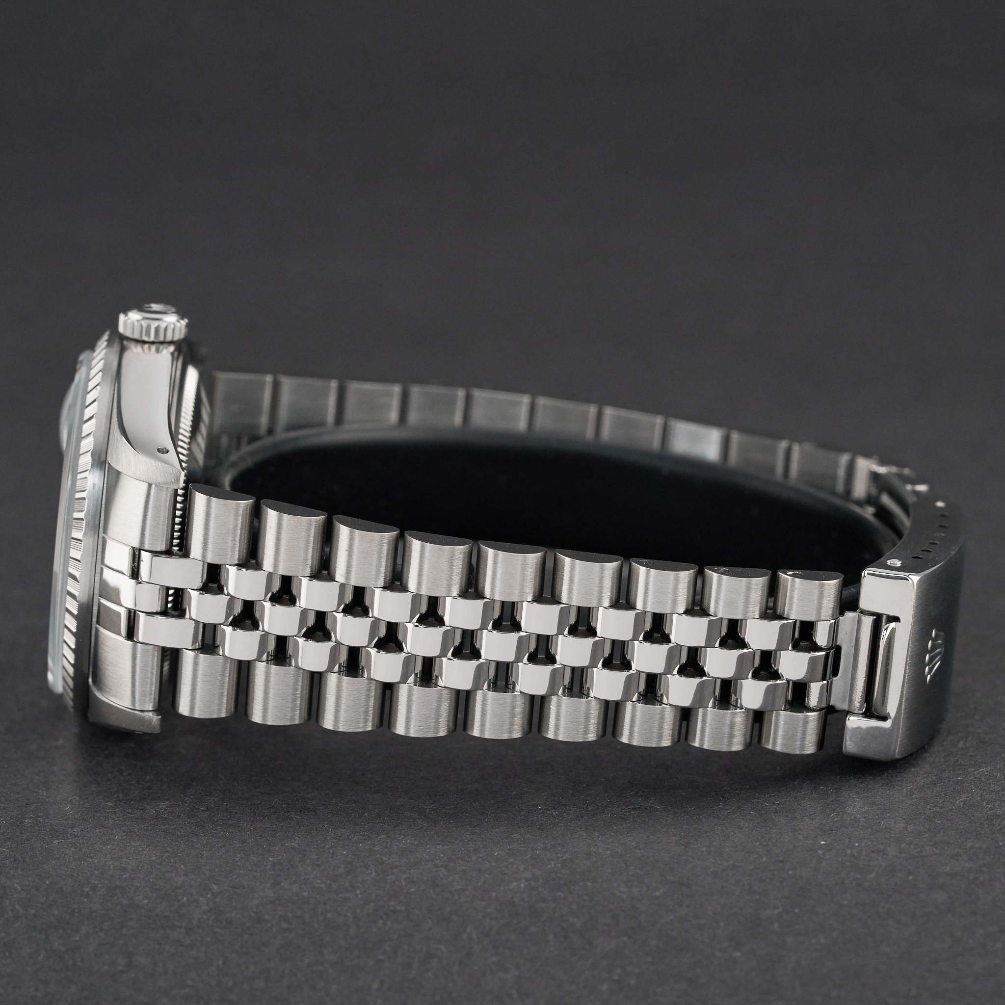 This Rolex Datejust 16220 features a Grey dial and is crafted from stainless steel, with a production year of 1989.