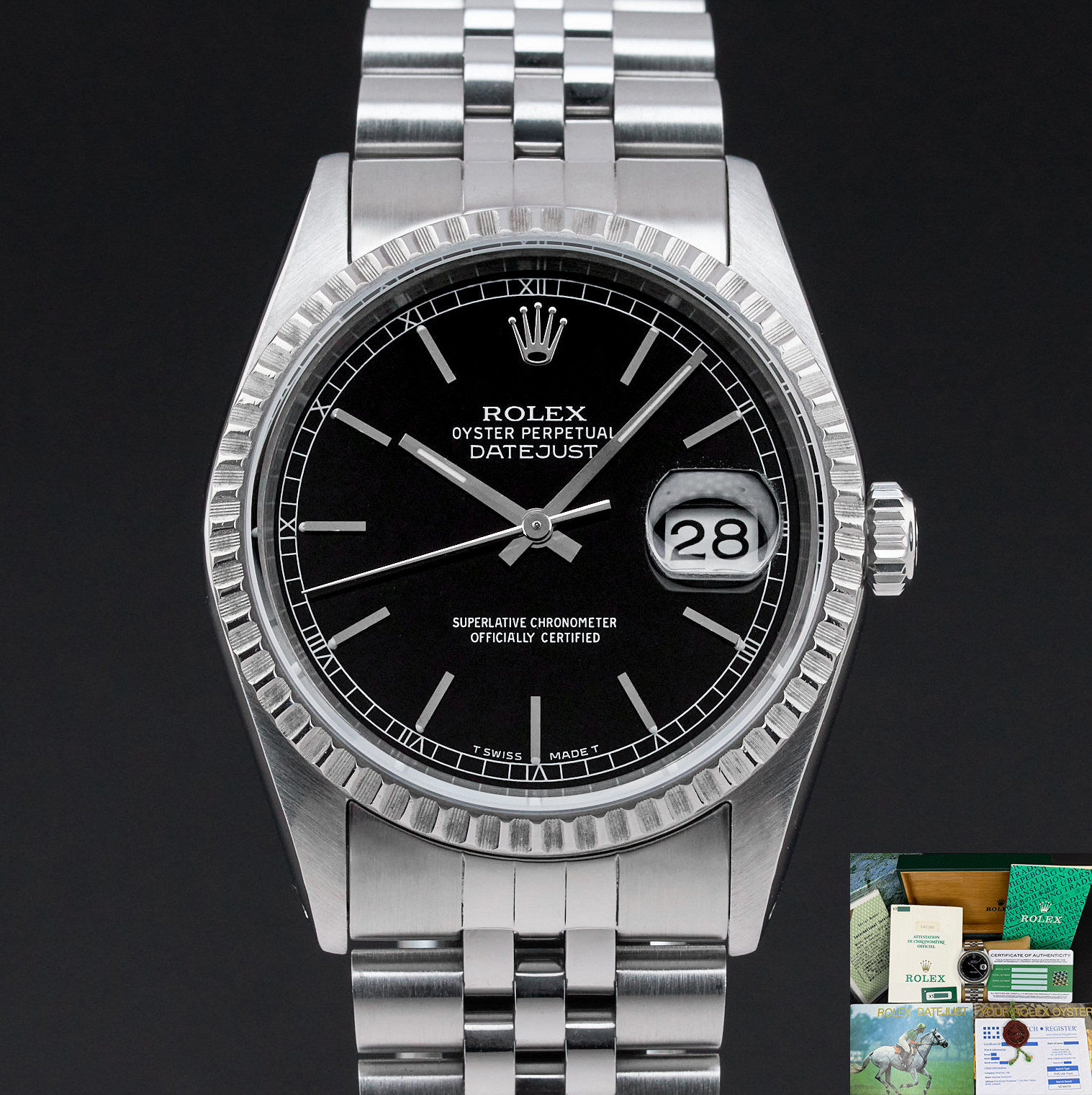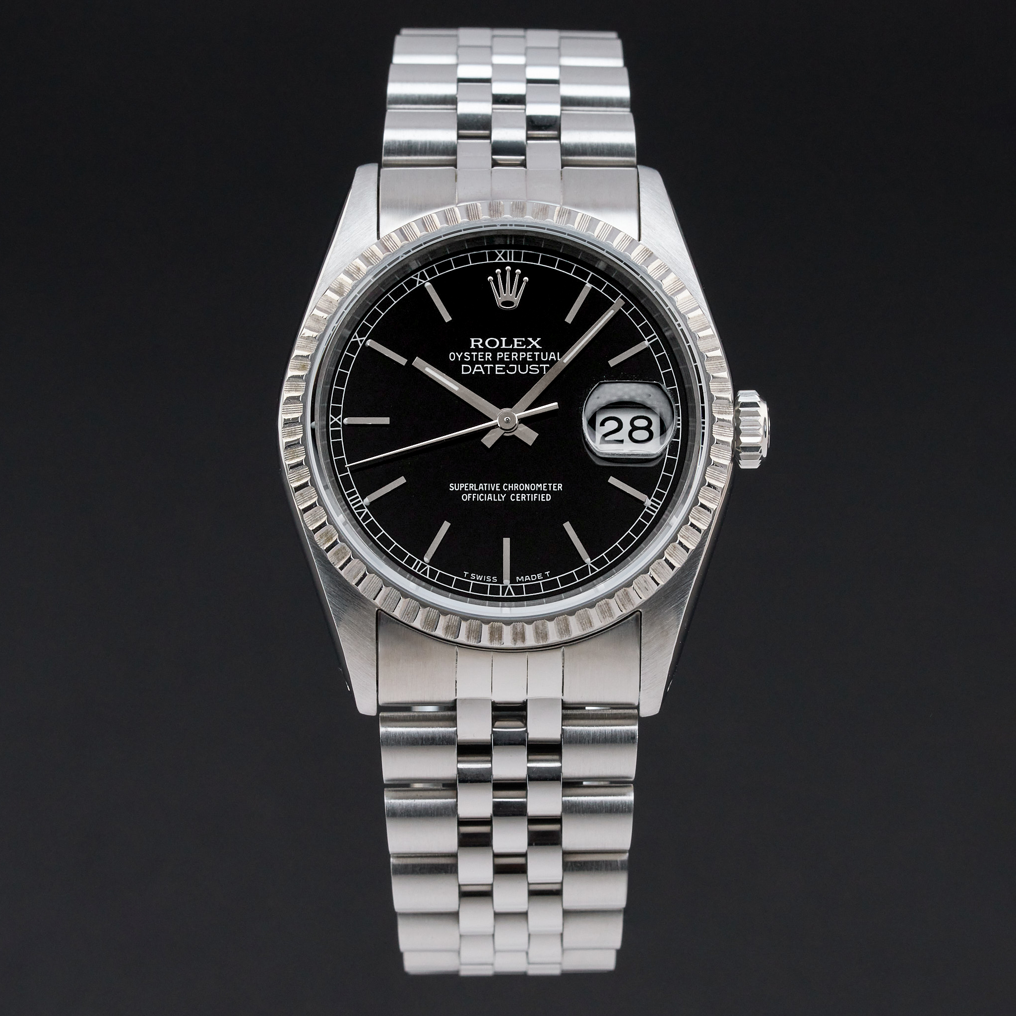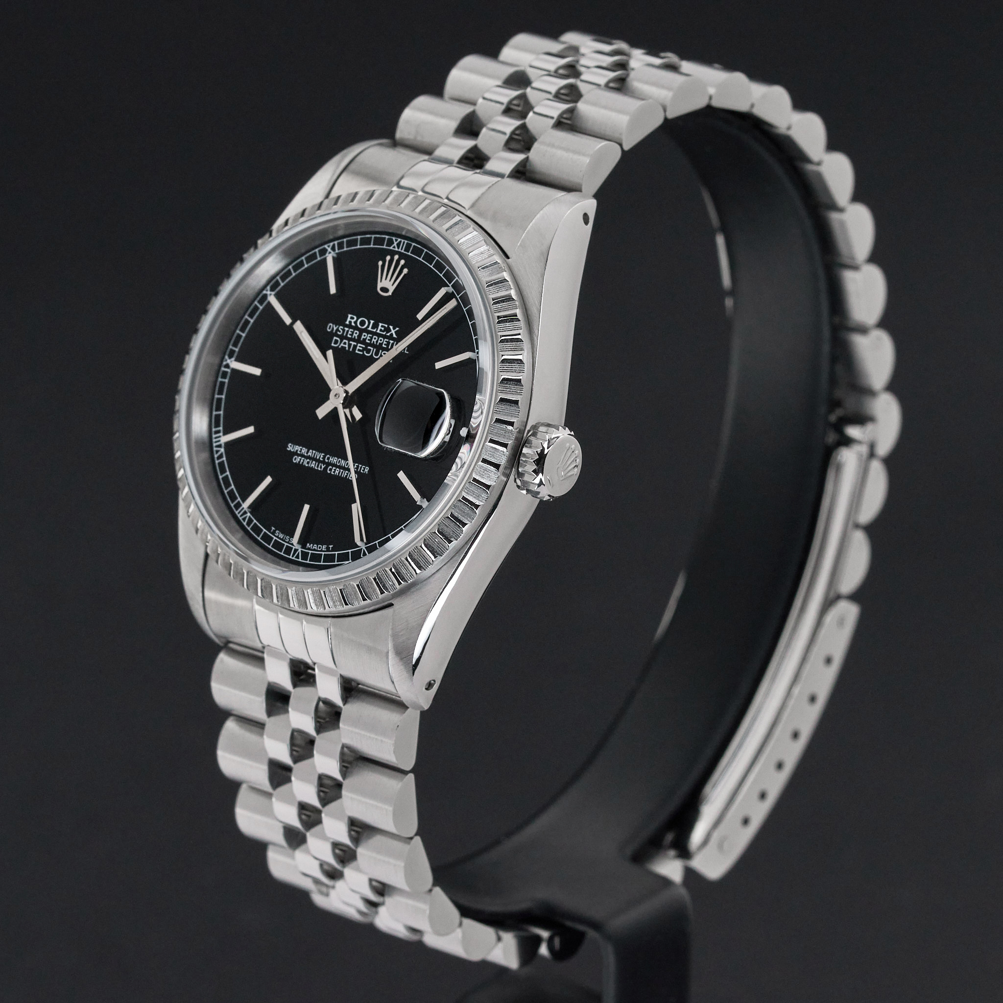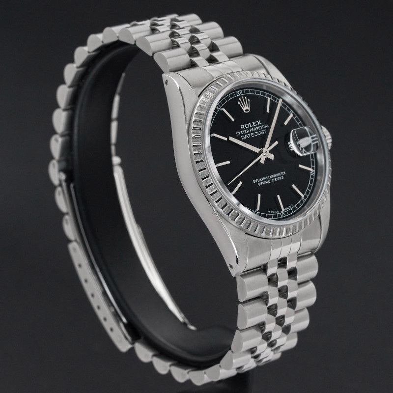 This Rolex Datejust 16220 features a Black dial and is crafted from stainless steel, with a production year of 1991.