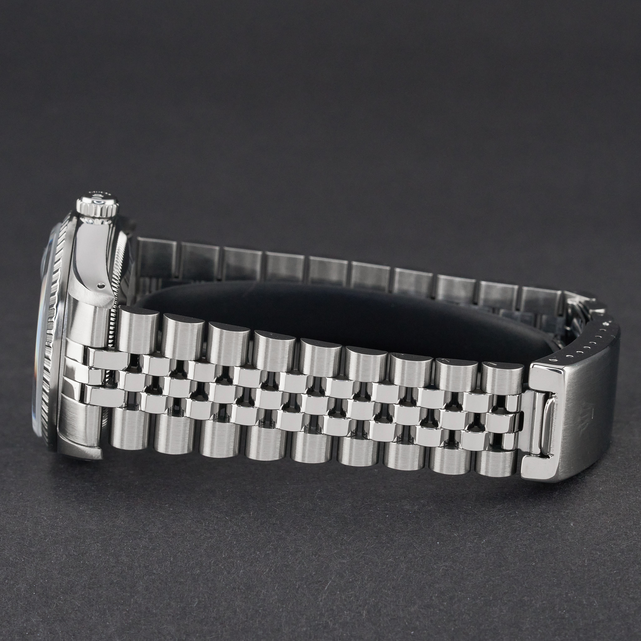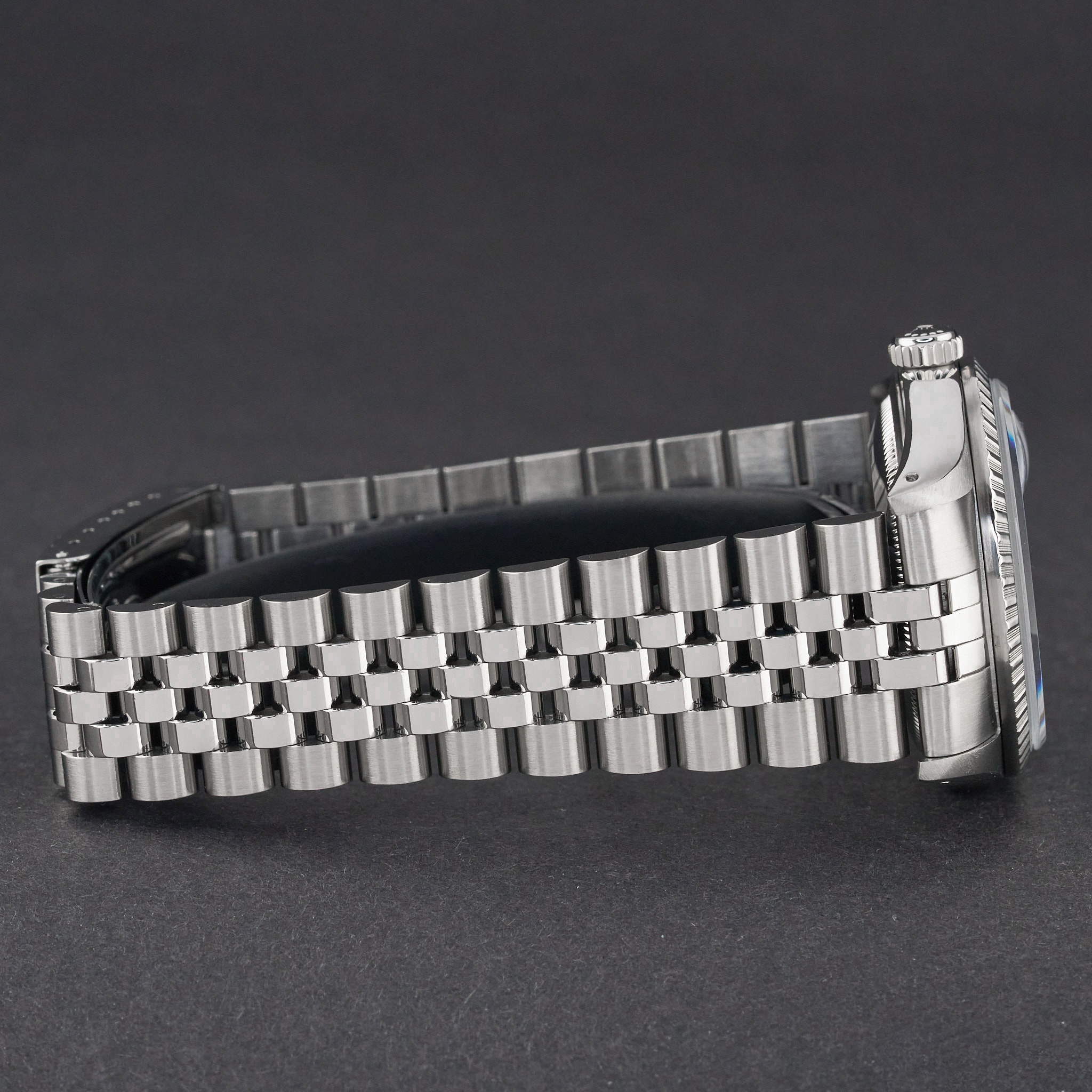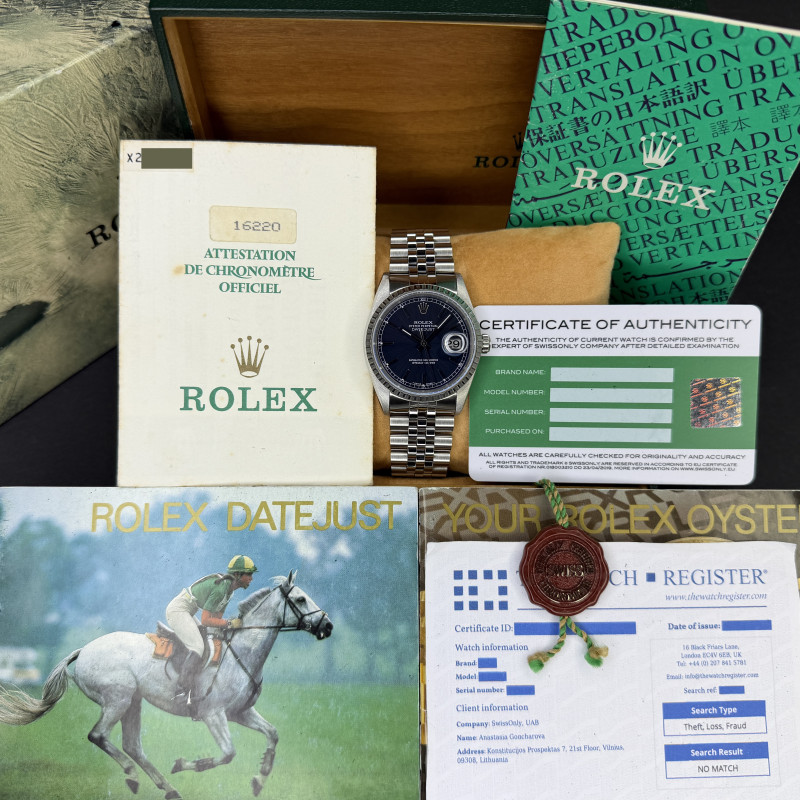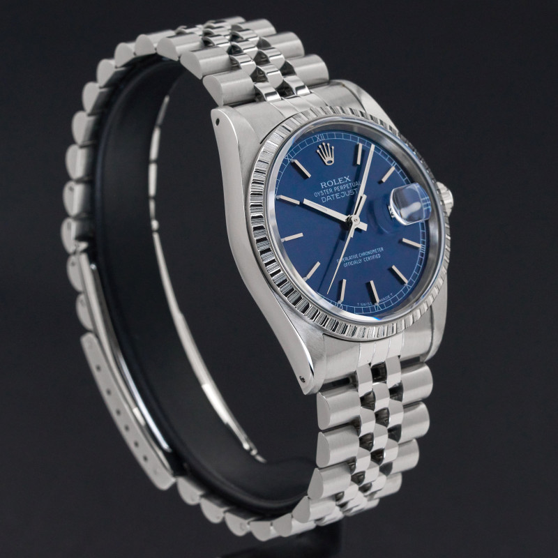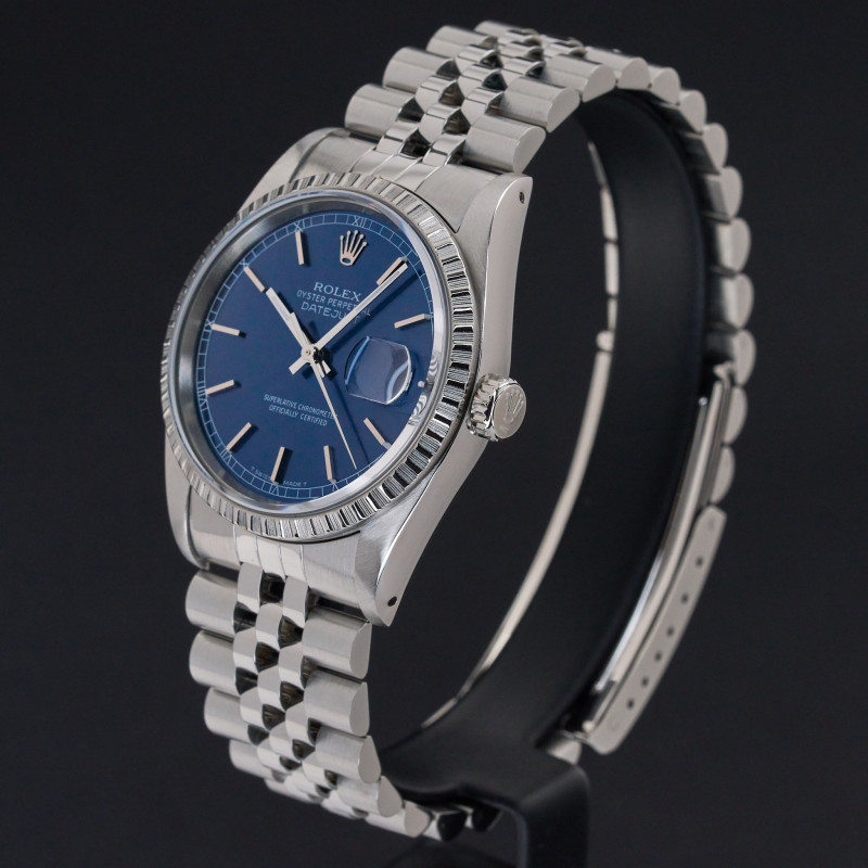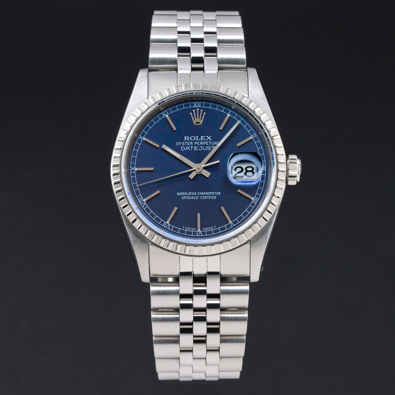 This Rolex Datejust 16220 features a Blue dial and is crafted from stainless steel, with a production year of 1991.