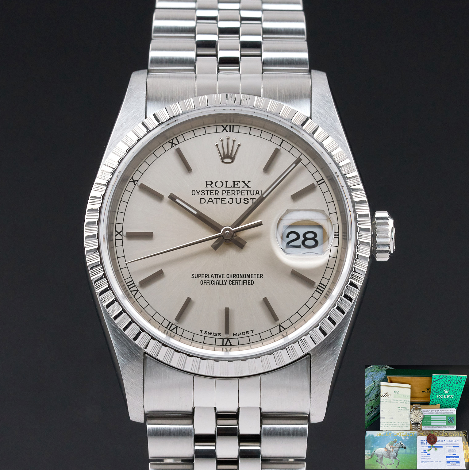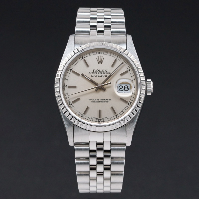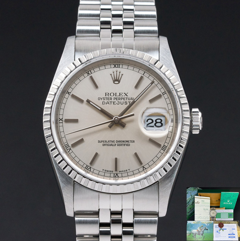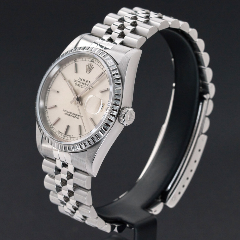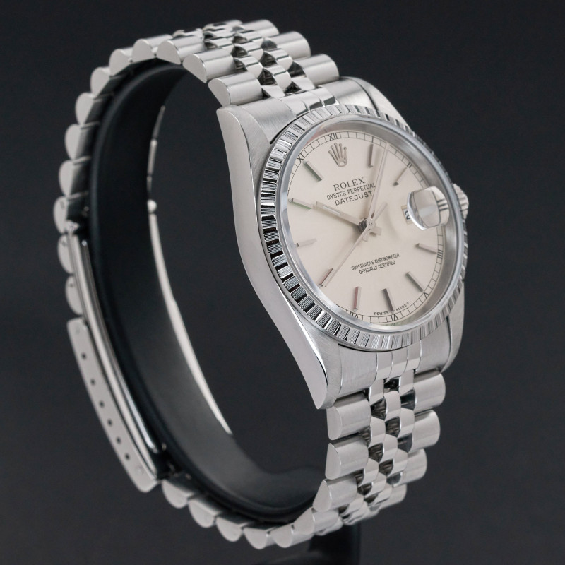 This Rolex Datejust 16220 features a Silver dial and is crafted from stainless steel, with a production year of 1994.