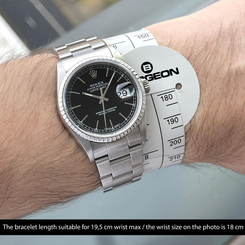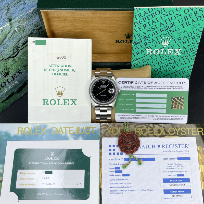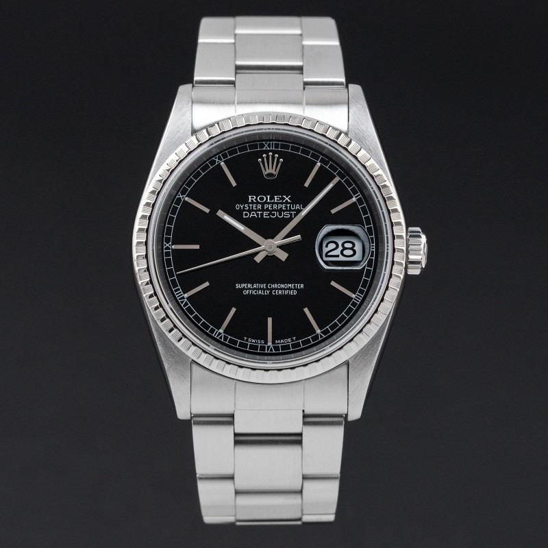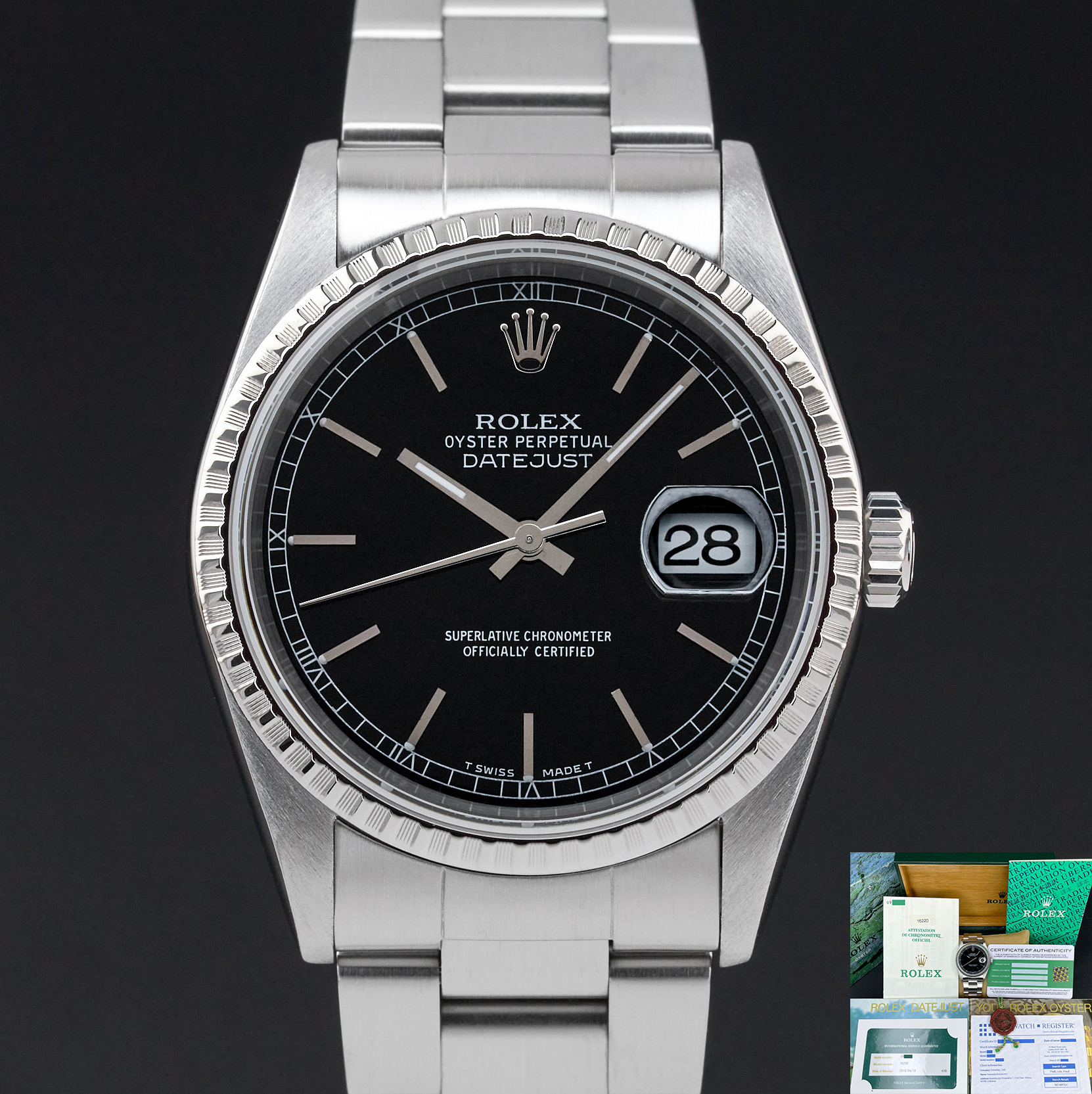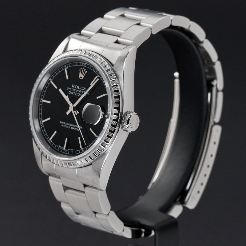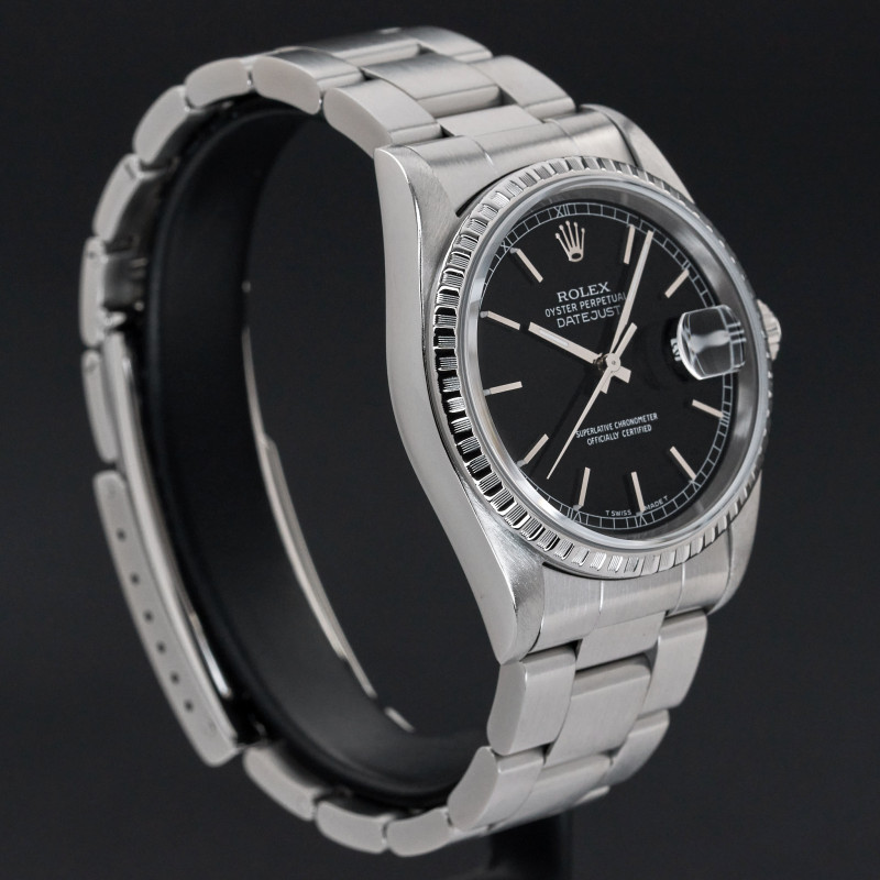 This Rolex Datejust 16220 features a Black dial and is crafted from stainless steel, with a production year of 1998.