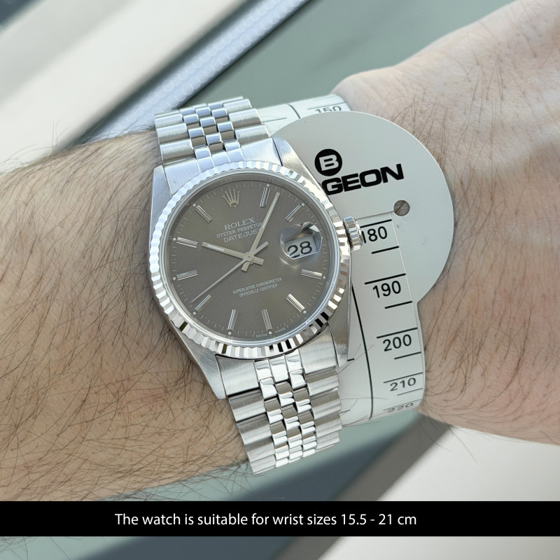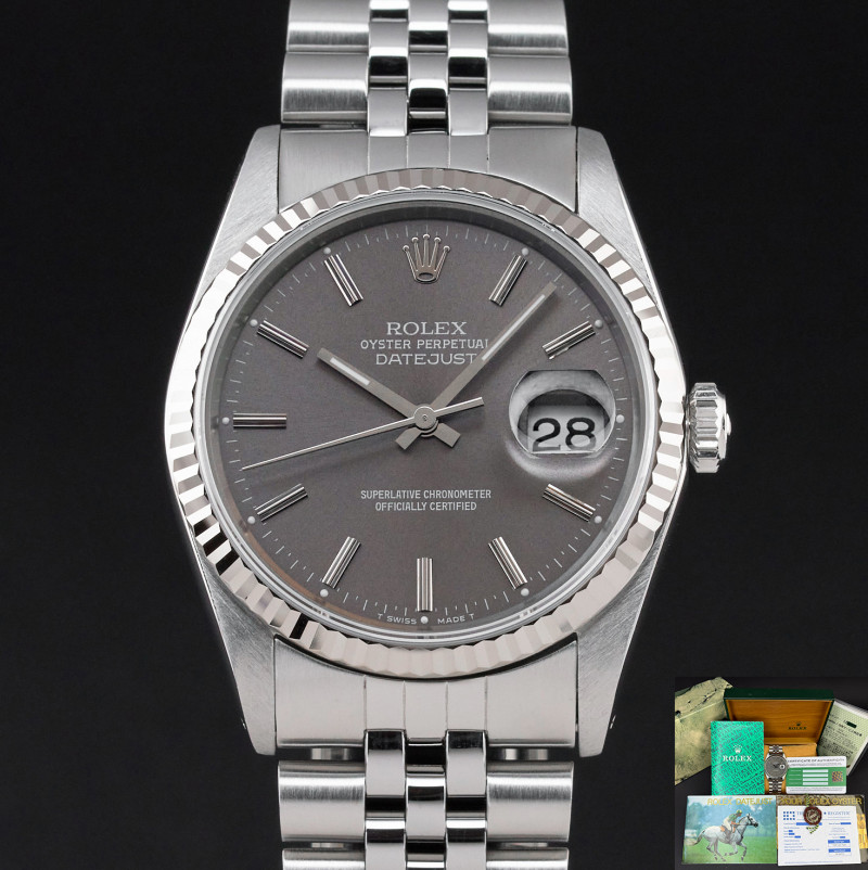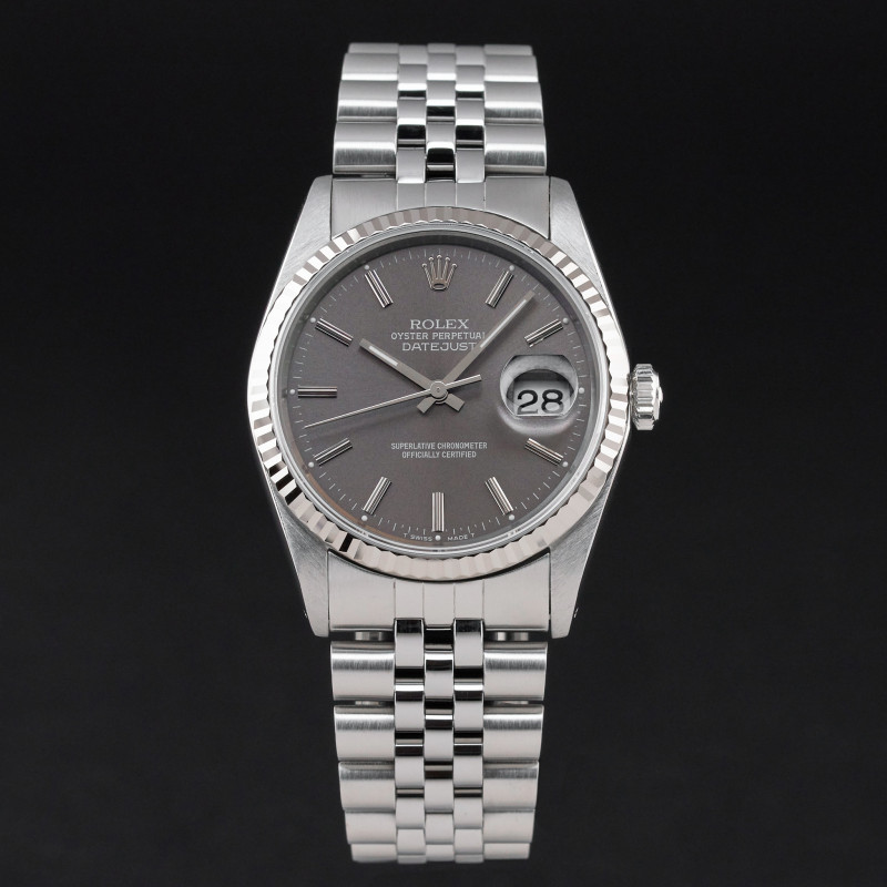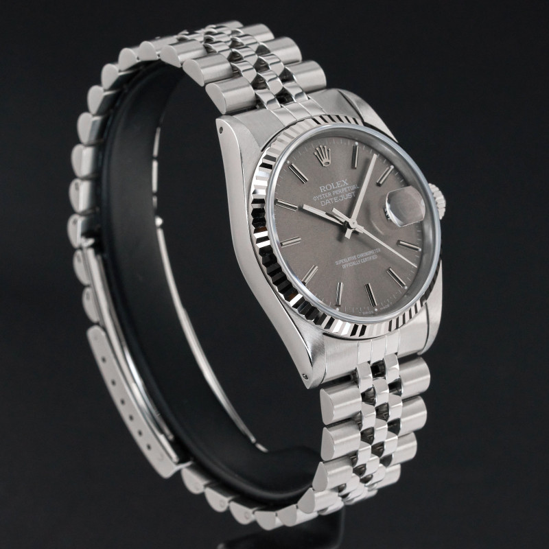 This Rolex Datejust 16234 features a Grey dial and is crafted from stainless steel, with a production year of 1989.