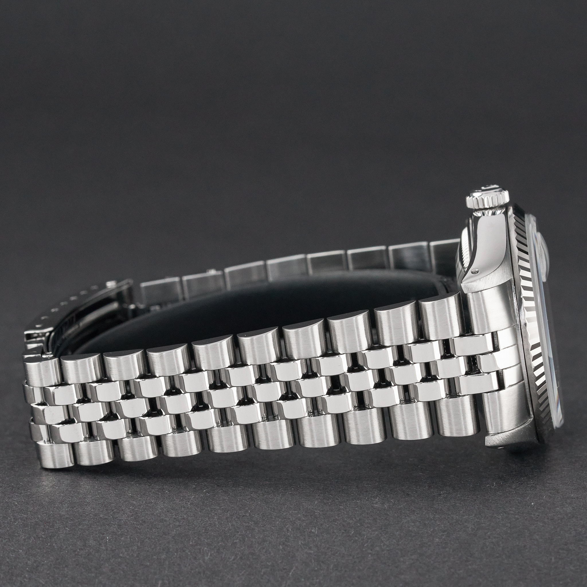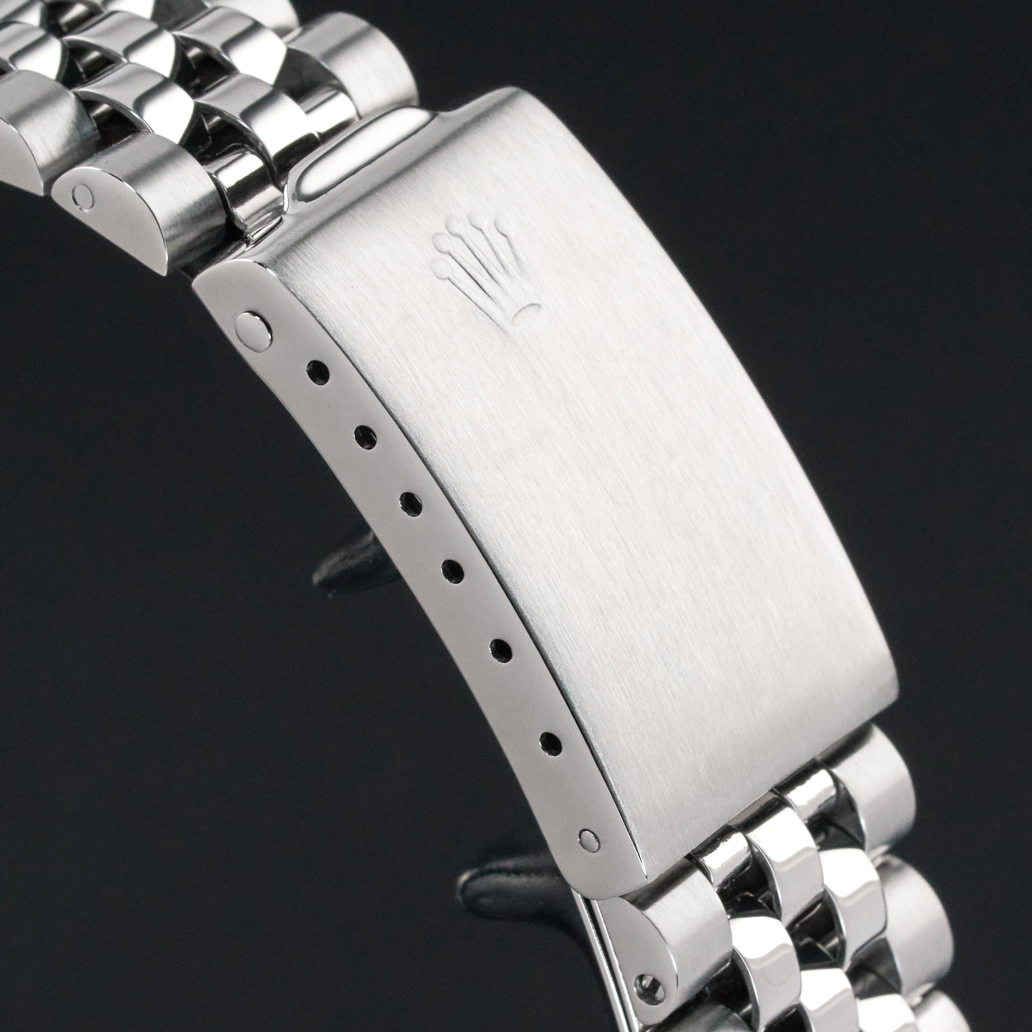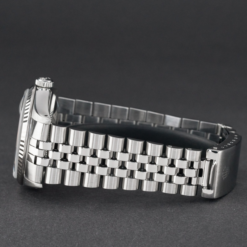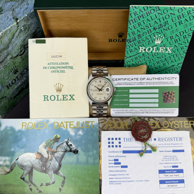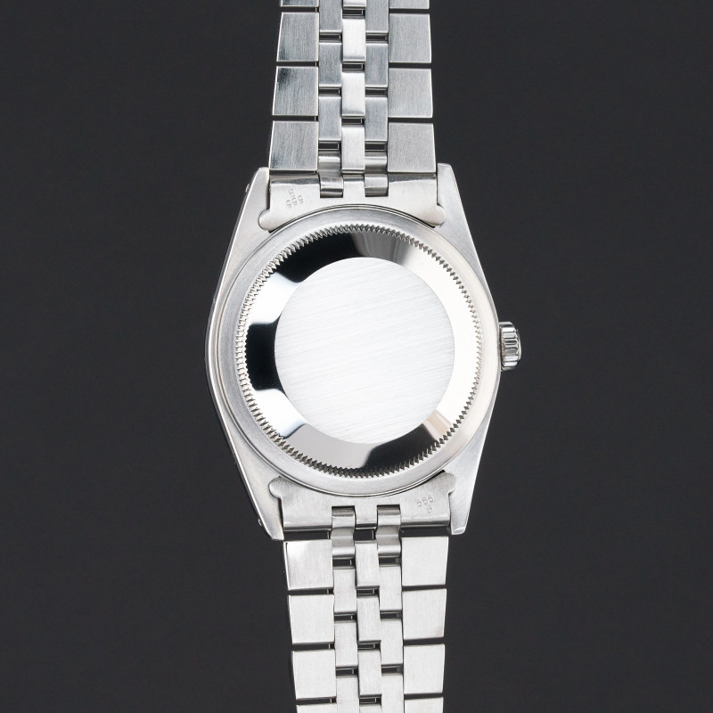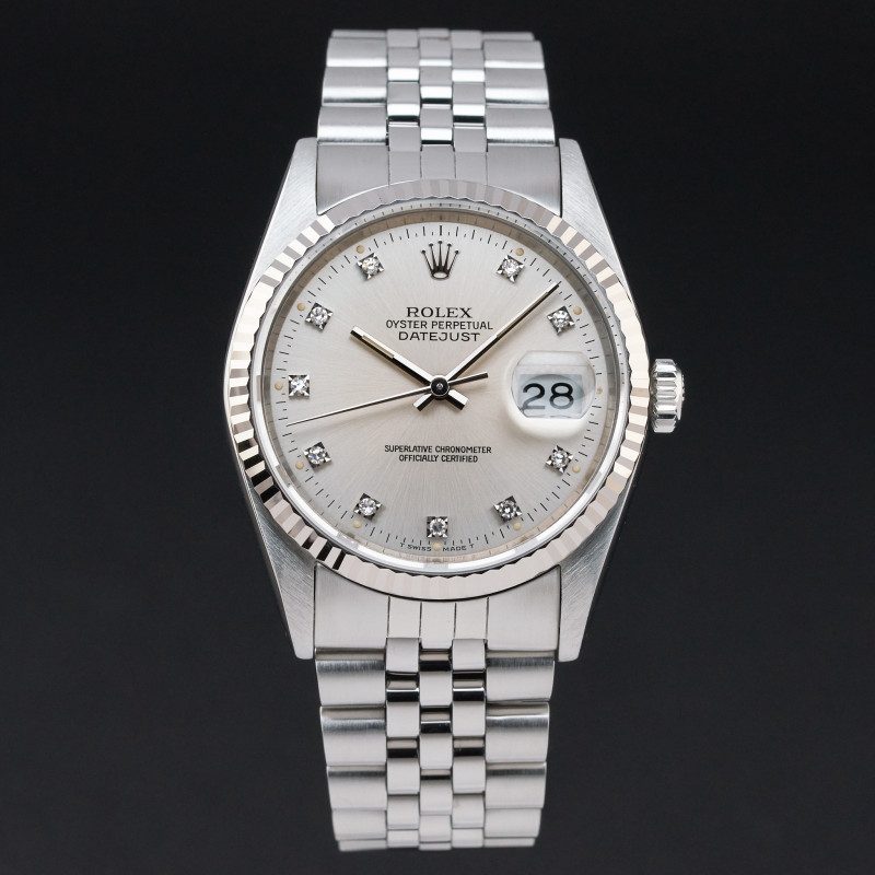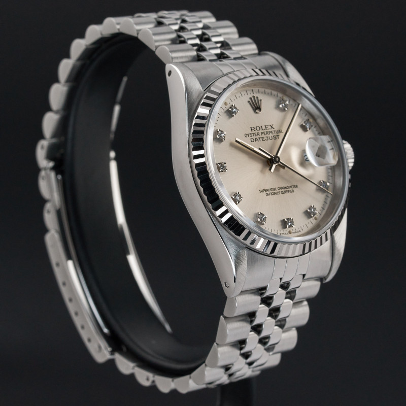 This Rolex Datejust 16234 features a Silver small diamond dial and is crafted from stainless steel, with a production year of 1989.