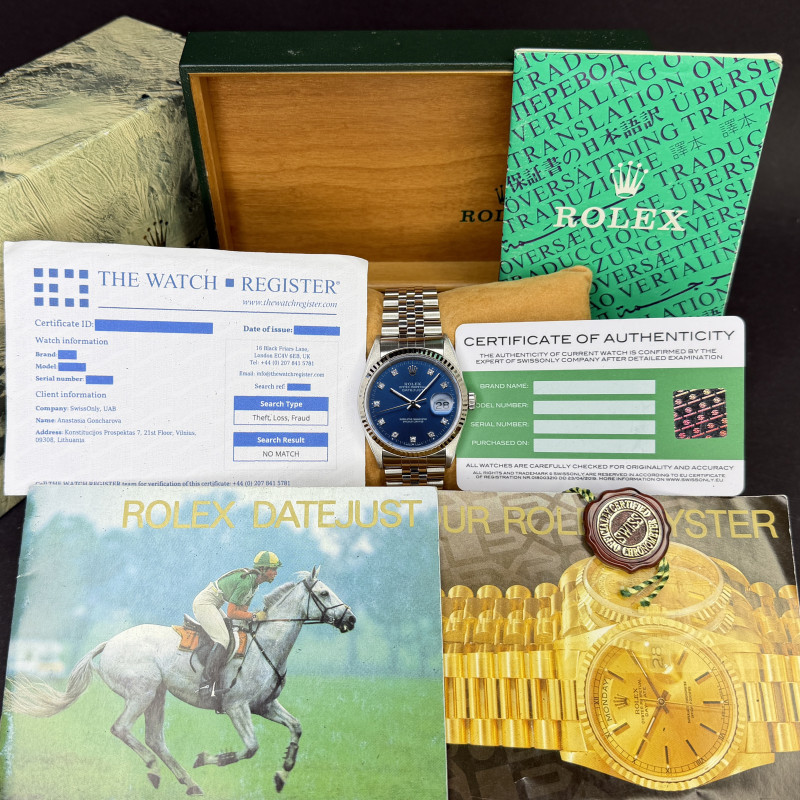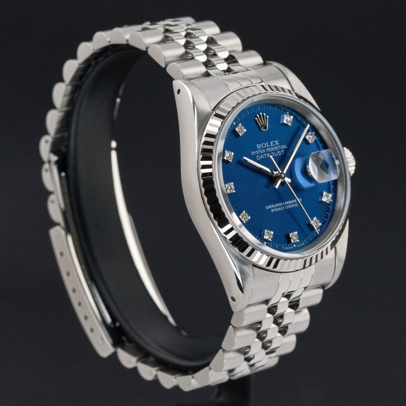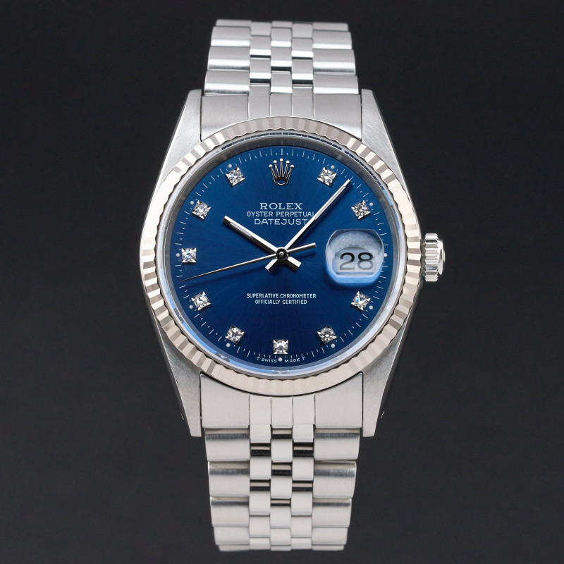 This Rolex Datejust 16234 features a Blue small diamond dial and is crafted from stainless steel, with a production year of 1990.